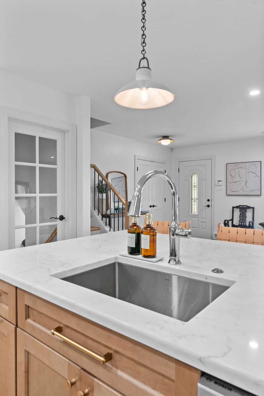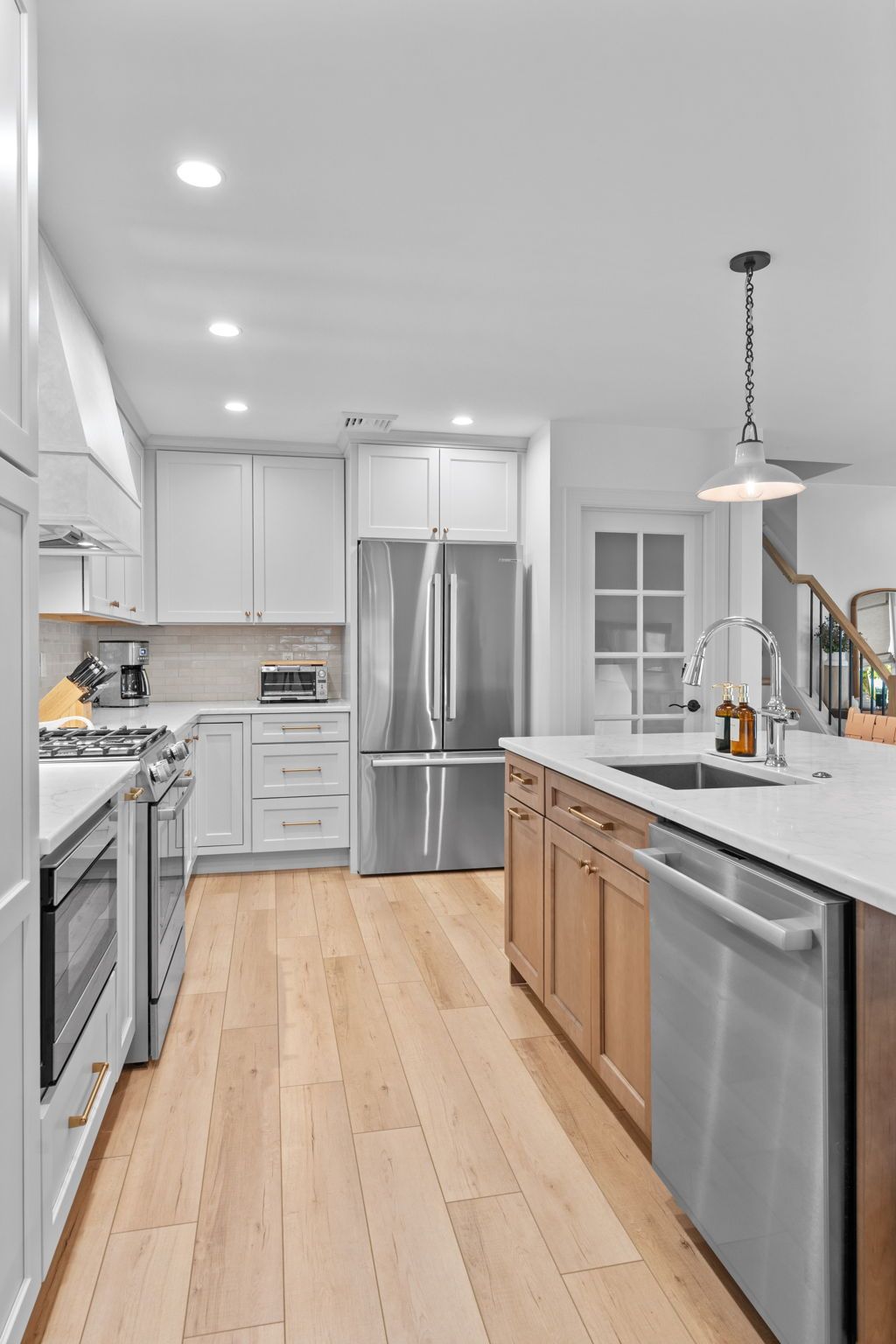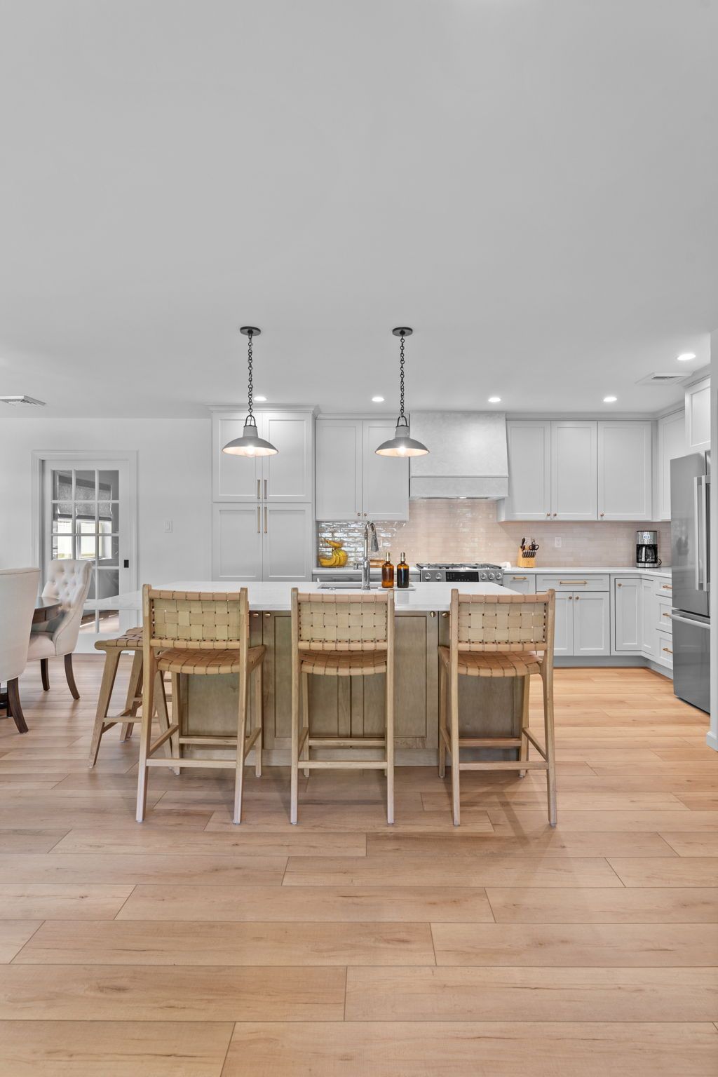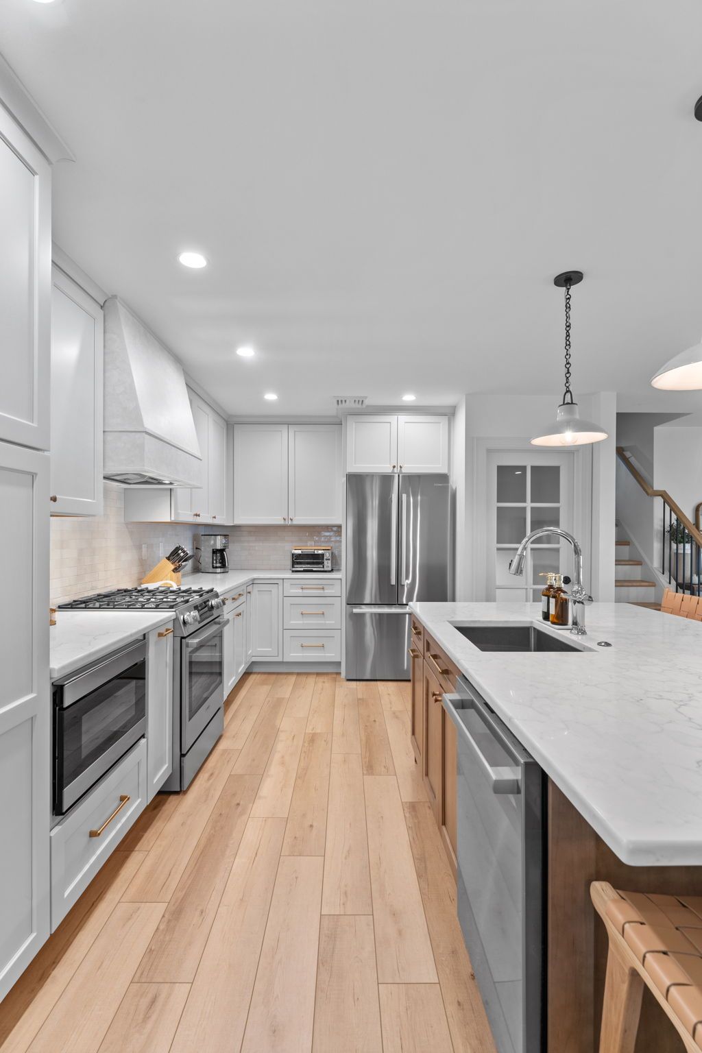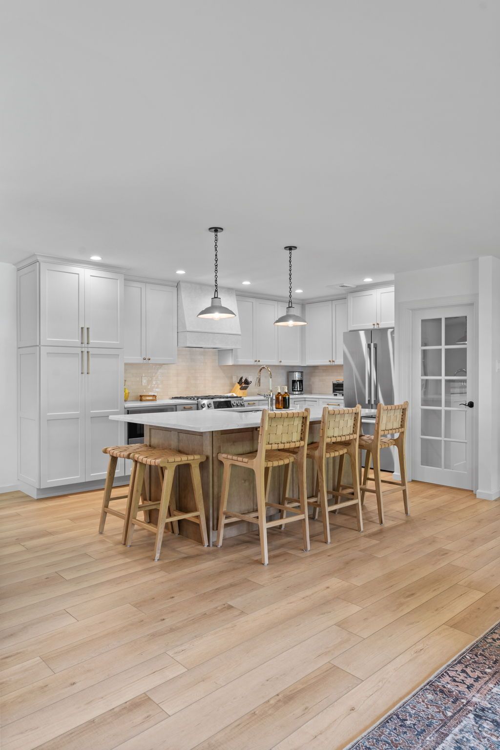 This minimalist kitchen cleanly combines whites and light natural wood tones to create an inviting space. This client chose to use their own contractor but sourced their cabinetry through Weiler's. The cabinets are all Wellborn, MDF painted alabaster for the perimeter and maple wood stained river rock for the island. This kitchen turned out beautifully, we're glad we could help!