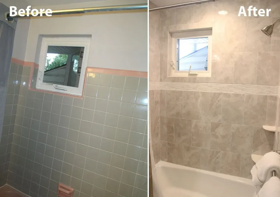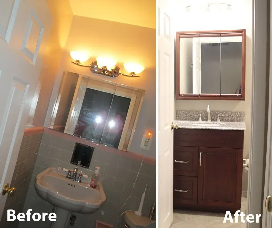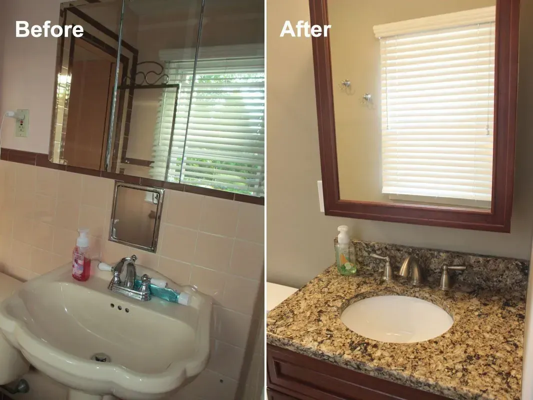 Before & After. Hall Bathroom was updated with a new Omega Dynasty vanity and mirror in Cherry wood with a sable stain, granite countertop, and tile shower and floor.