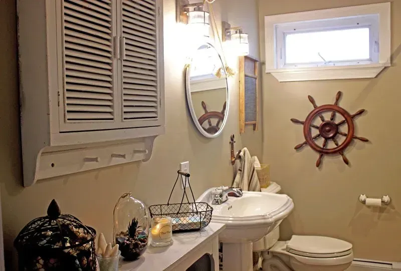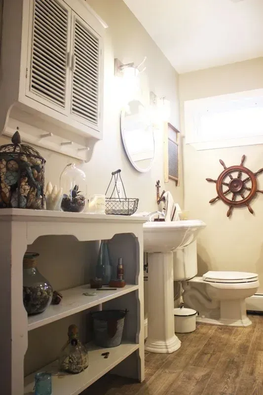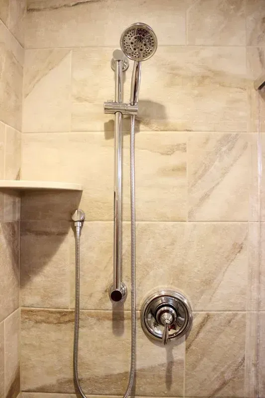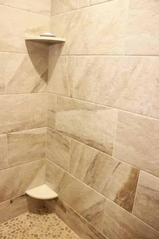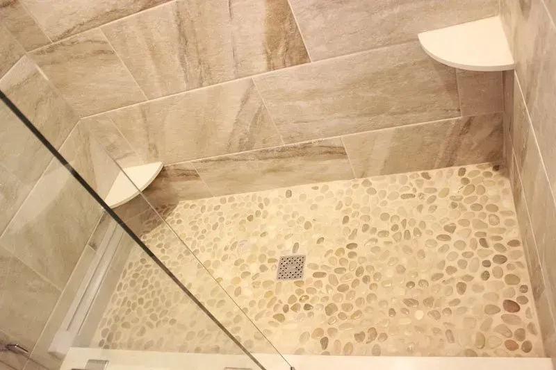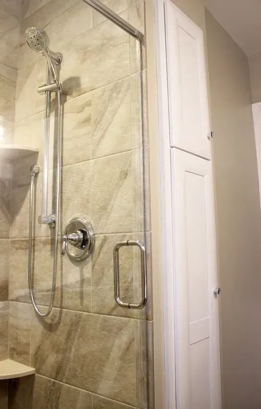 For this bathroom renovation, we removed the existing tub and installed a full height shower with tile walls and shelves, pebble floor, glass doors, and chrome shower head. We also installed white Omega Dynasty cabinets for extra storage and a tile plank floor.