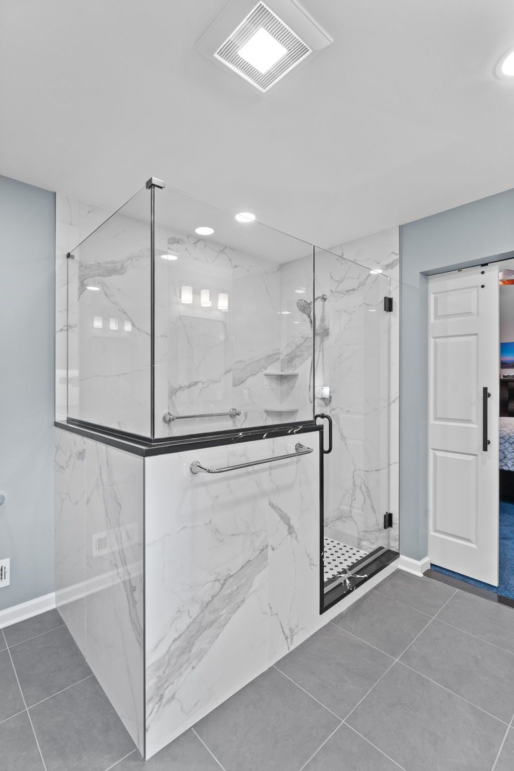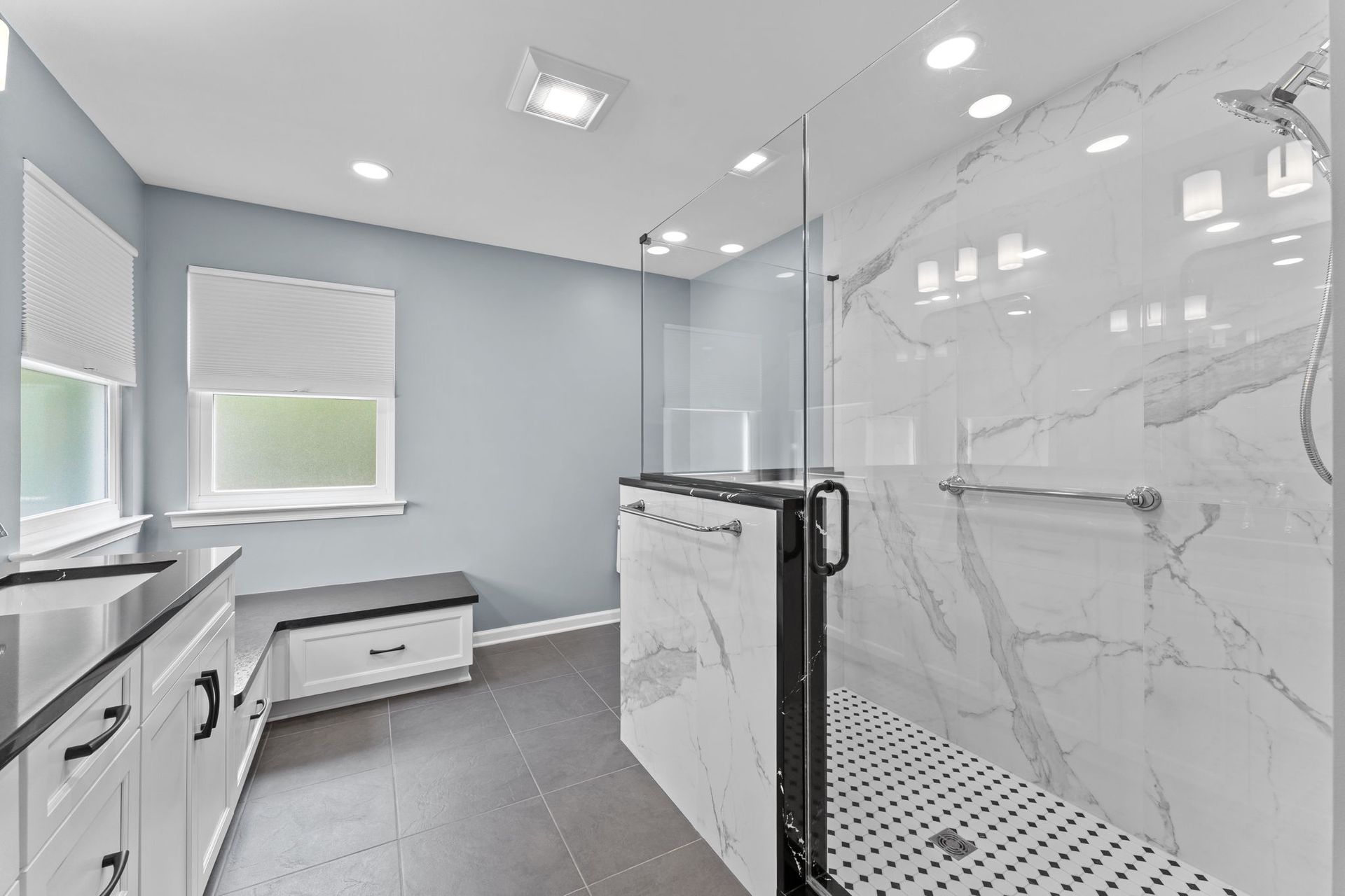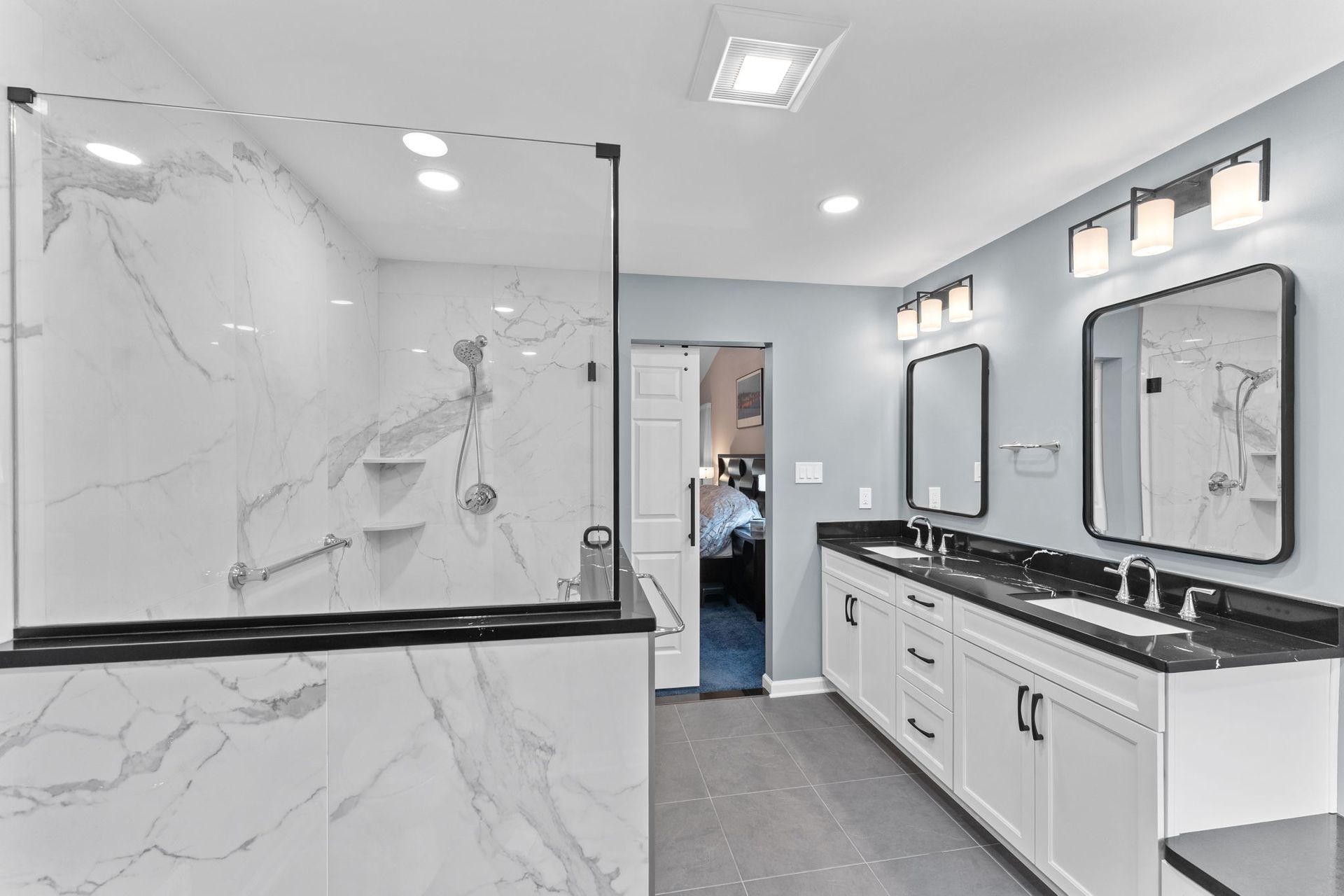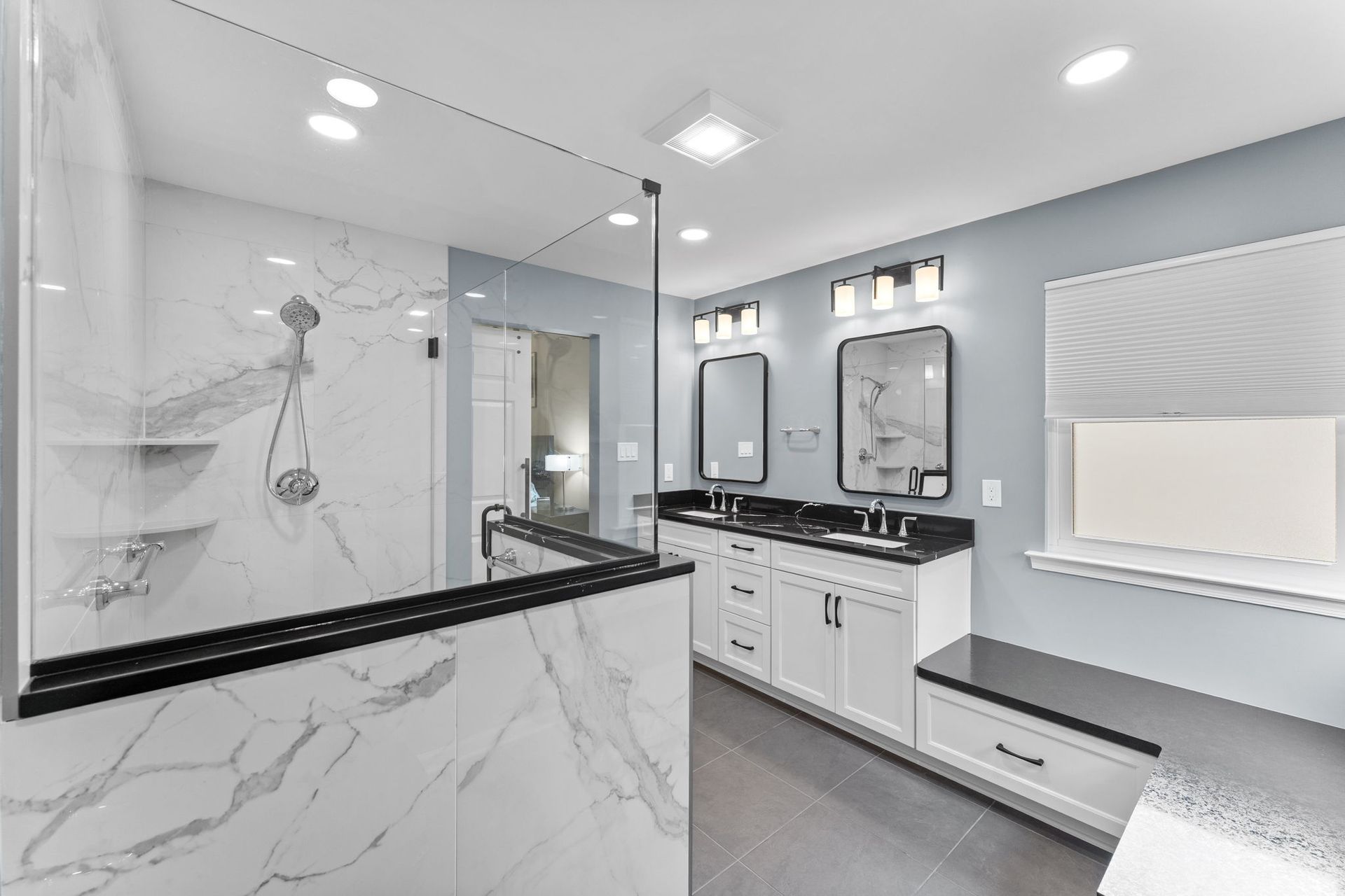 This contemporary bathroom looks elegant because of contrasting stones and cabinetry. The double vanity is Waypoint in painted linen, the vanity top is Cambria Quartz in the color blackbrook, which also lines the shower sills. The bench is Wilsonart black laminate. The shower is a combination of tiles; the walls are from Happy Floors statuario luxe arranged in a vertical pattern, the floor is MGI white octagon with black dot. There's corner shelves in the color storm grey inside the shower as well, and a decent sized grab bar. The floors are Happy Floors tile in eternity black, and there's a wide bevel threshold in absolute black. We also installed their white barn door. The final bathroom looks luxurious.