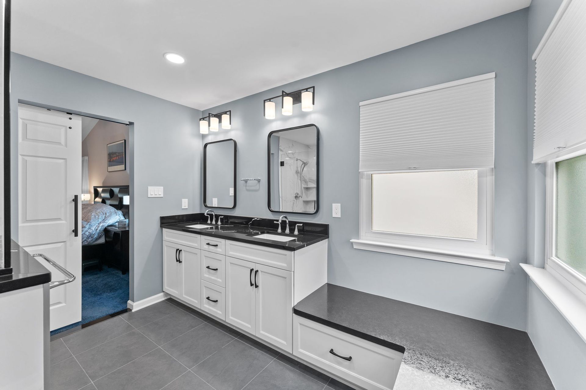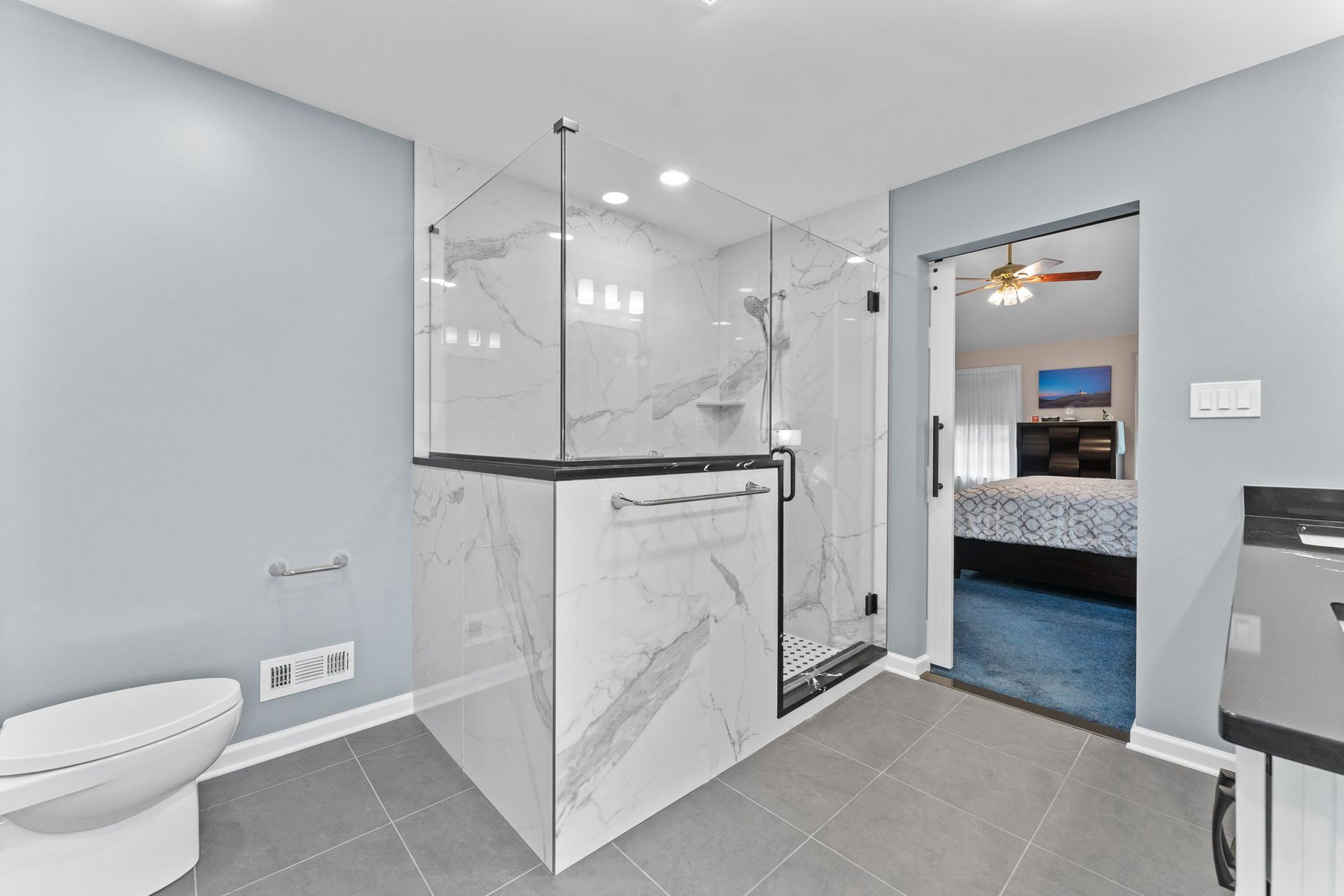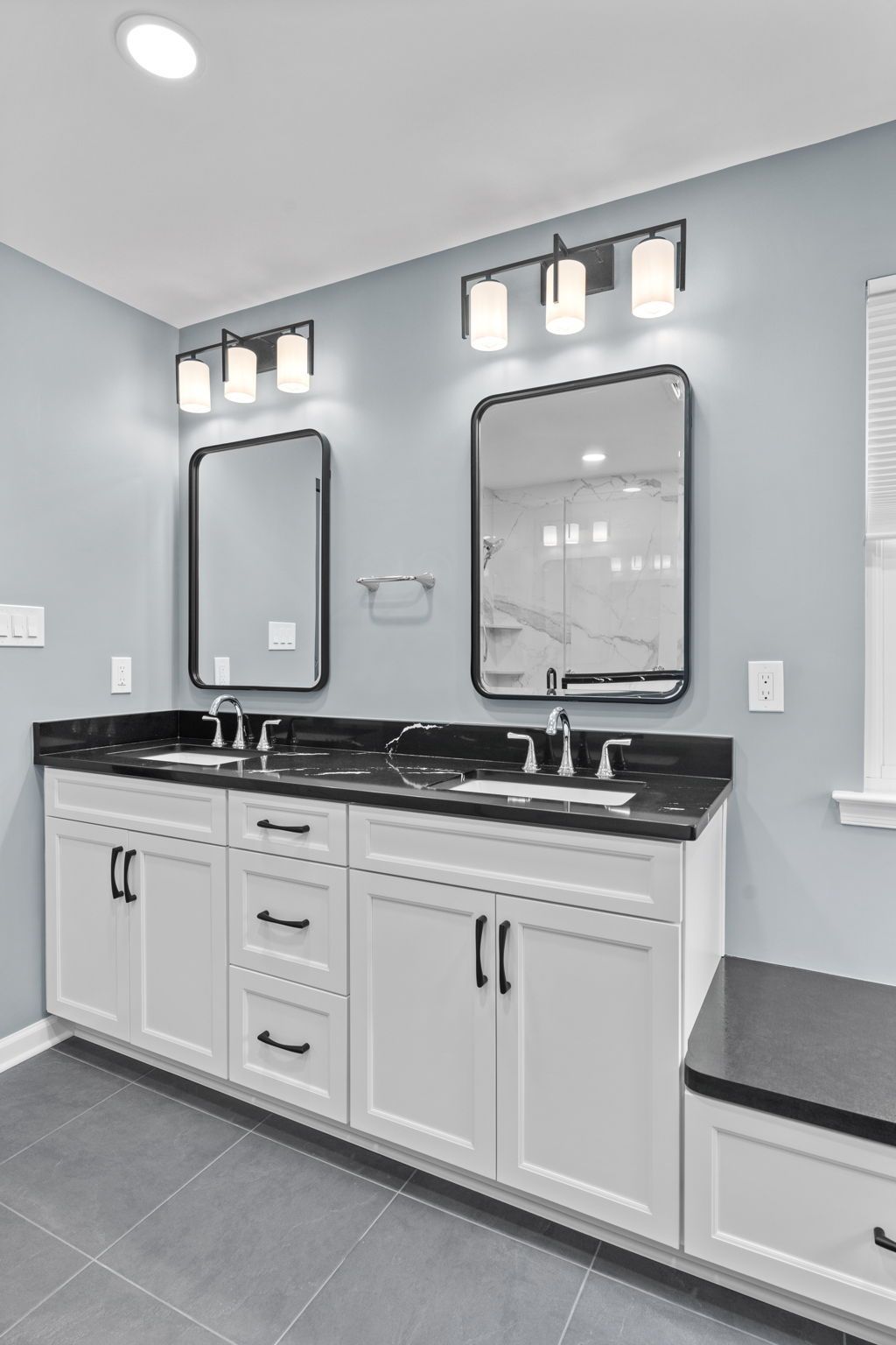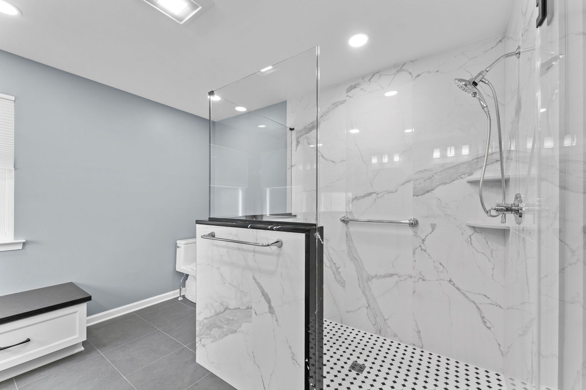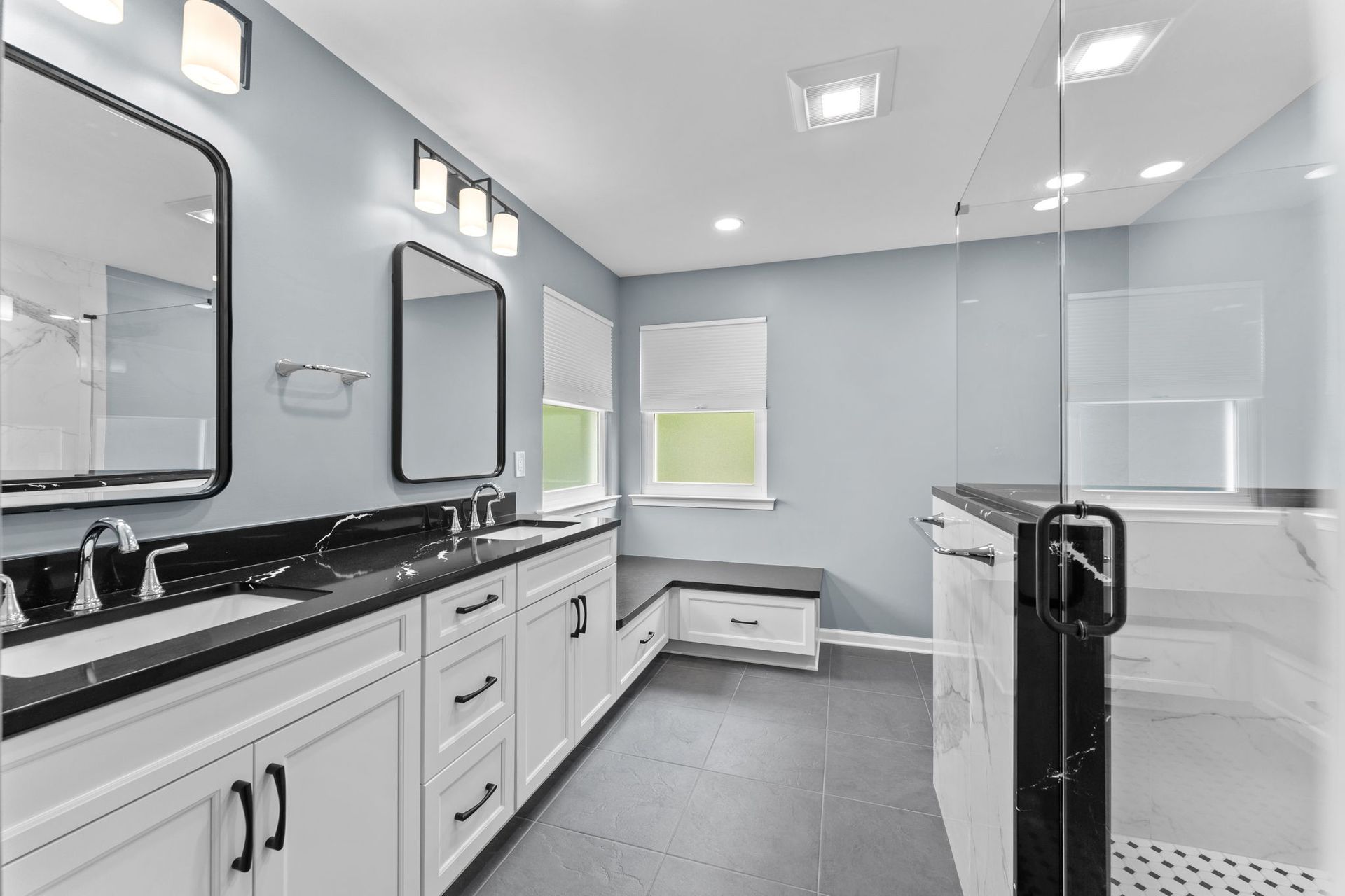 This contemporary bathroom looks elegant because of contrasting stones and cabinetry. The double vanity is Waypoint in painted linen, the vanity top is Cambria Quartz in the color blackbrook, which also lines the shower sills. The bench is Wilsonart black laminate. The shower is a combination of tiles; the walls are from Happy Floors statuario luxe arranged in a vertical pattern, the floor is MGI white octagon with black dot. There's corner shelves in the color storm grey inside the shower as well, and a decent sized grab bar. The floors are Happy Floors tile in eternity black, and there's a wide bevel threshold in absolute black. We also installed their white barn door. The final bathroom looks luxurious.