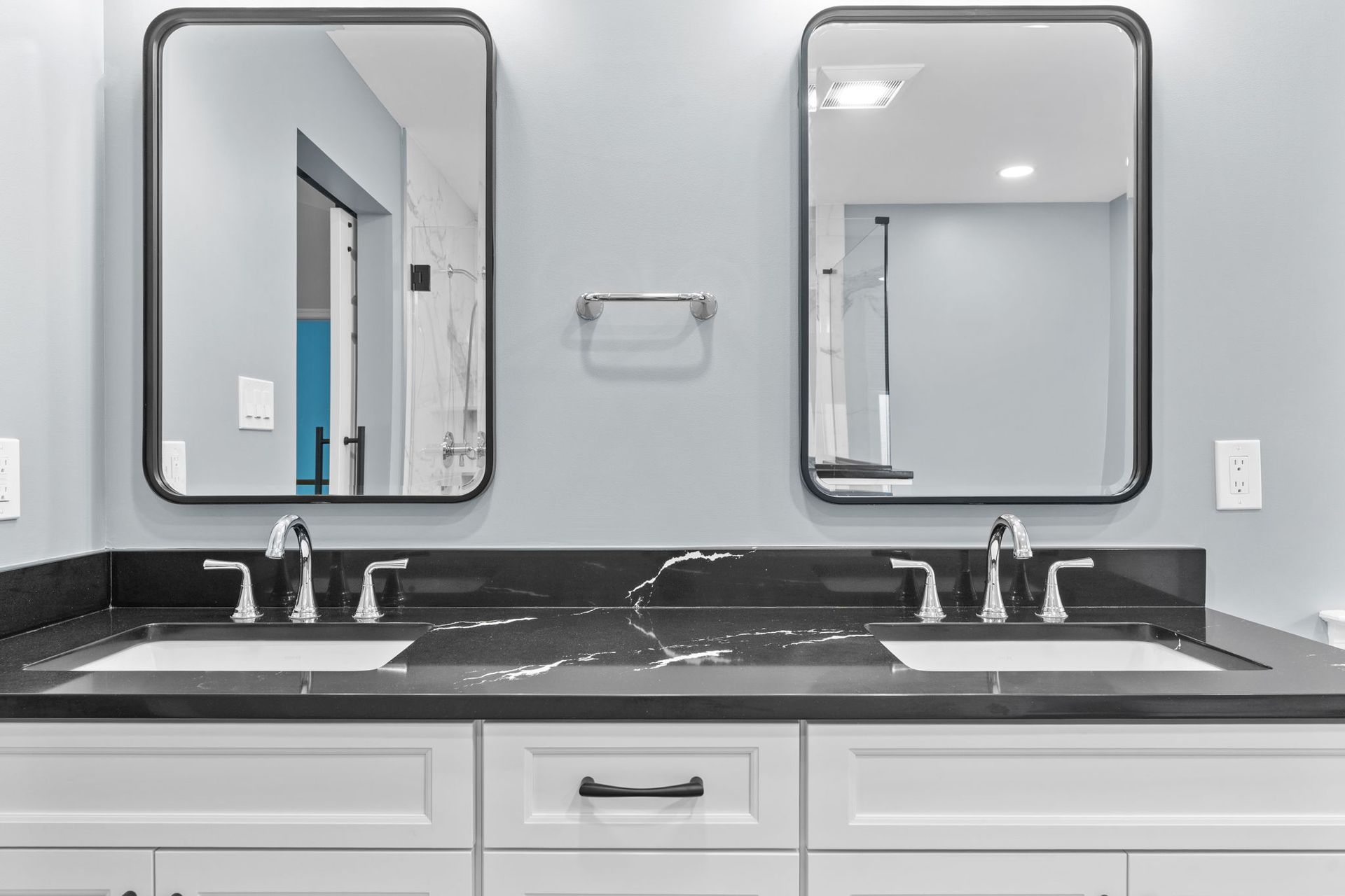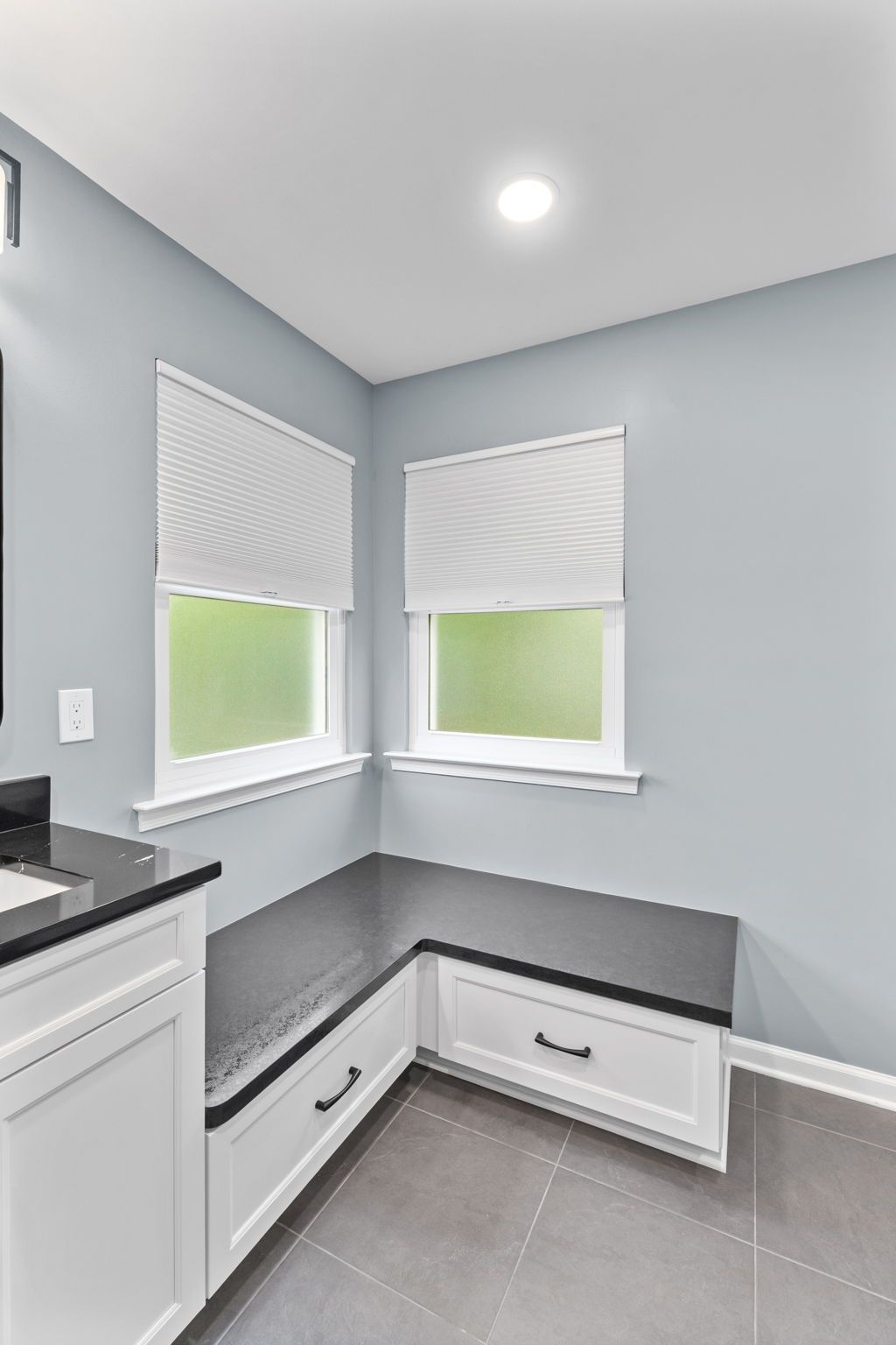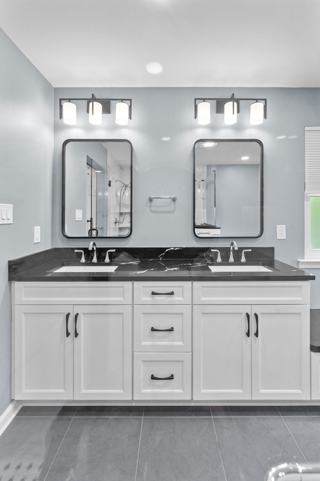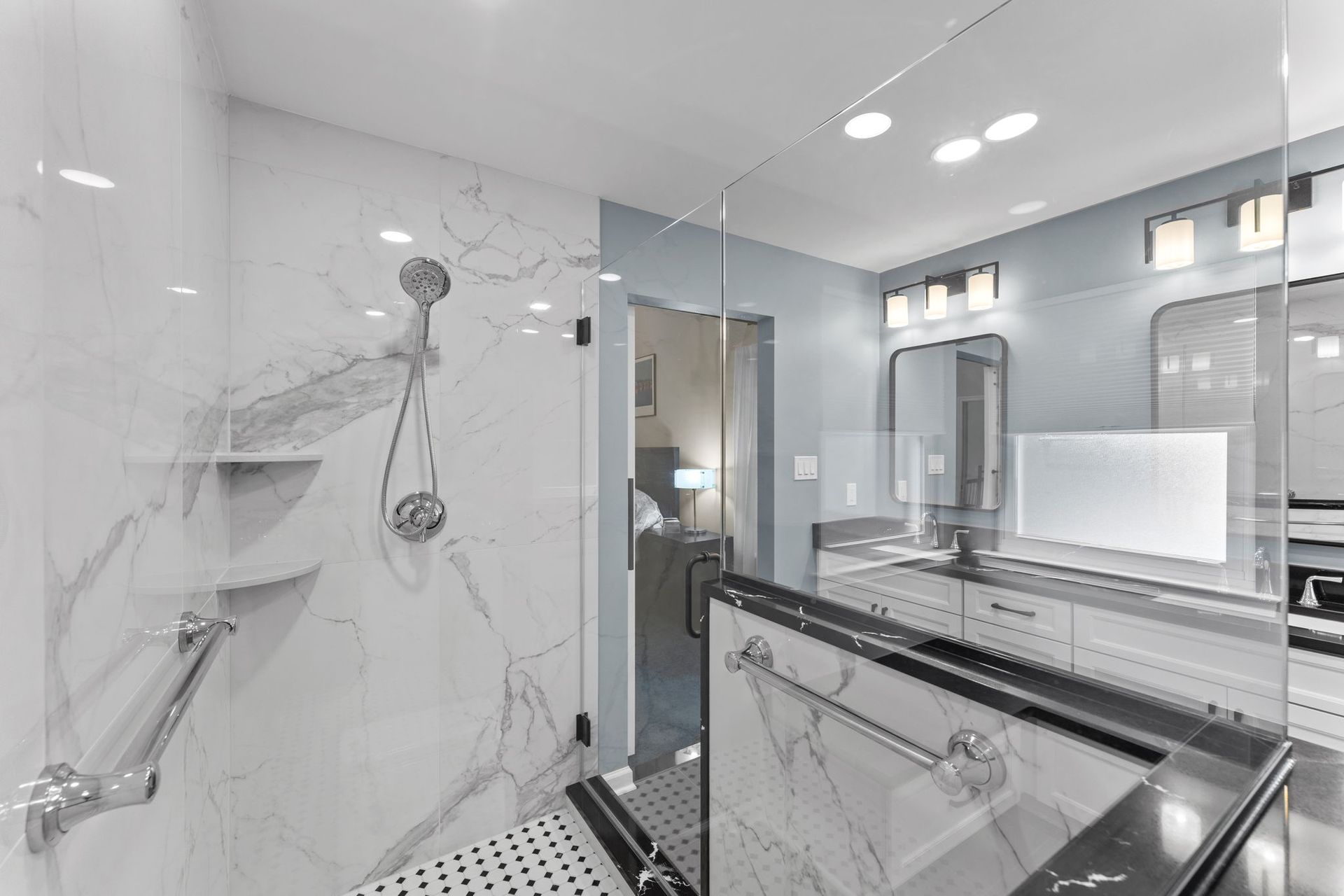 This contemporary bathroom looks elegant because of contrasting stones and cabinetry. The double vanity is Waypoint in painted linen, the vanity top is Cambria Quartz in the color blackbrook, which also lines the shower sills. The bench is Wilsonart black laminate. The shower is a combination of tiles; the walls are from Happy Floors statuario luxe arranged in a vertical pattern, the floor is MGI white octagon with black dot. There's corner shelves in the color storm grey inside the shower as well, and a decent sized grab bar. The floors are Happy Floors tile in eternity black, and there's a wide bevel threshold in absolute black. We also installed their white barn door. The final bathroom looks luxurious.