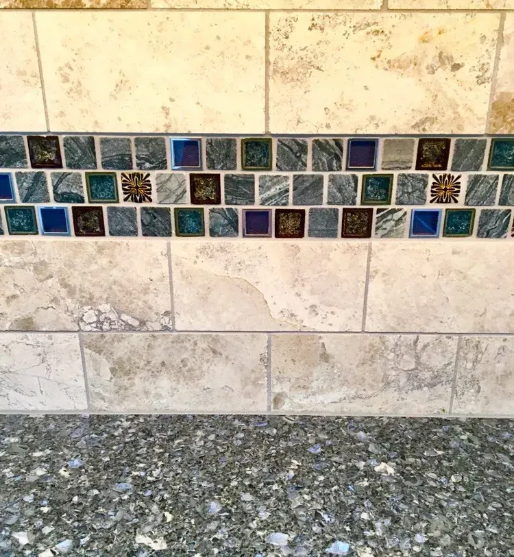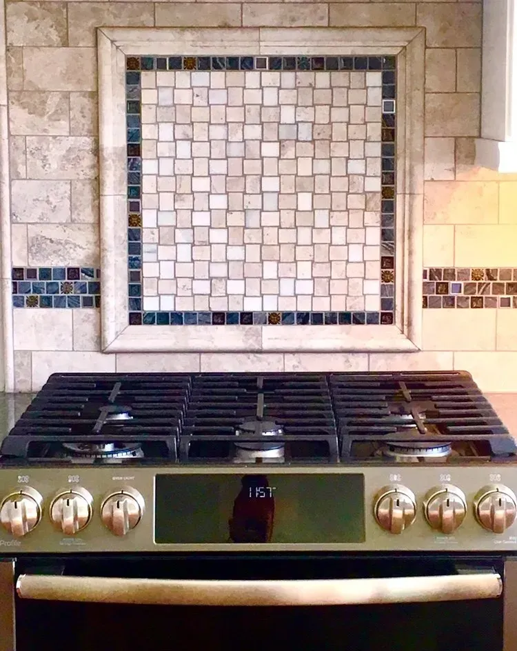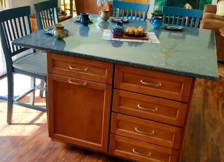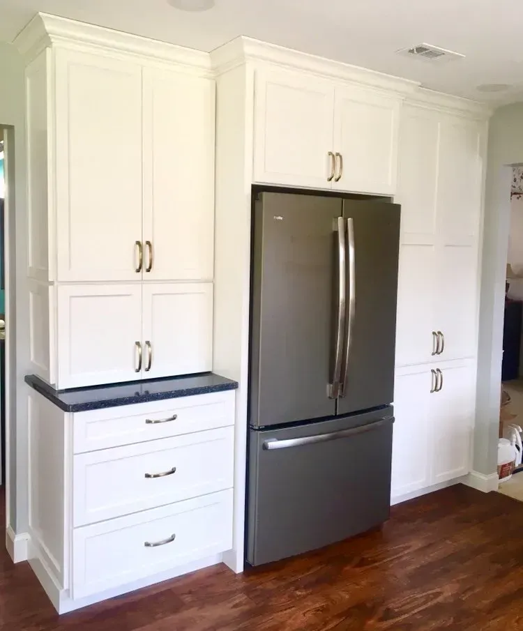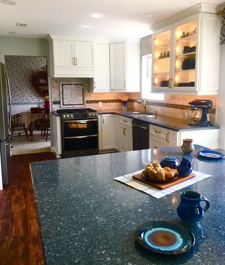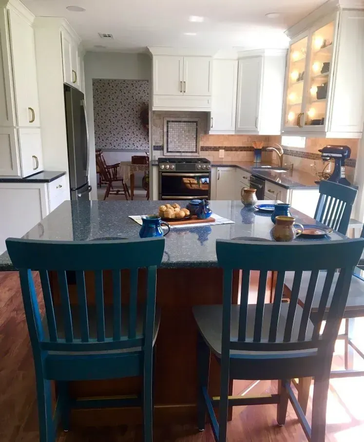 This Country Chic Kitchen was renovated with painted Omega Dynasty Cabinets in Elemental White for perimeter of the kitchen and Alder wood Omega Dynasty Cabinets in Cinnamon for the island. This kitchen also has new Cambria quartz countertops in Parys, Champagne Bronze faucet and handles, Luxury Vinyl floor and new appliances.