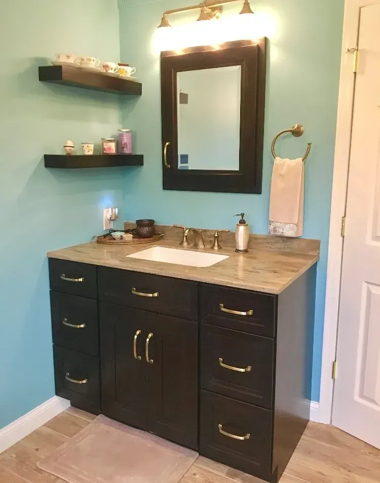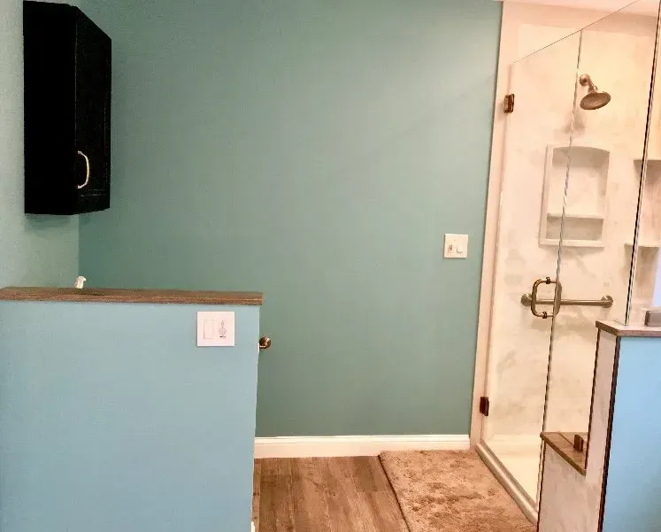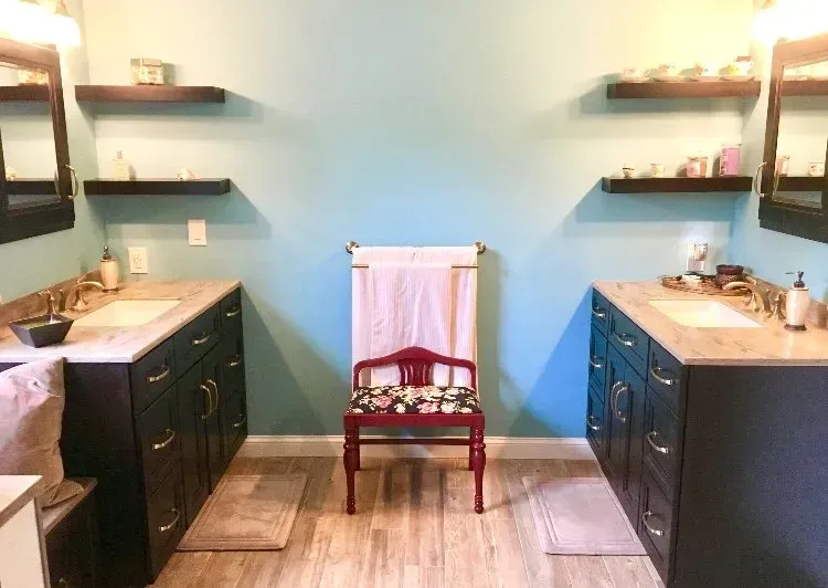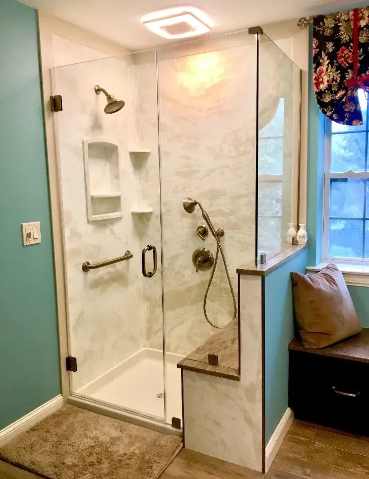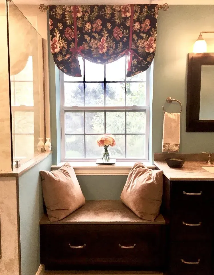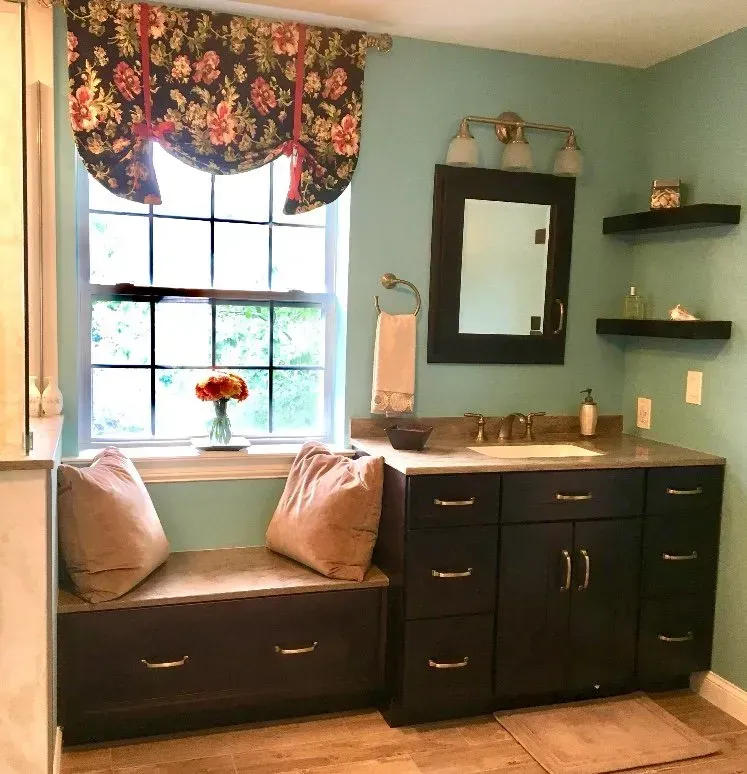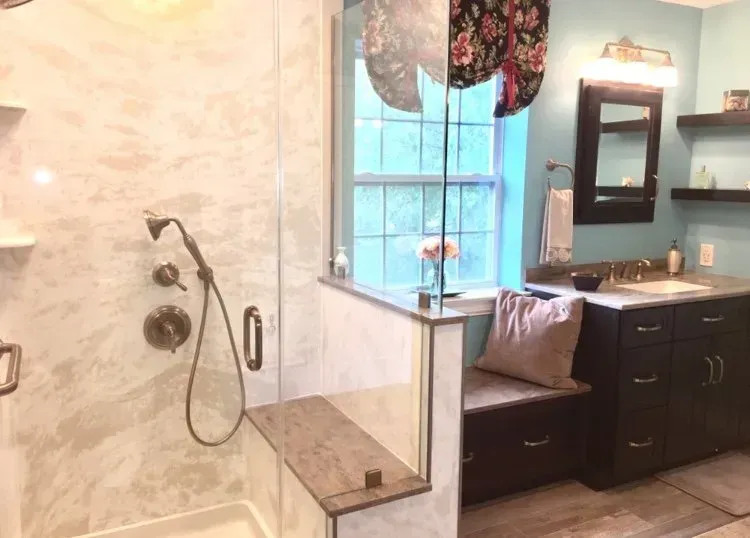 This master bathroom was updated with Maple Omega Dynasty Cabinets, 2 Vanities, corian countertops, bench drawer seat, swanstone shower wall system & tile floor.
