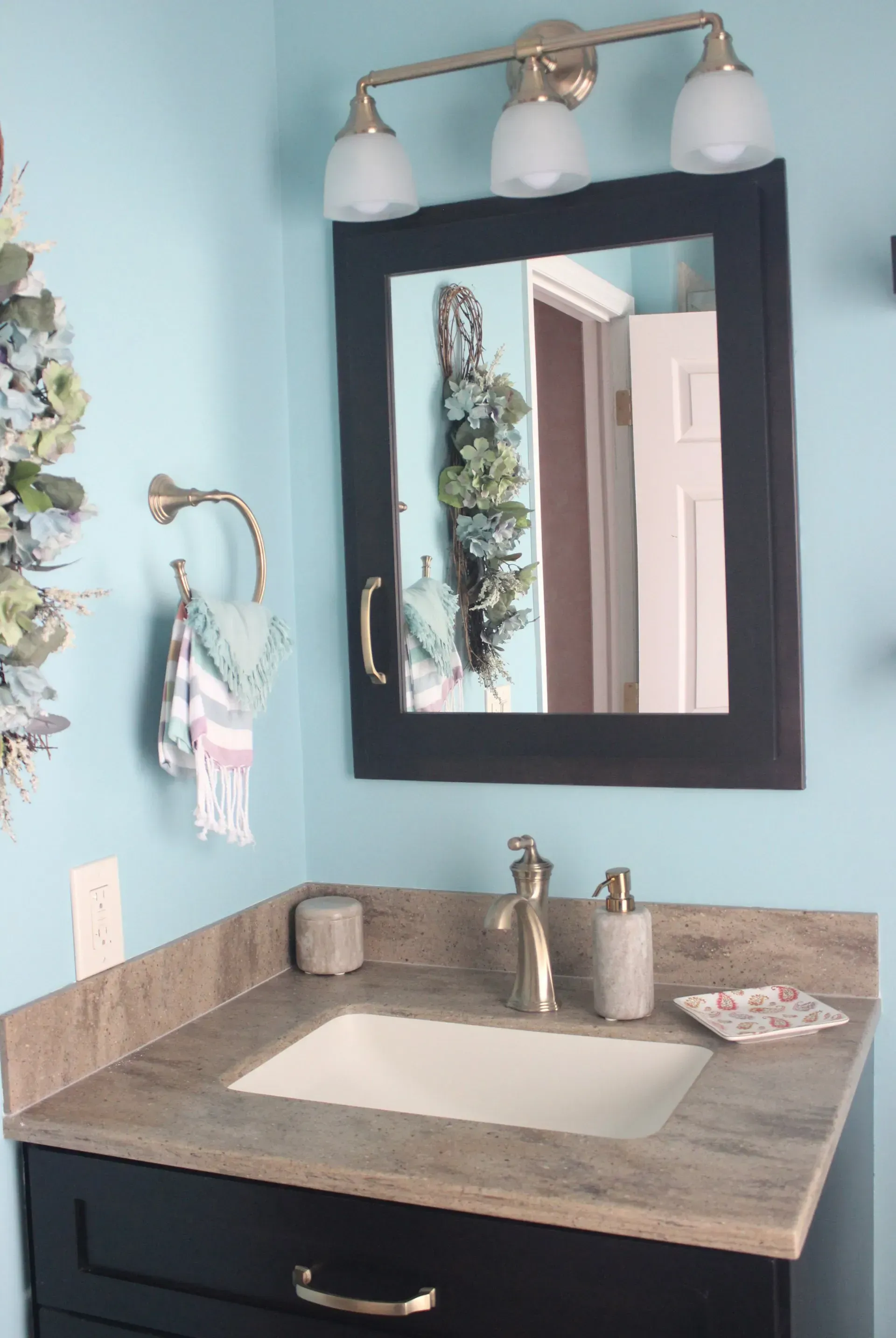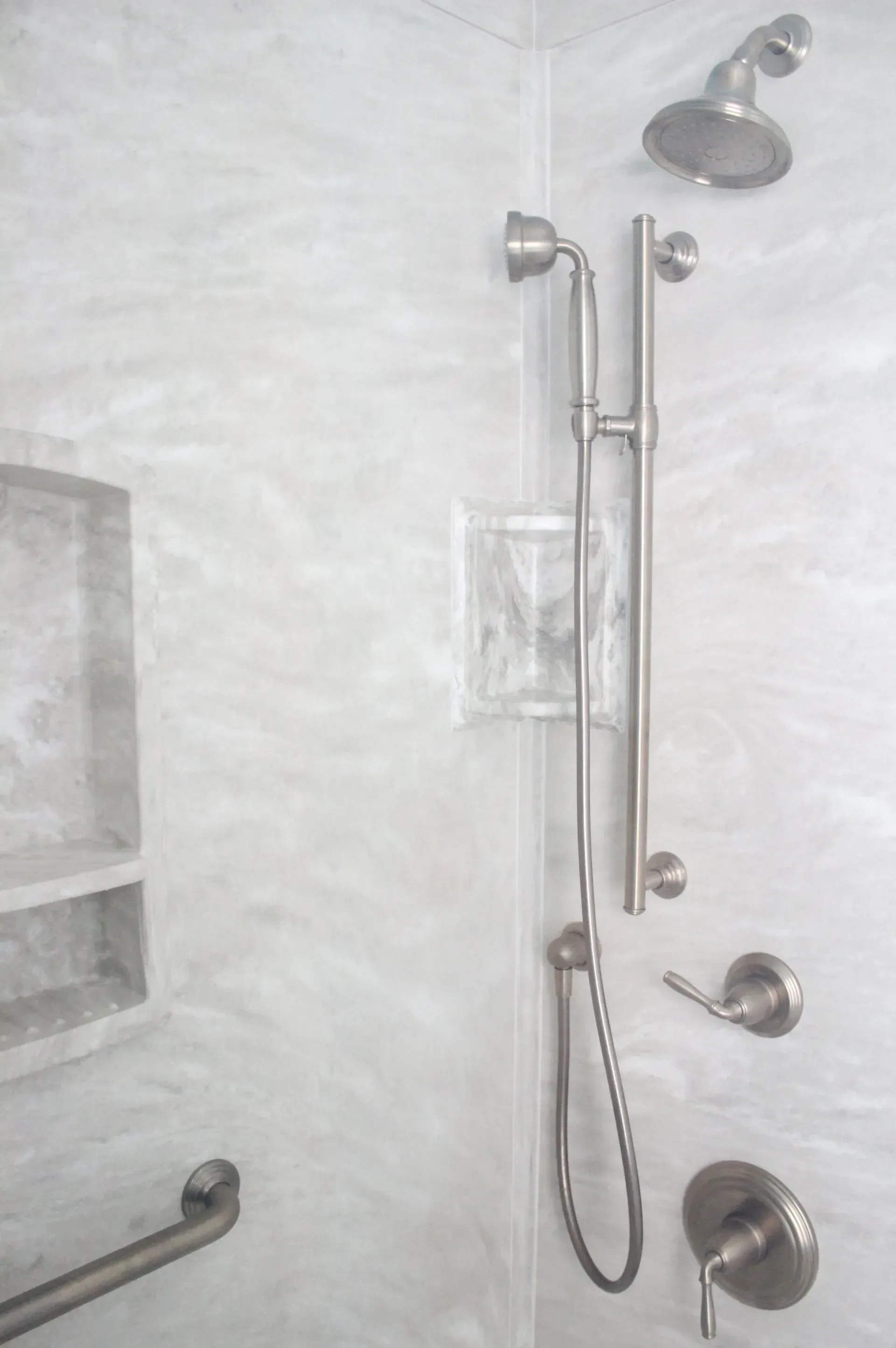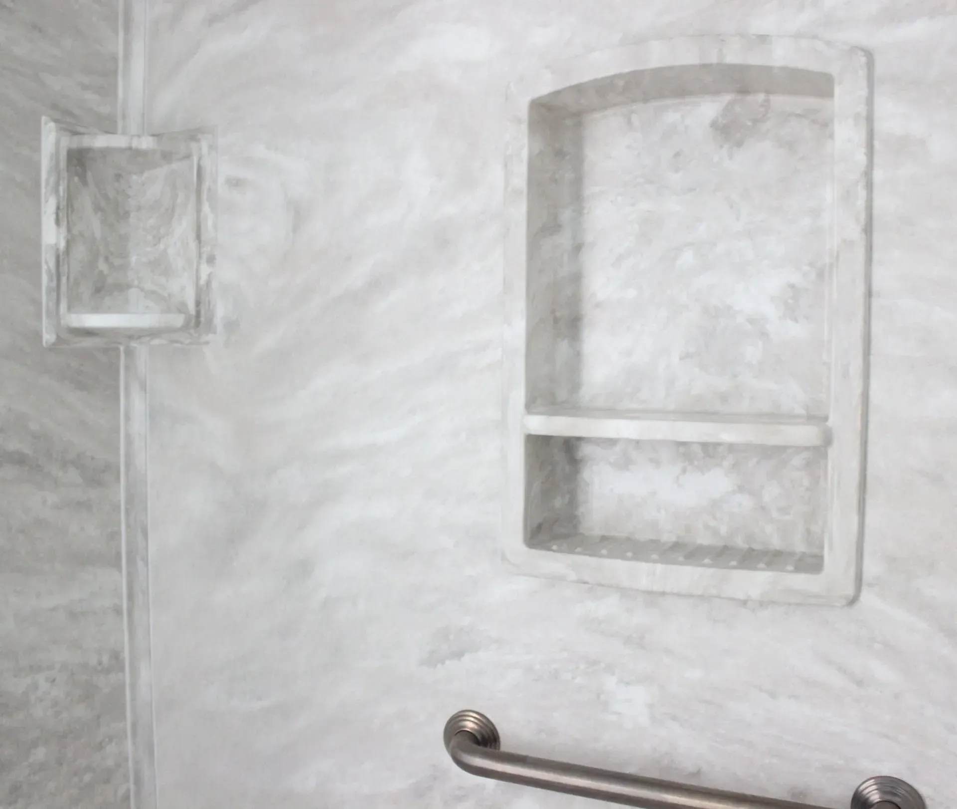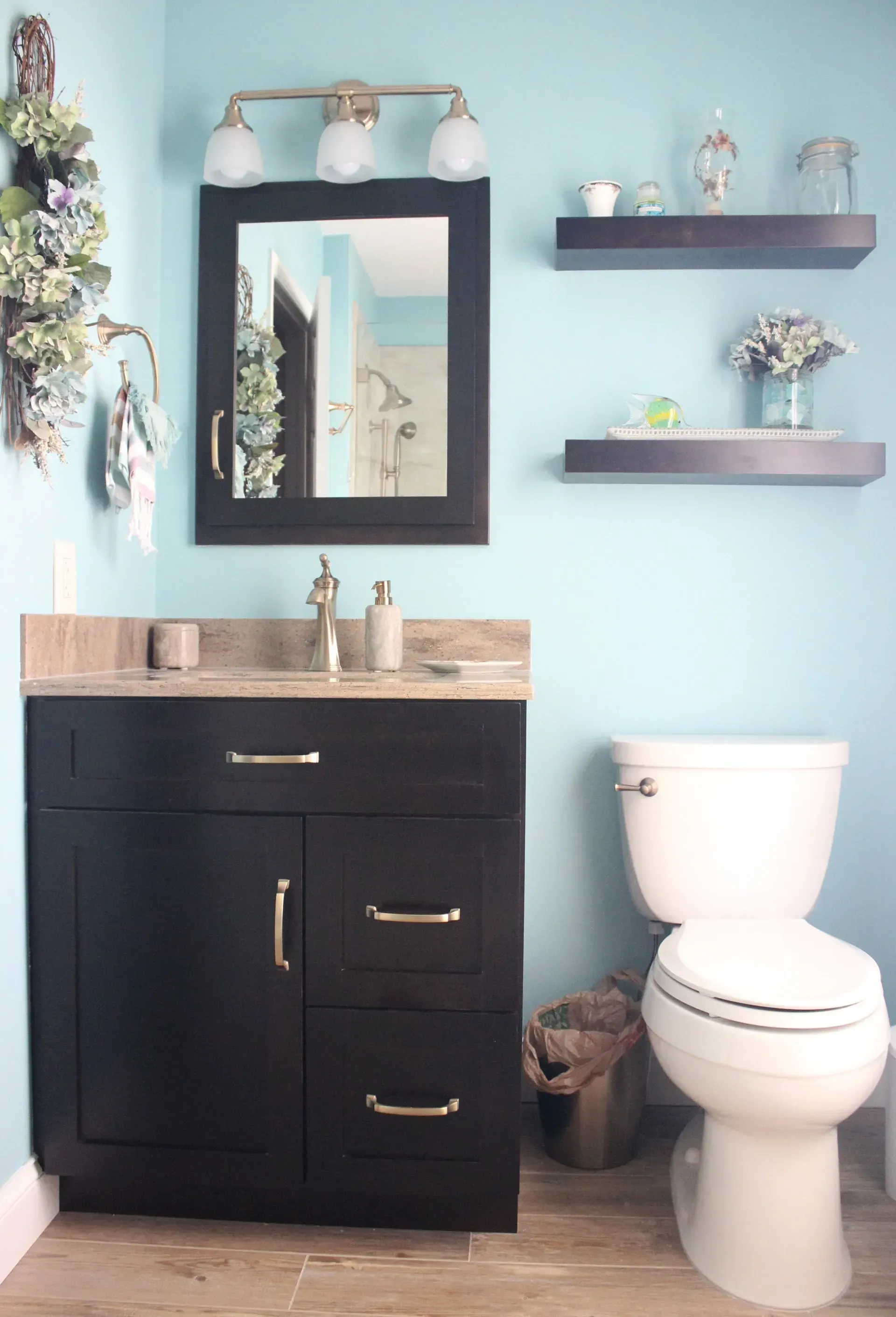 This bathroom in Burlington, NJ was updated with Omega Dynasty Vanity and matching floating shelves, Swanstone tub wall surround, and new tile floor.