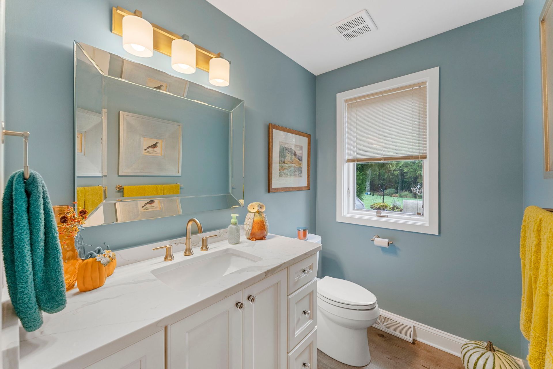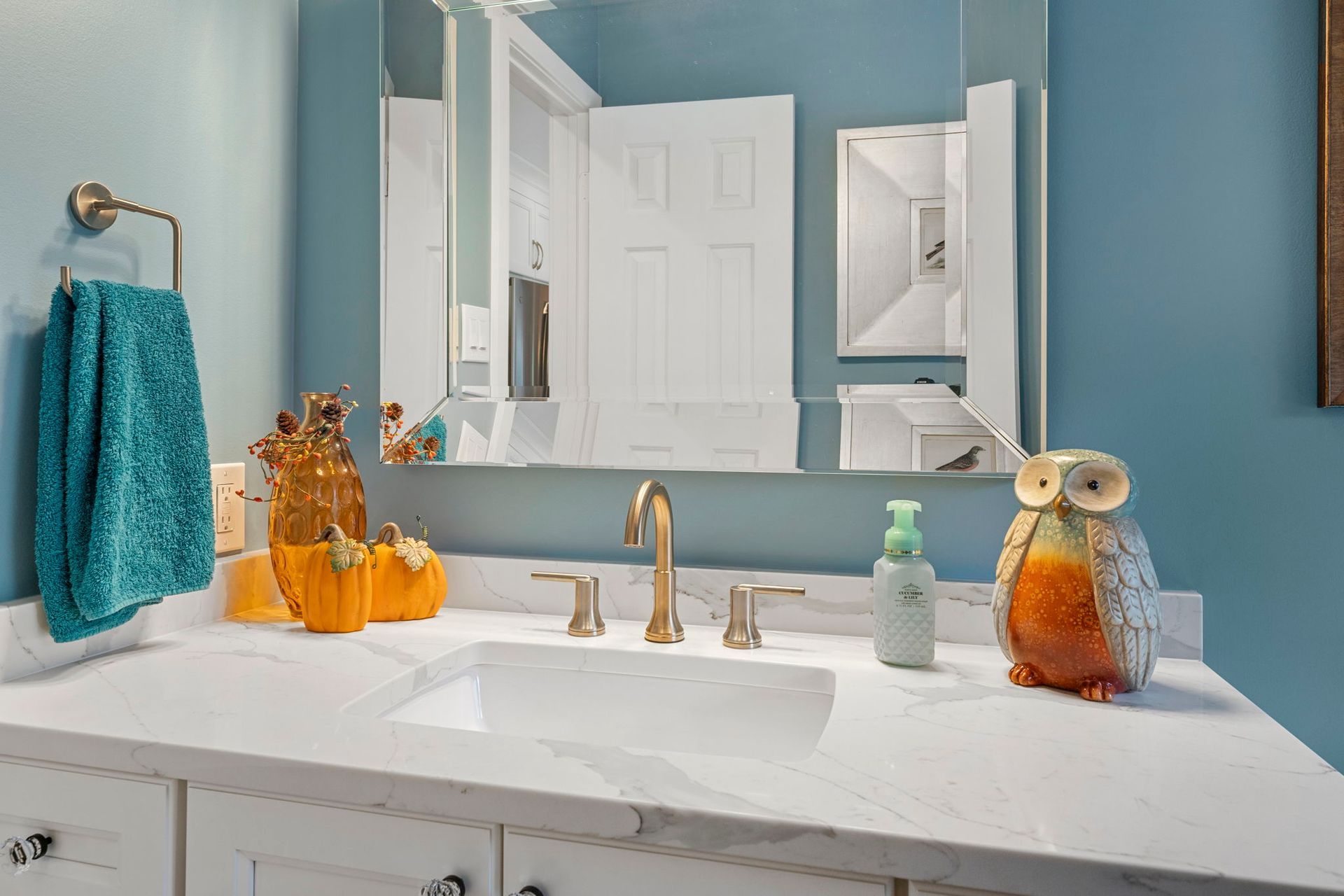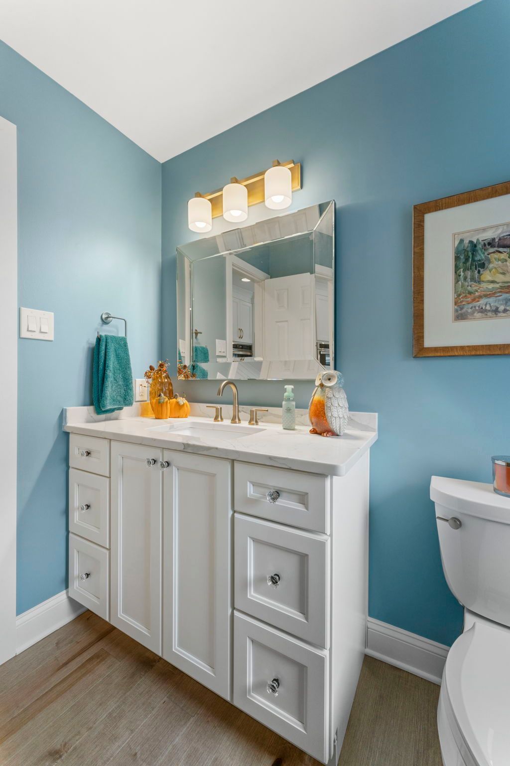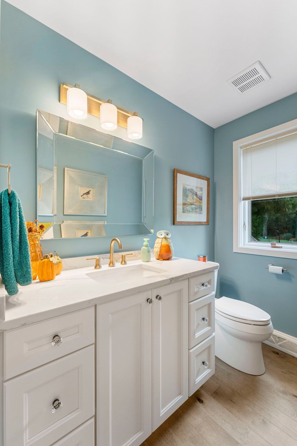 This colorful bathroom provides a charming space for our clients and their guests. The vanity itself is pretty simple, Wellborn cabinets painted glacier and a Statuarto quartz emerstone vanity top. The paint and the fixtures are what really make this room pop, the bright blue walls and gold sconce and faucet contrast nicely, and the fall decor adds a bit of extra flair.