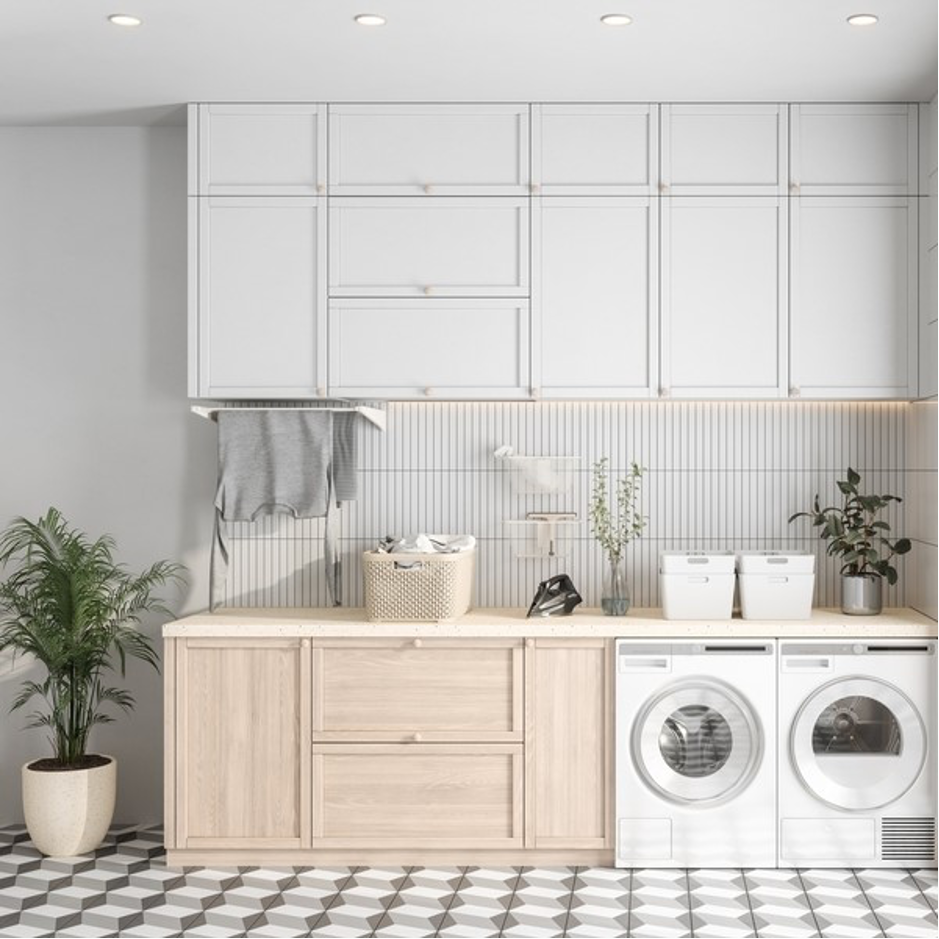 more functional and enjoyable to use can be applied to laundry spaces. Pull out hampers provide a convenient and hidden space to deposit clothes that need to be washed. Drying racks in the laundry space are another welcomed feature of a well-designed laundry. When possible we specify drying racks above a heat vent.