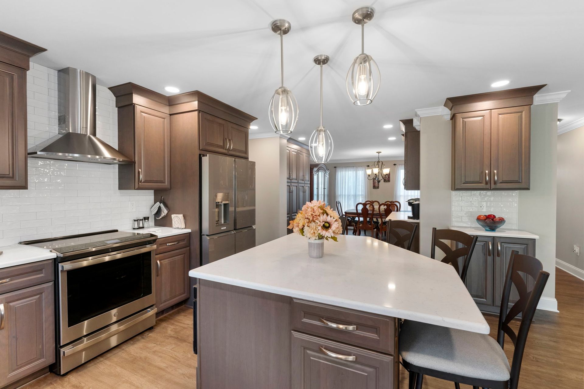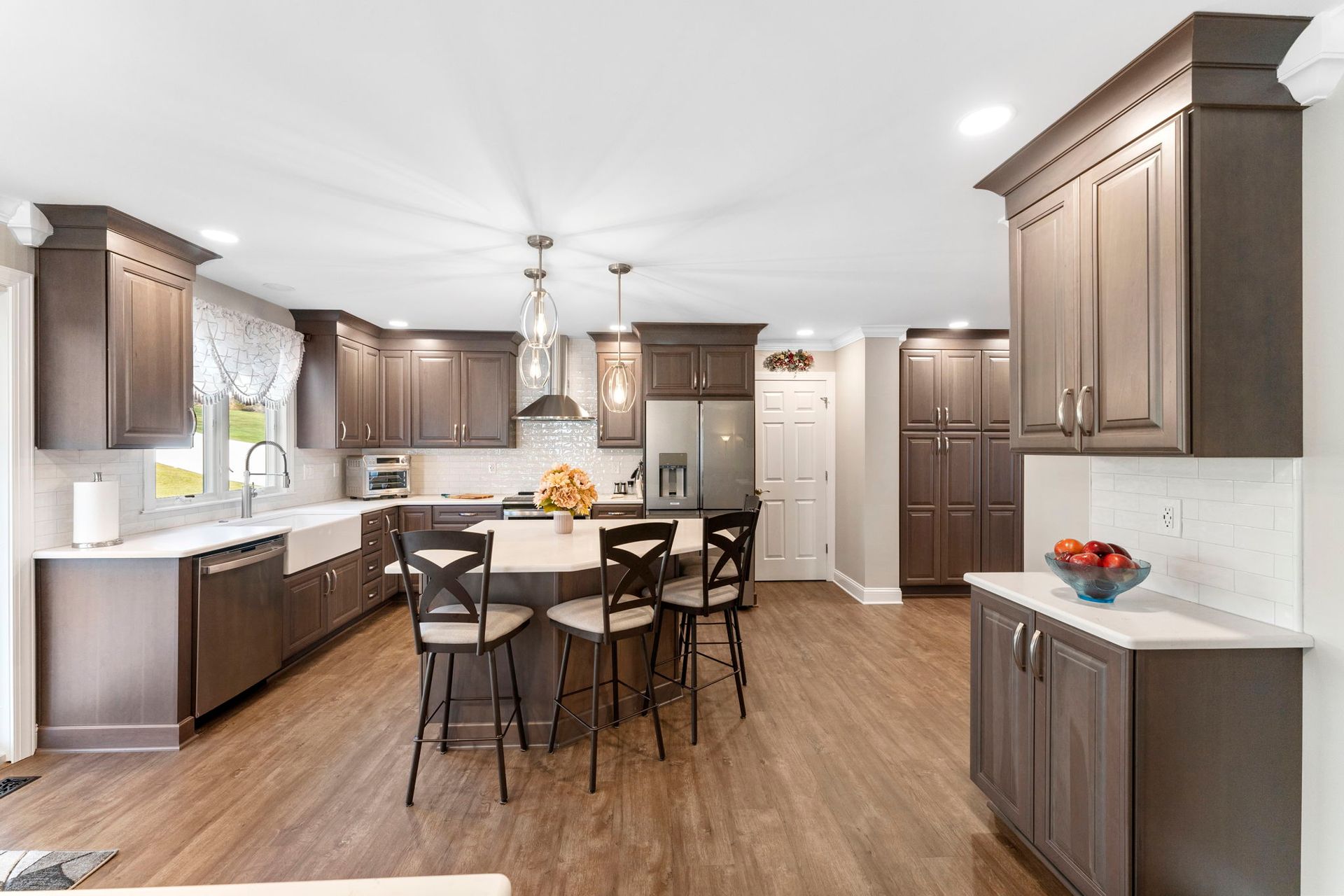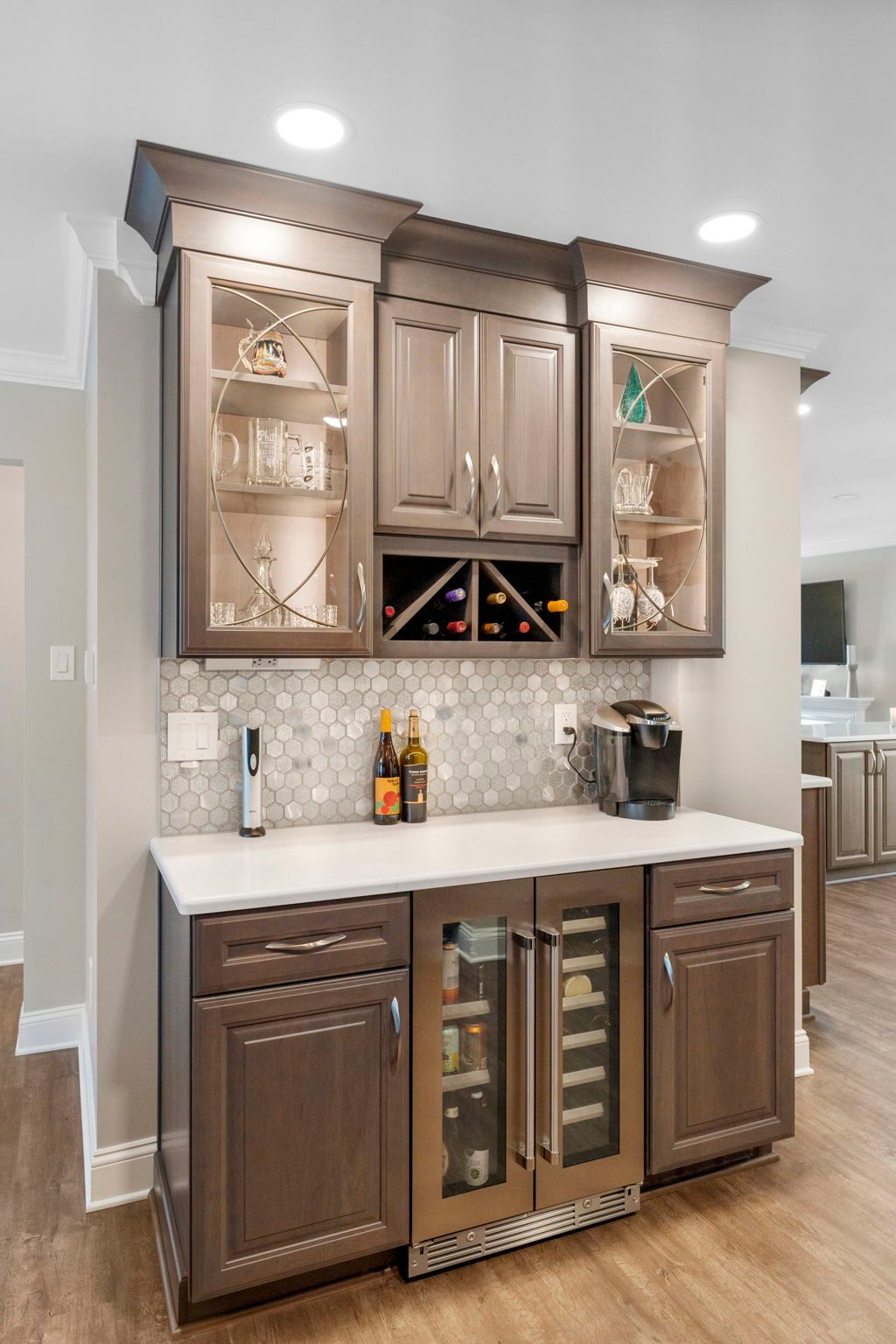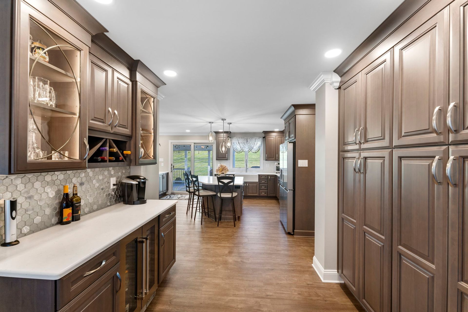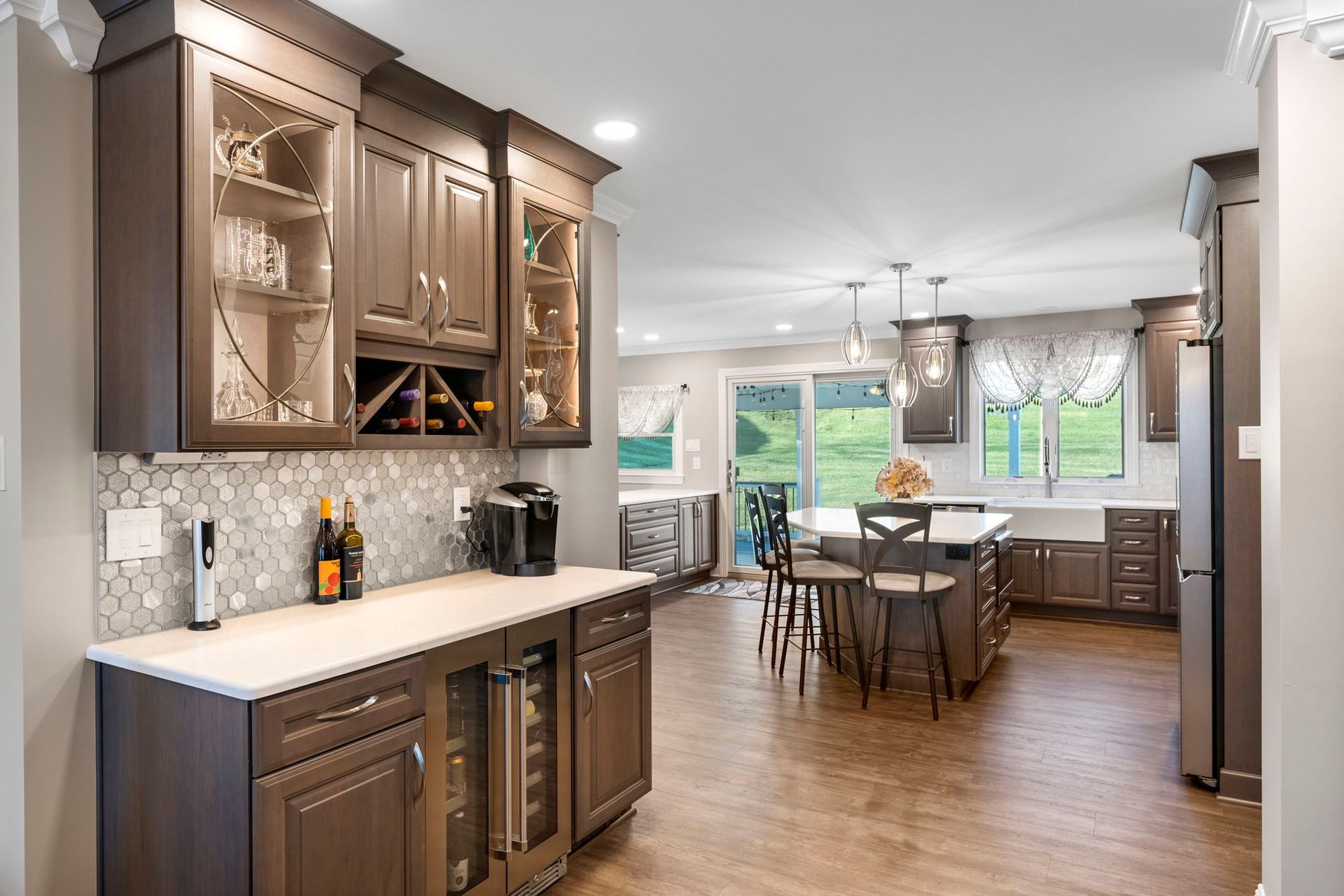 This Doylestown kitchen puts a modern spin on traditional brown cabinetry. It includes Wellborn cabinets in cherry wood with the castle finish, a Carrara quartz countertop in the color blanco, and a Denali white subway-style tile backsplash. With a rounded island and bar seating this kitchen provides a spacious cooking and dining area lit by pendants, high hats, and under-cabinet lighting. Above the stovetop is a sleek steel range, and the microwave was switched to a drawer style which now sits within the island. An apron-style white Bocchi sink blends seamlessly with the quartz countertop. A beverage bar towards the dining room includes a mini fridge and glass door cabinets, perfect for entertaining and impressing, the unique backsplash distinguishes the bar from the kitchen. A peninsula sits at the other end of the kitchen providing a barrier and place for guests between the living room.