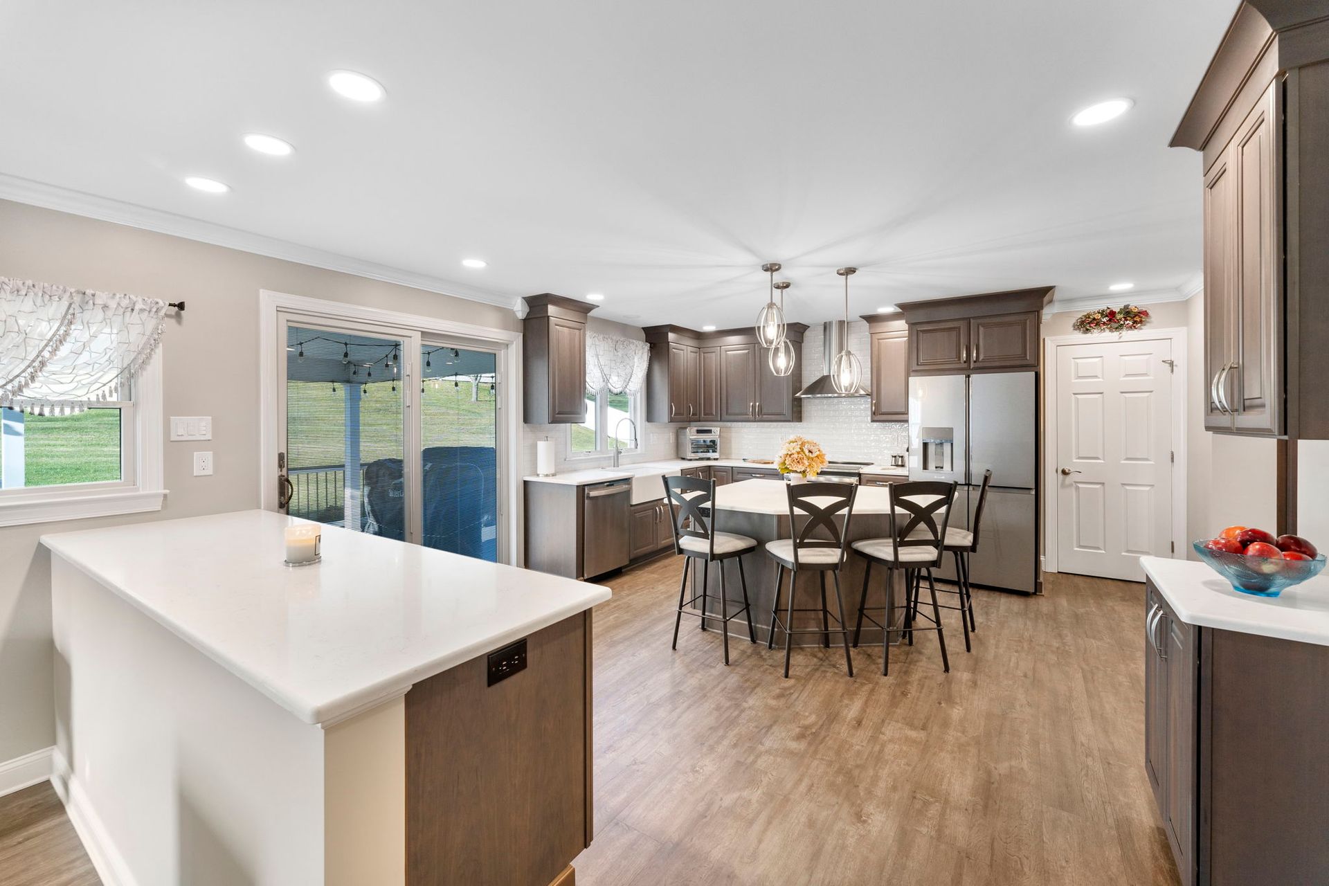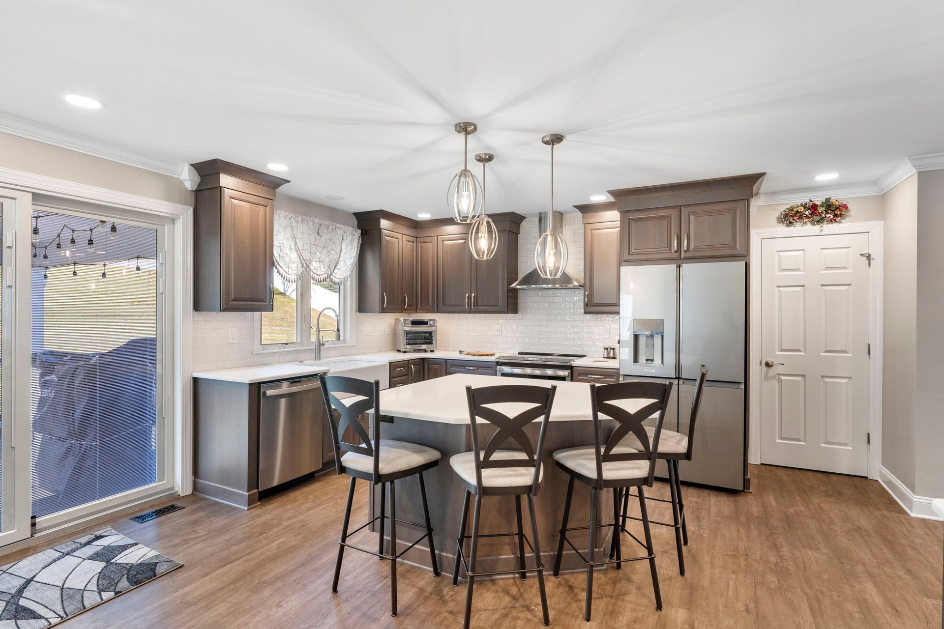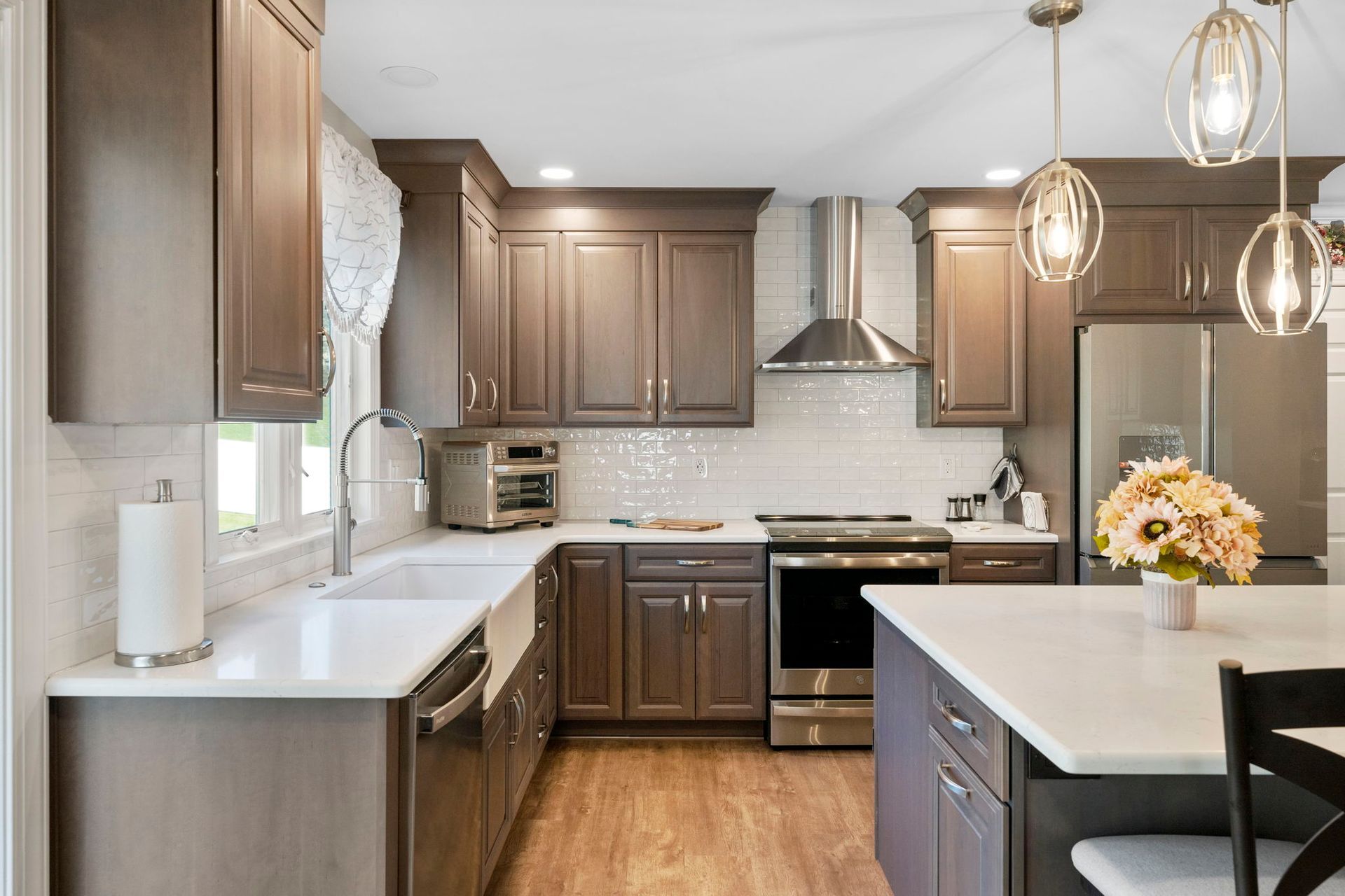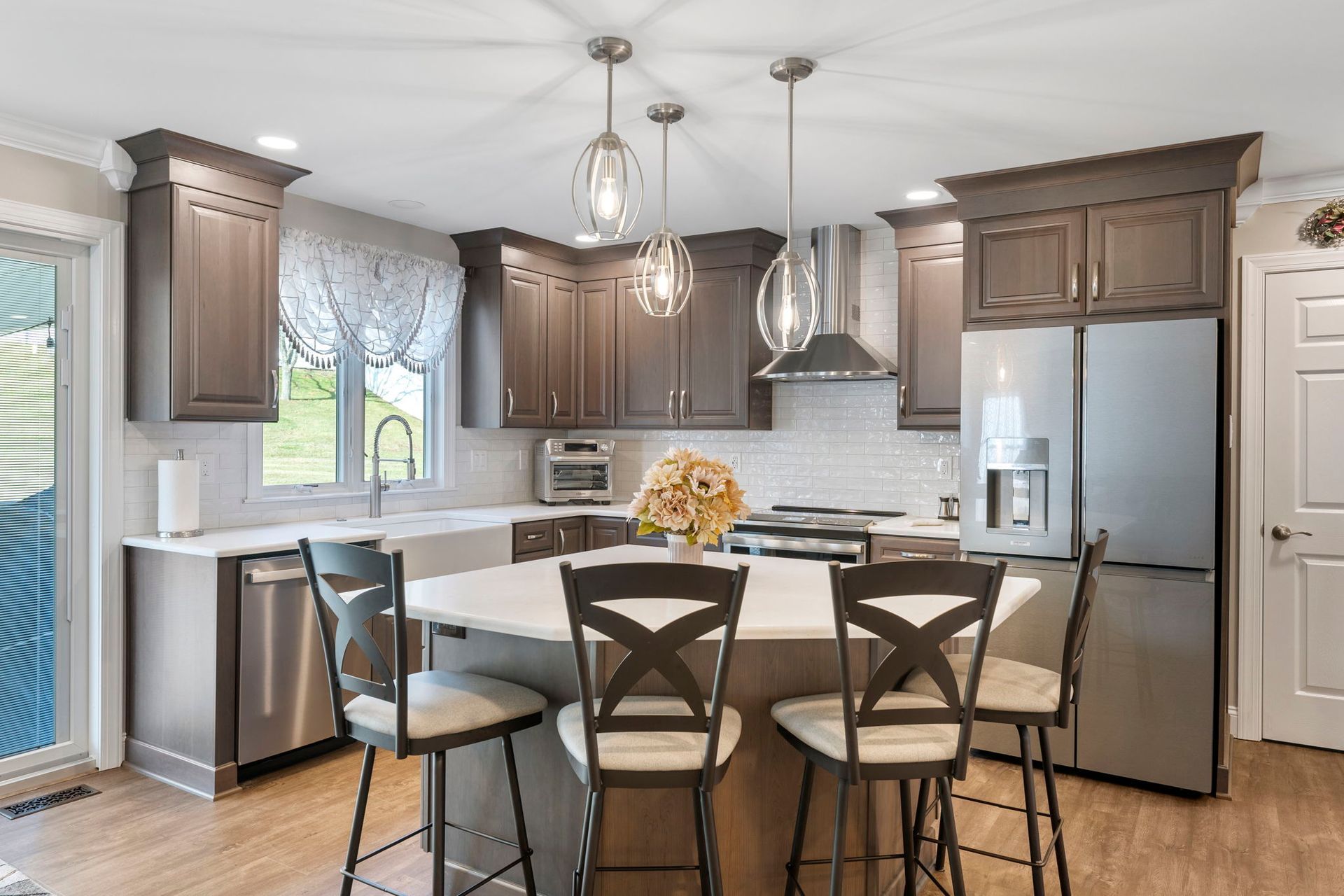 This Doylestown kitchen puts a modern spin on traditional brown cabinetry. It includes Wellborn cabinets in cherry wood with the castle finish, a Carrara quartz countertop in the color blanco, and a Denali white subway-style tile backsplash. With a rounded island and bar seating this kitchen provides a spacious cooking and dining area lit by pendants, high hats, and under-cabinet lighting. Above the stovetop is a sleek steel range, and the microwave was switched to a drawer style which now sits within the island. An apron-style white Bocchi sink blends seamlessly with the quartz countertop. A beverage bar towards the dining room includes a mini fridge and glass door cabinets, perfect for entertaining and impressing, the unique backsplash distinguishes the bar from the kitchen. A peninsula sits at the other end of the kitchen providing a barrier and place for guests between the living room.