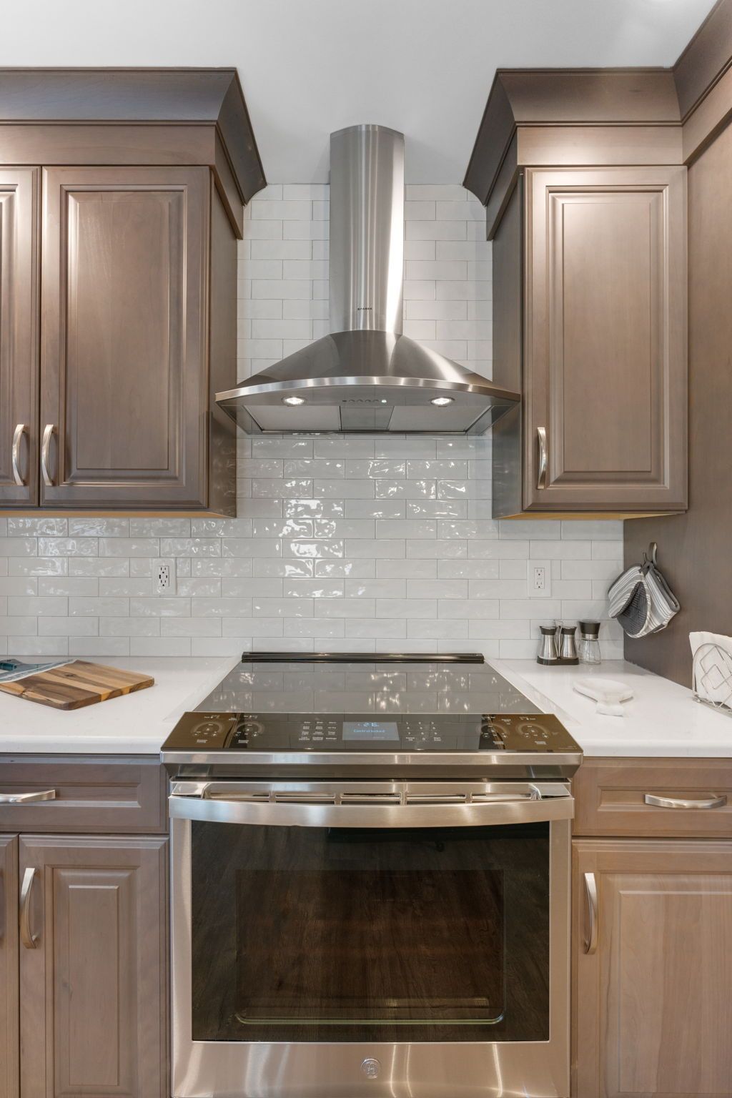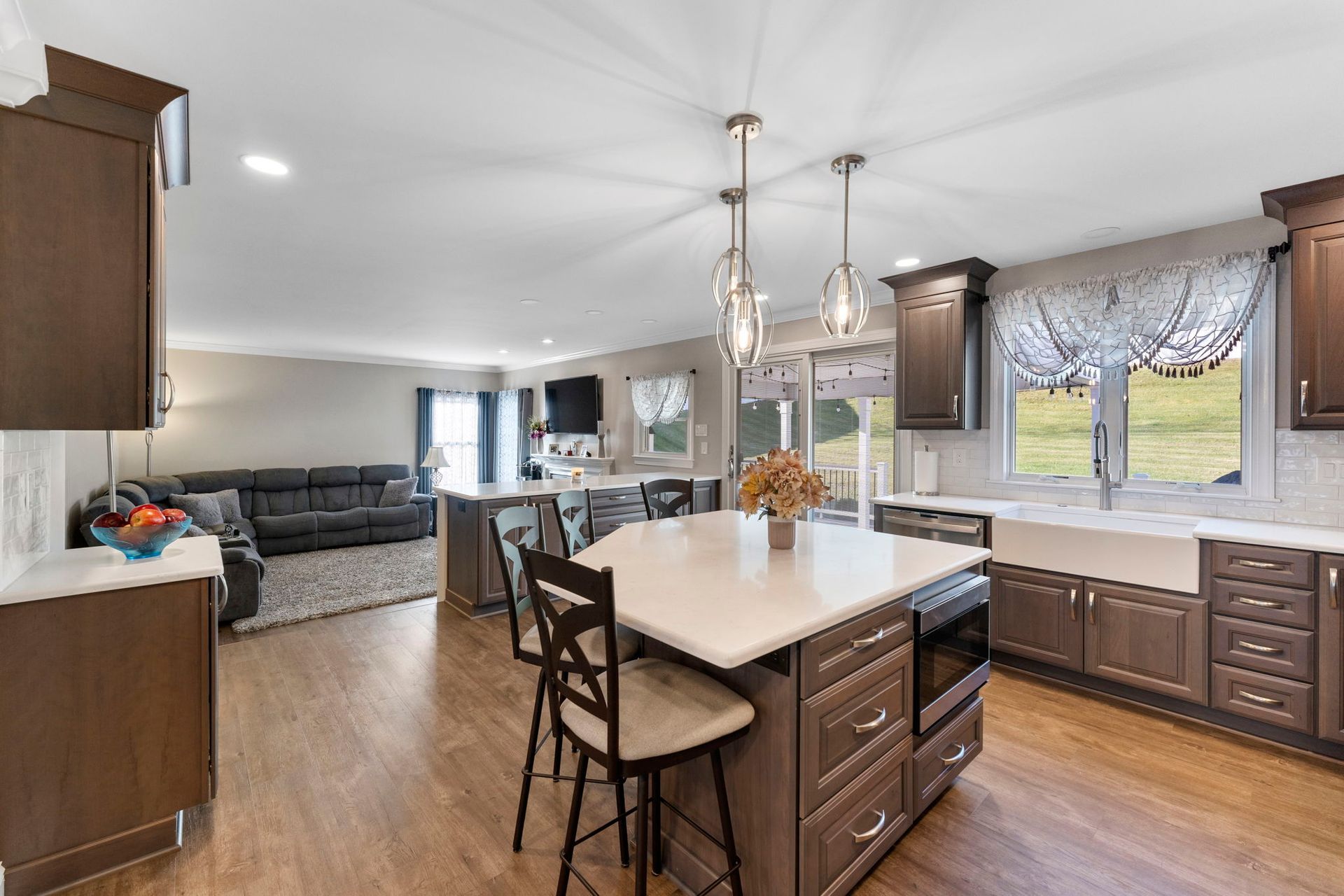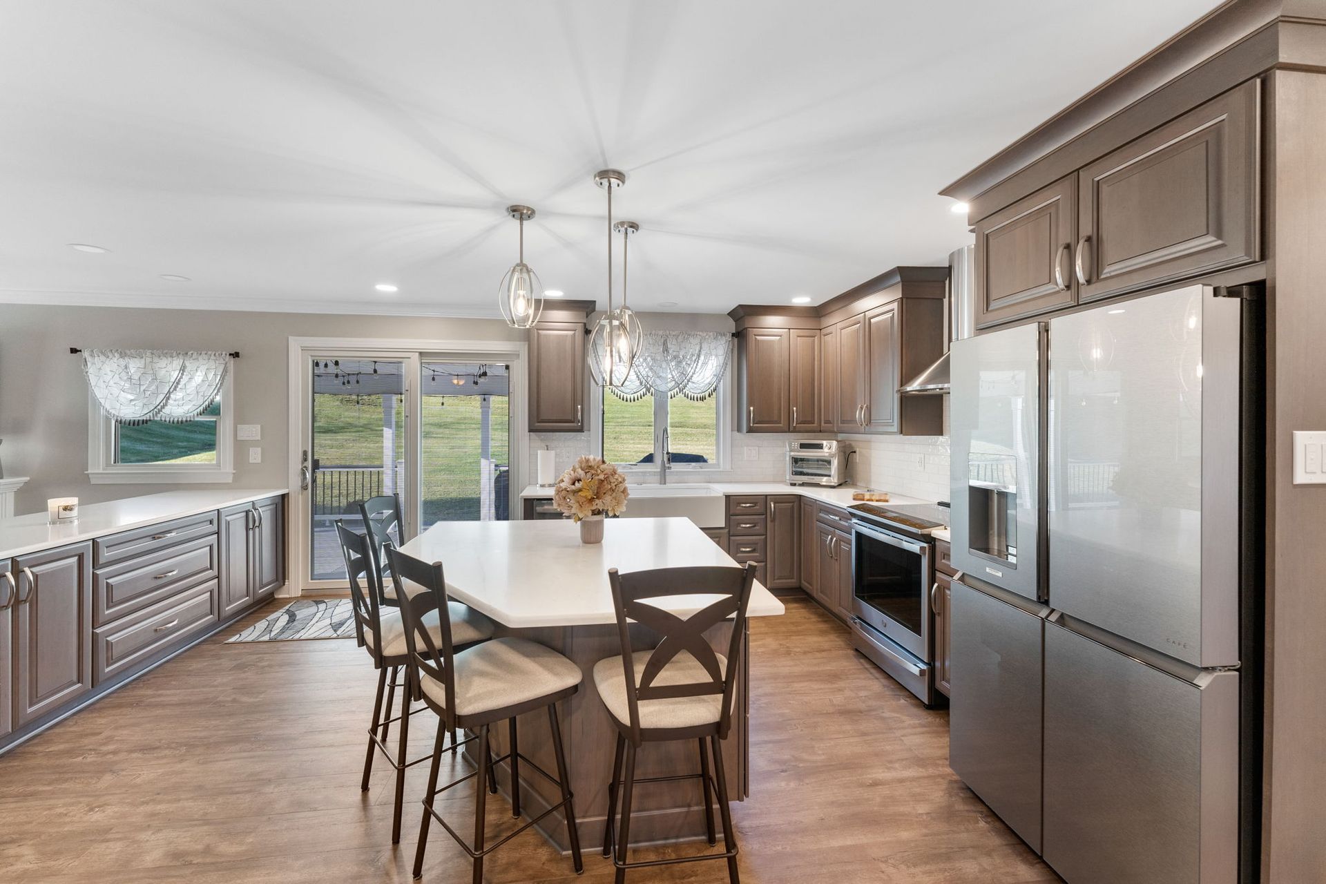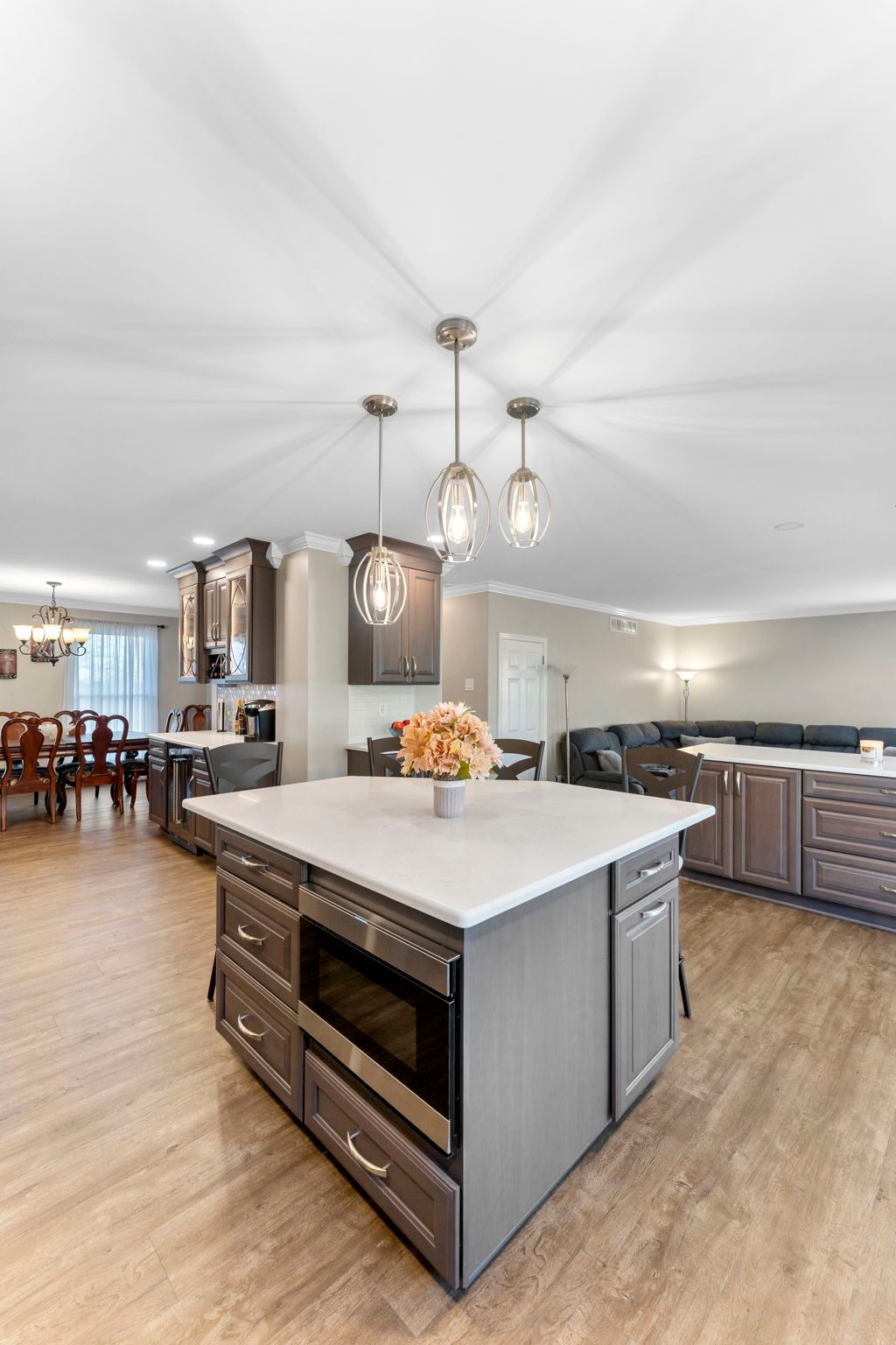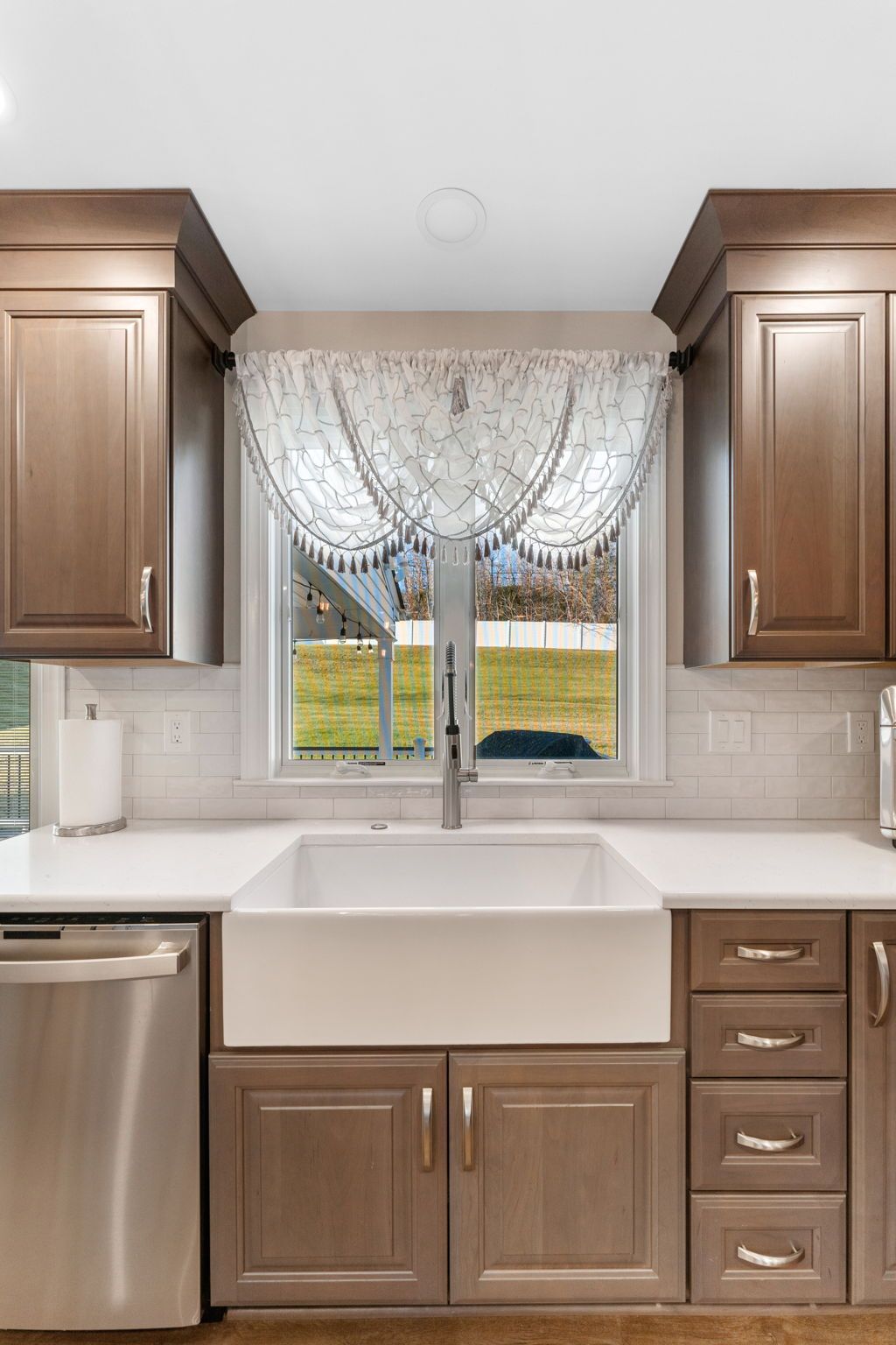 This Doylestown kitchen puts a modern spin on traditional brown cabinetry. It includes Wellborn cabinets in cherry wood with the castle finish, a Carrara quartz countertop in the color blanco, and a Denali white subway-style tile backsplash. With a rounded island and bar seating this kitchen provides a spacious cooking and dining area lit by pendants, high hats, and under-cabinet lighting. Above the stovetop is a sleek steel range, and the microwave was switched to a drawer style which now sits within the island. An apron-style white Bocchi sink blends seamlessly with the quartz countertop. A beverage bar towards the dining room includes a mini fridge and glass door cabinets, perfect for entertaining and impressing, the unique backsplash distinguishes the bar from the kitchen. A peninsula sits at the other end of the kitchen providing a barrier and place for guests between the living room.