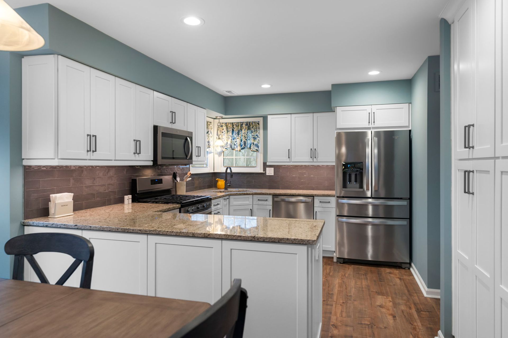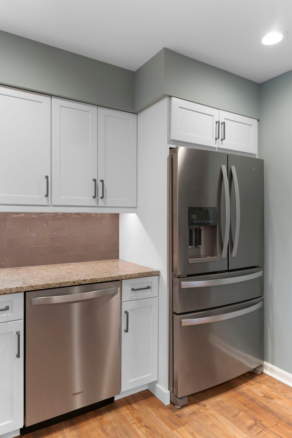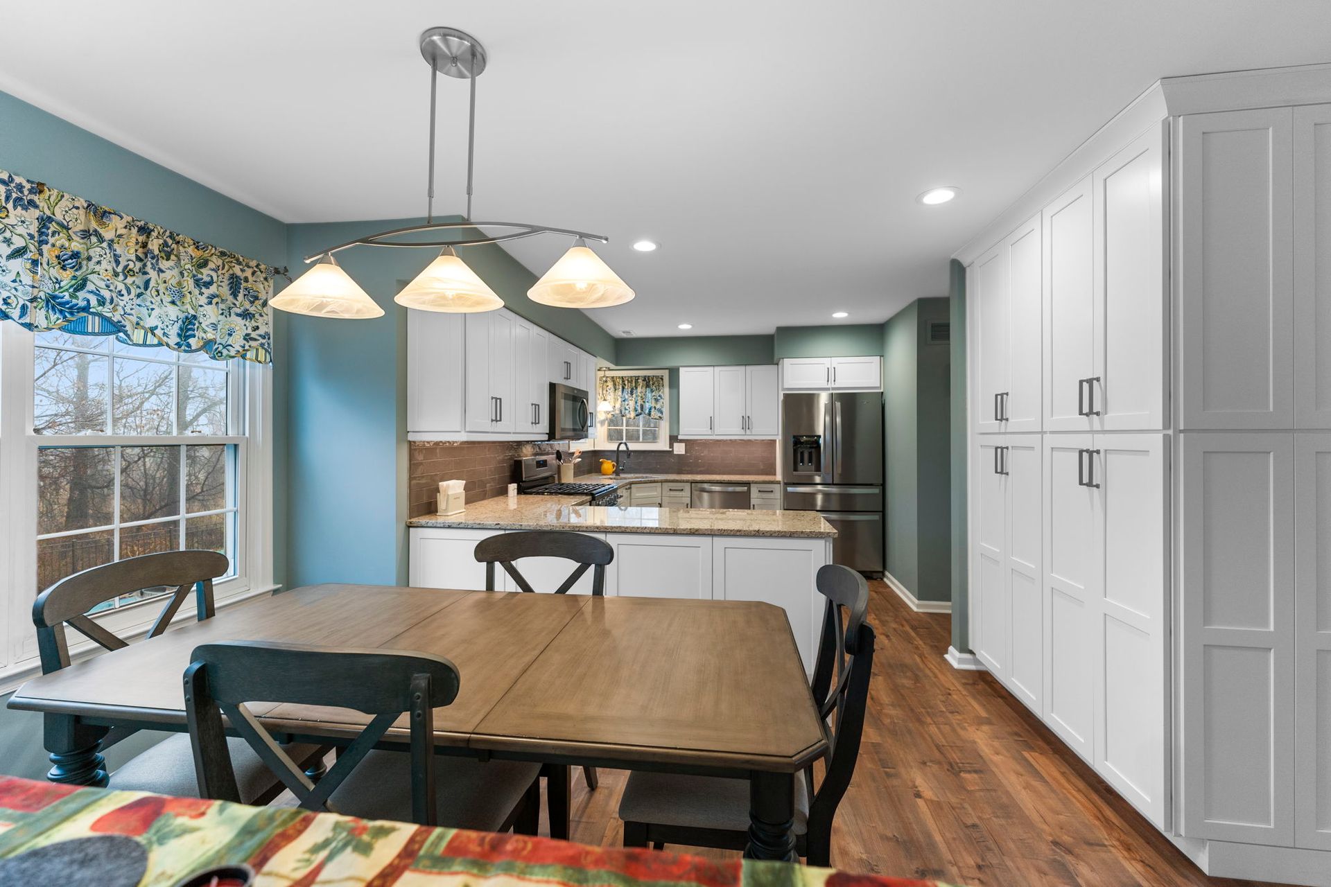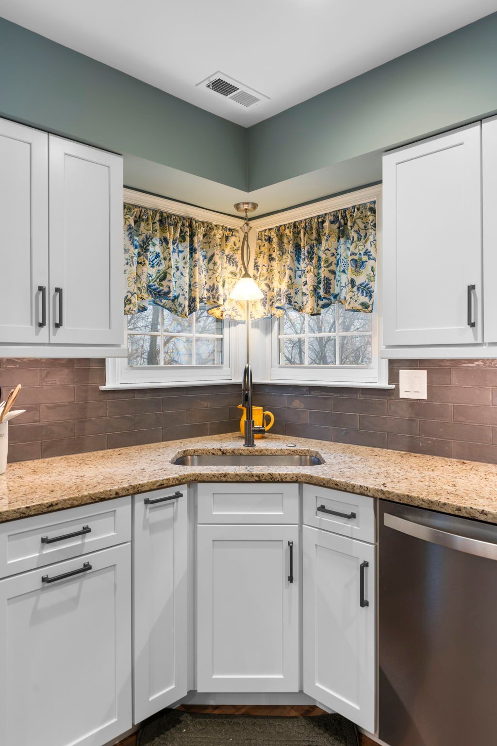 This homey kitchen uses a lot of earth tones combined with the more modern white cabinetry. The cabinets are Waypoint in painted linen. The countertop curves outward into a peninsula to create a boundary against the dining area, and is made of granite in the color giallo ornamental. The backsplash is a bit lighter than these photos show, it's MGI Mailoca taupe. These clients stayed with the classic microwave/range combination and chose a corner sink beneath the windows. The lighting includes high hats, a small pendant above the sink, and under cabinet LEDs.