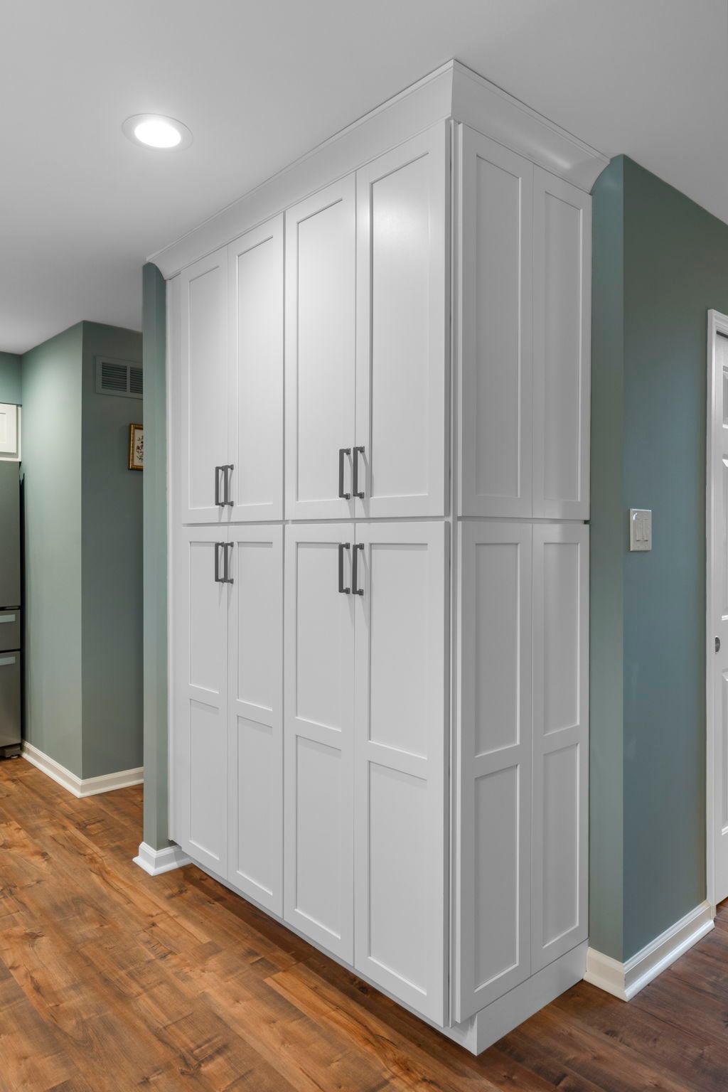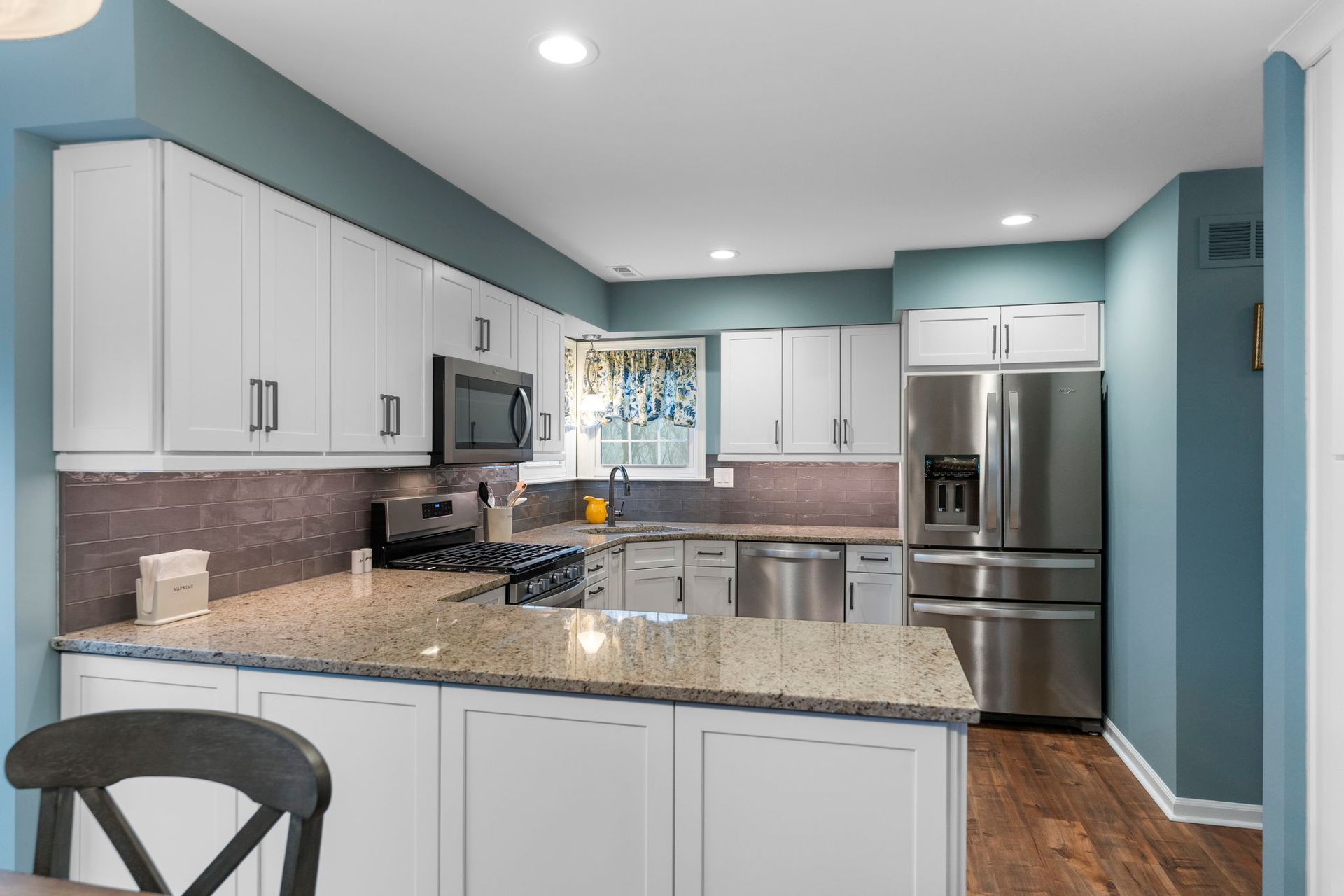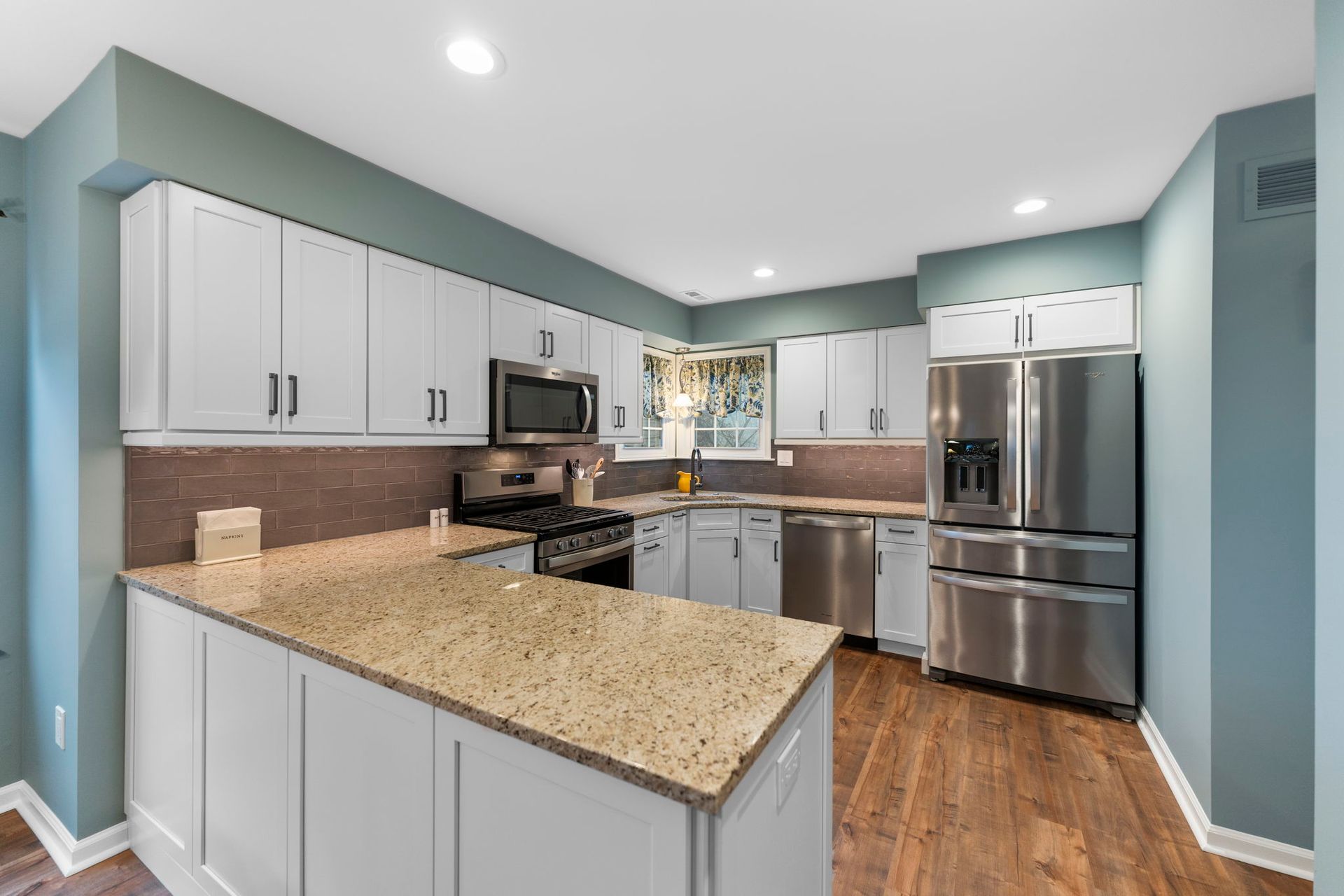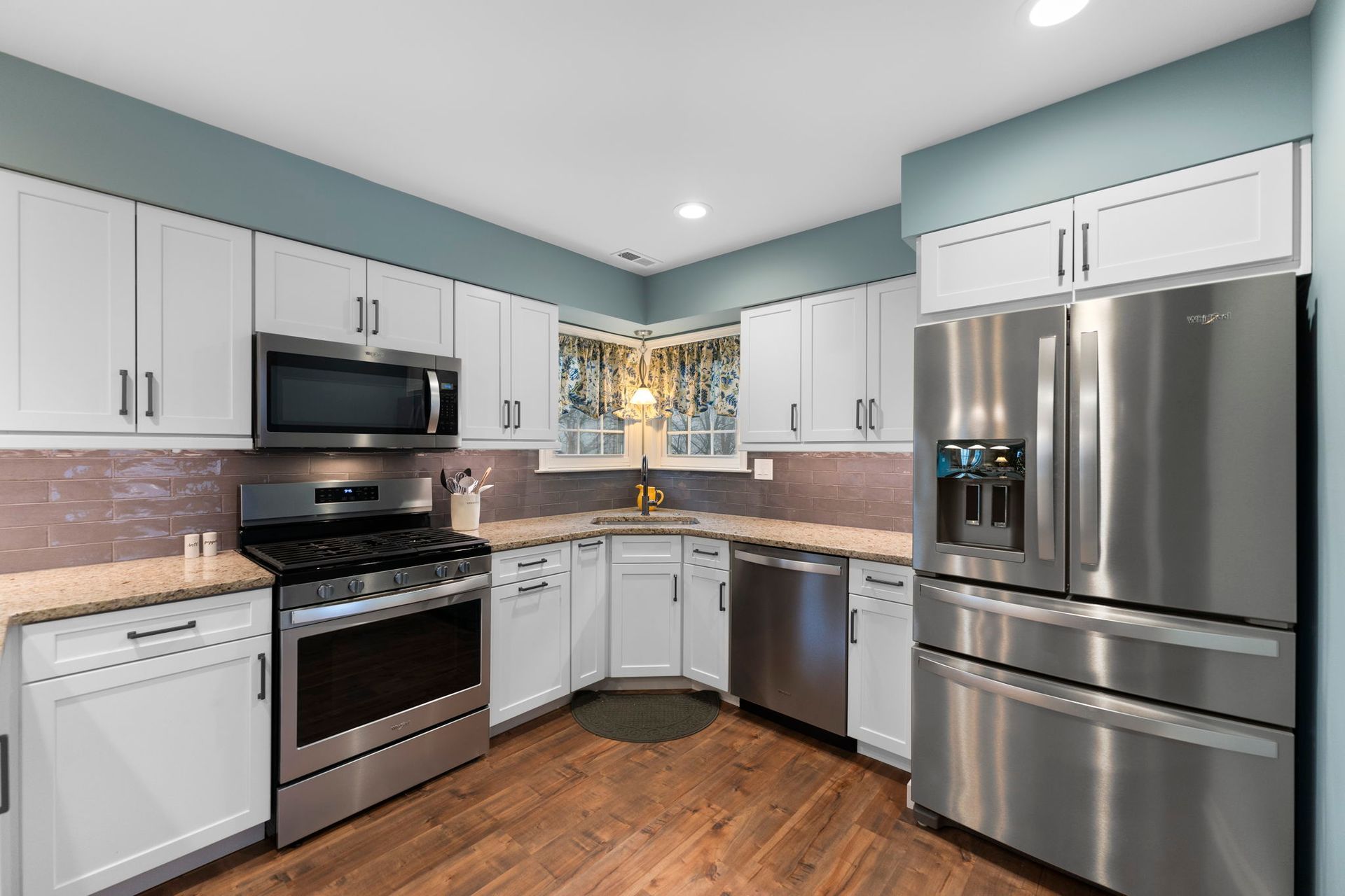 This homey kitchen uses a lot of earth tones combined with the more modern white cabinetry. The cabinets are Waypoint in painted linen. The countertop curves outward into a peninsula to create a boundary against the dining area, and is made of granite in the color giallo ornamental. The backsplash is a bit lighter than these photos show, it's MGI Mailoca taupe. These clients stayed with the classic microwave/range combination and chose a corner sink beneath the windows. The lighting includes high hats, a small pendant above the sink, and under cabinet LEDs.