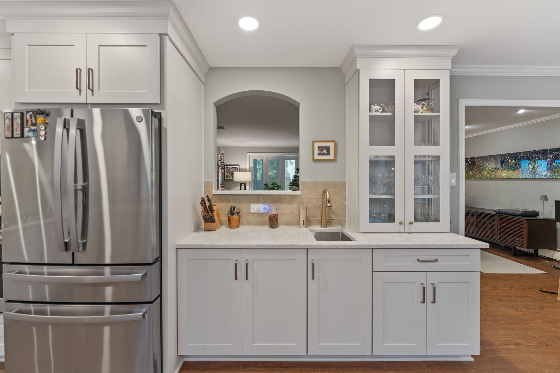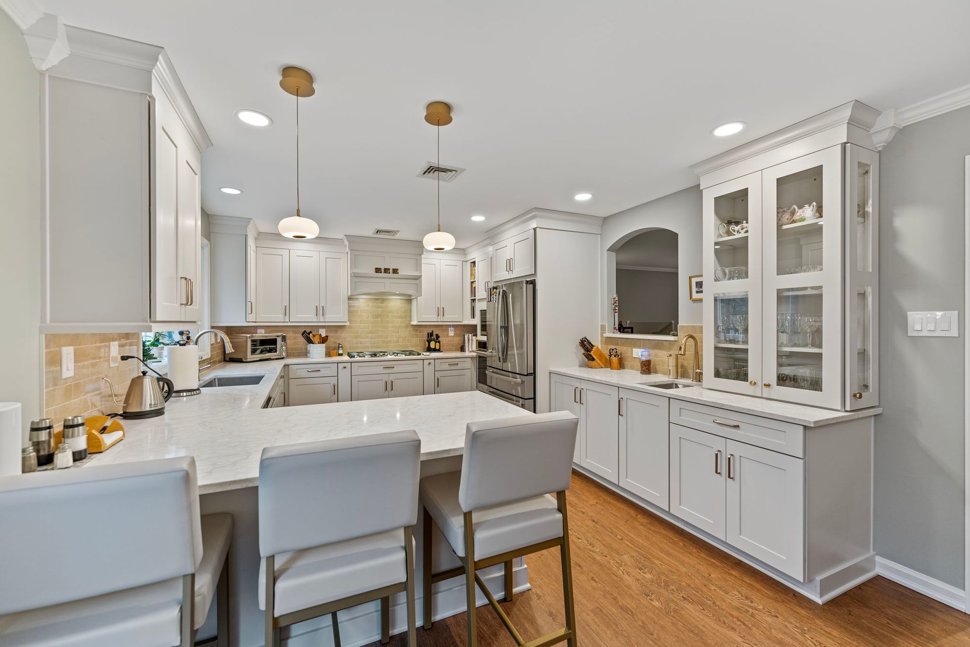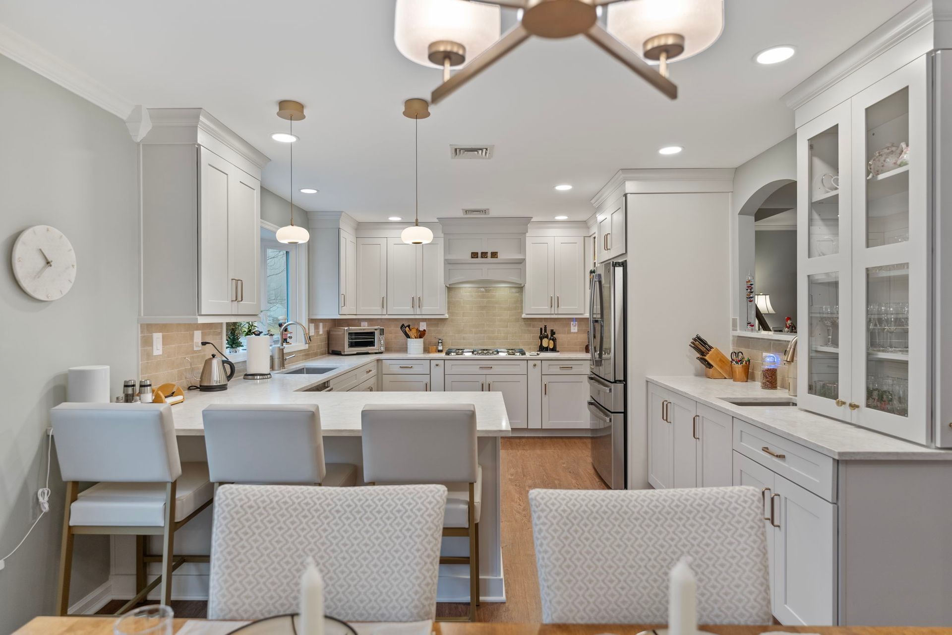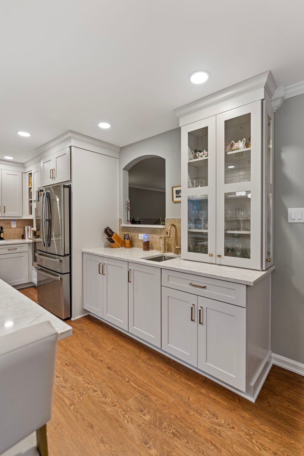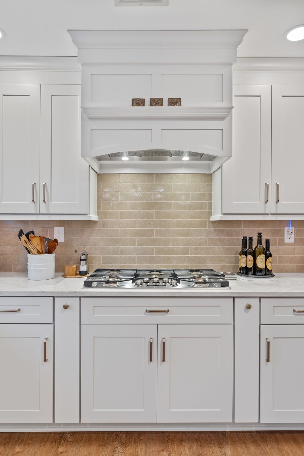 Despite white cabinets usually giving a more modern look, this kitchen appears more traditional thanks to brass hardware, a detailed wood range, and the tan brick style backsplash. The cabinets are Wellborn MDF in the finish alabaster, they encircle the kitchen and extend to the ceiling. The backsplash is Emac ceramic tile, vibrant collection in cream/ivory. Flooring is LVP supplied by the client. The countertop is Emerstone quartz in the color naica, you can see the veining on the closer pictures of the peninsula. Lighting includes pendants, high hats, and under cabinet LEDs. Other features in this kitchen are an in-wall oven and microwave next to the fridge, a glass transom cabinet tower, and a mini-sink in the bar area.