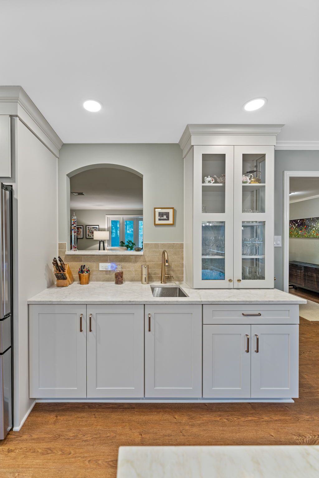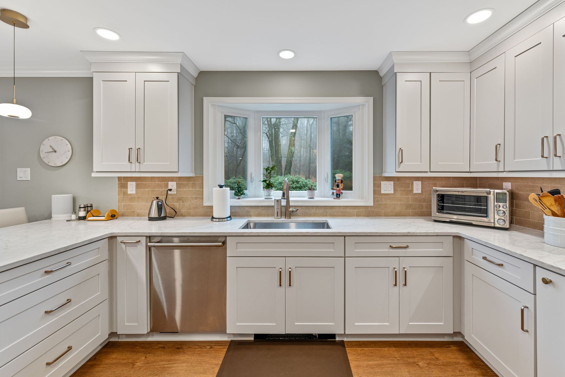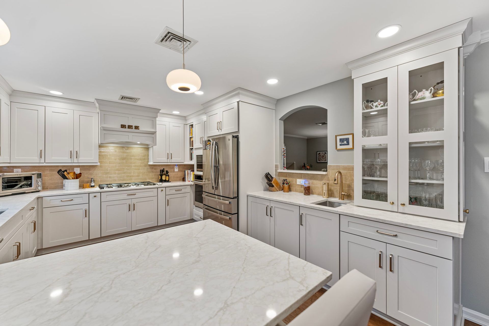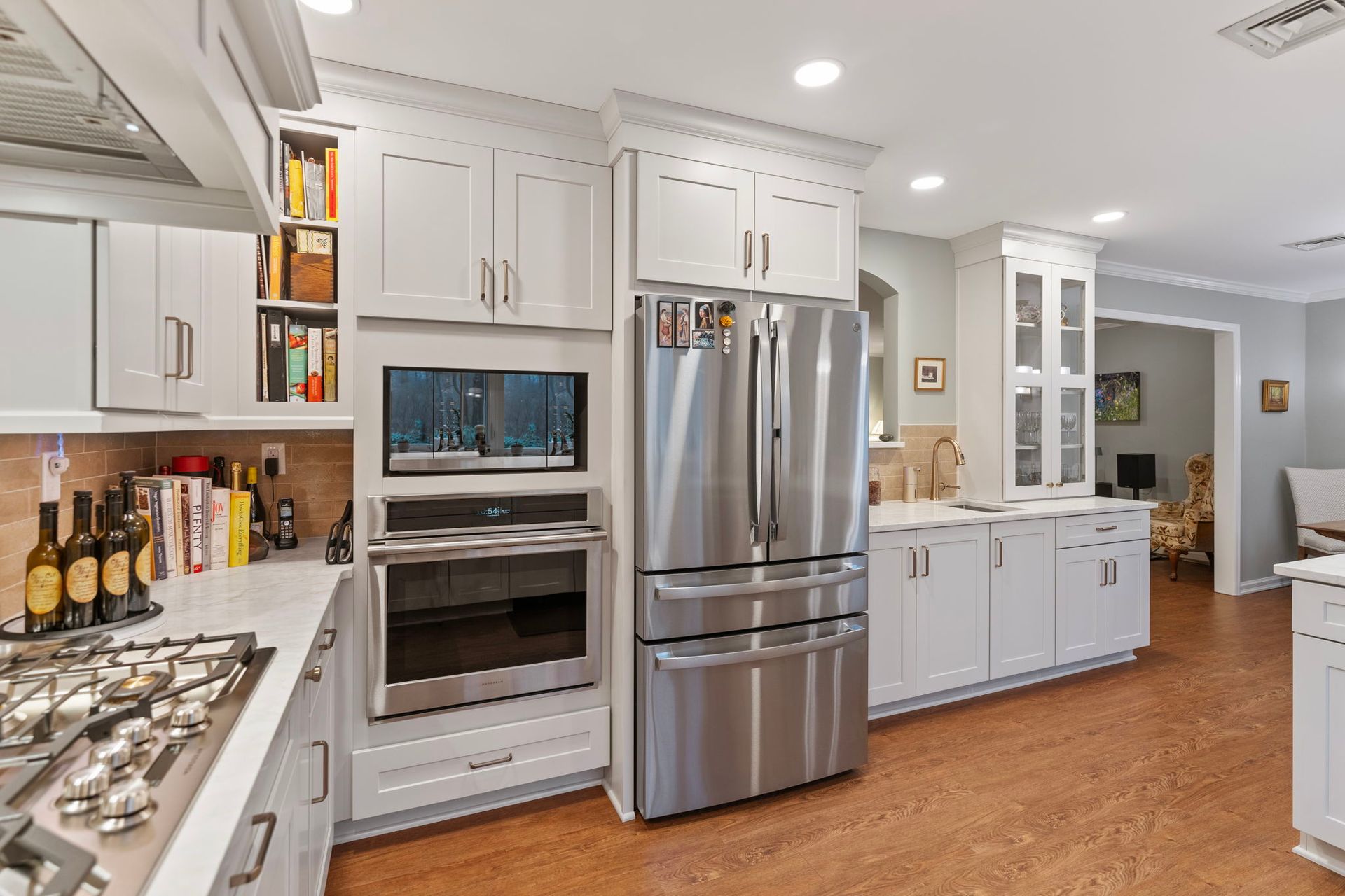 Despite white cabinets usually giving a more modern look, this kitchen appears more traditional thanks to brass hardware, a detailed wood range, and the tan brick style backsplash. The cabinets are Wellborn MDF in the finish alabaster, they encircle the kitchen and extend to the ceiling. The backsplash is Emac ceramic tile, vibrant collection in cream/ivory. Flooring is LVP supplied by the client. The countertop is Emerstone quartz in the color naica, you can see the veining on the closer pictures of the peninsula. Lighting includes pendants, high hats, and under cabinet LEDs. Other features in this kitchen are an in-wall oven and microwave next to the fridge, a glass transom cabinet tower, and a mini-sink in the bar area.