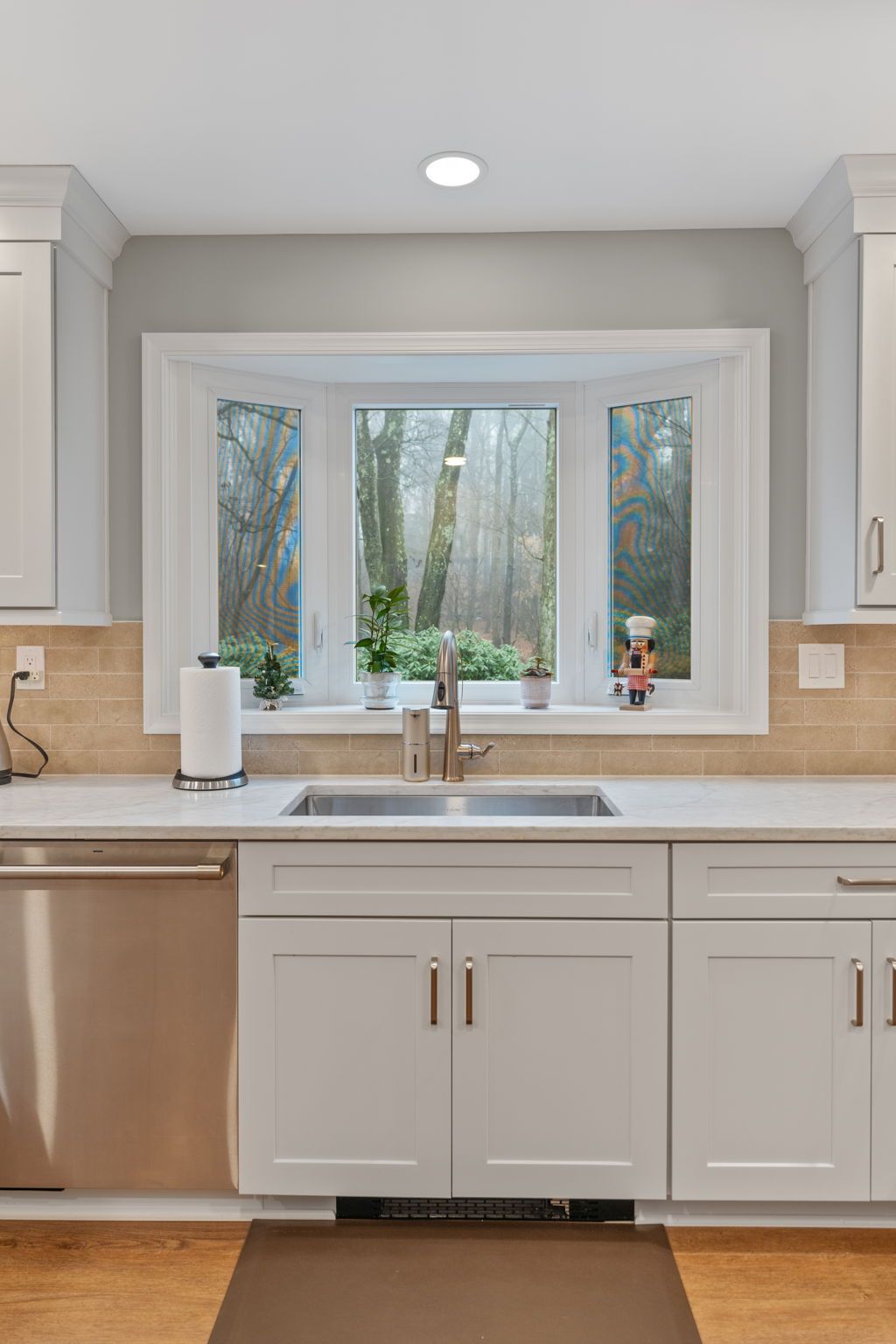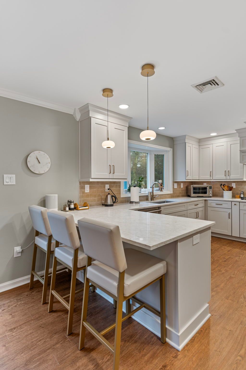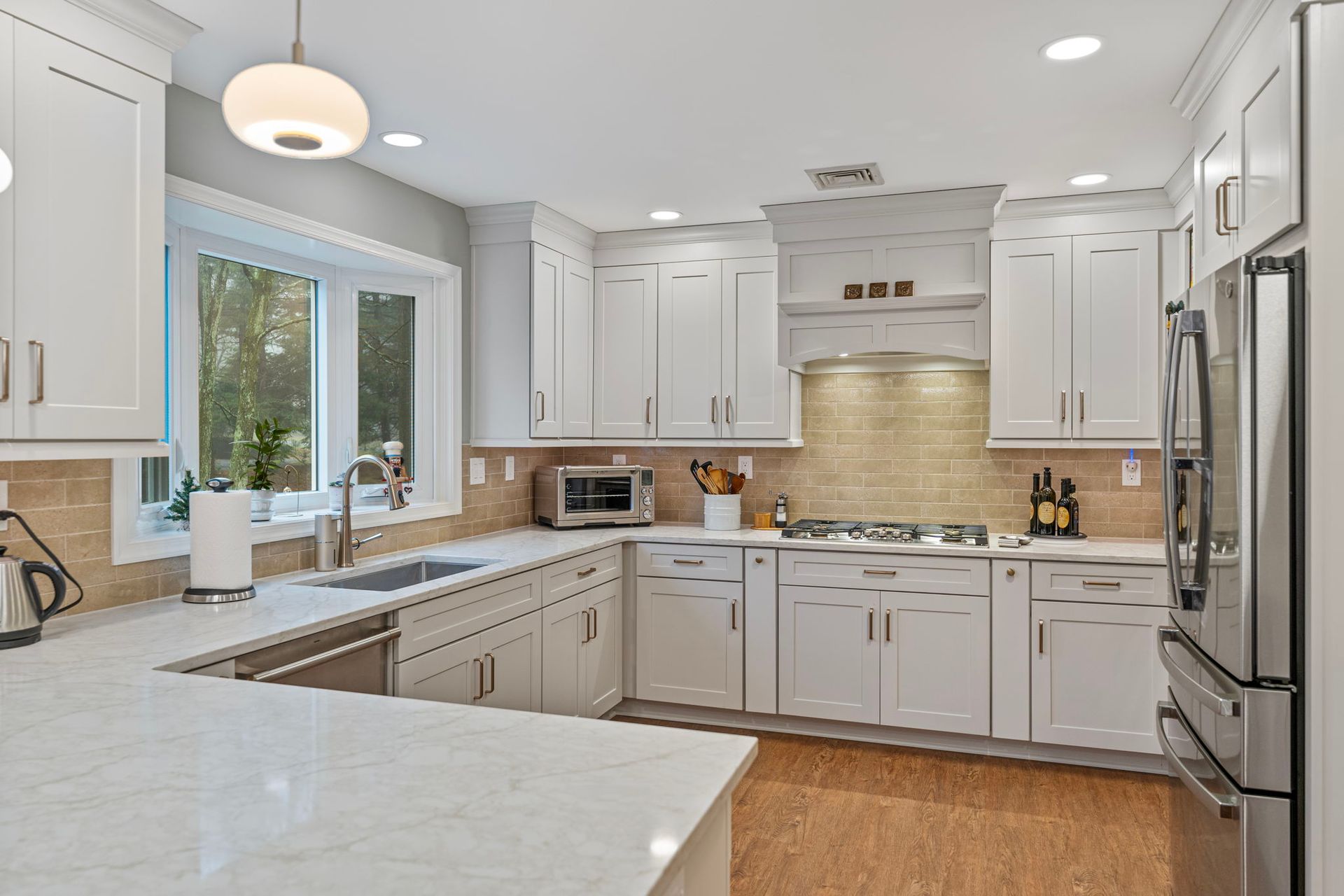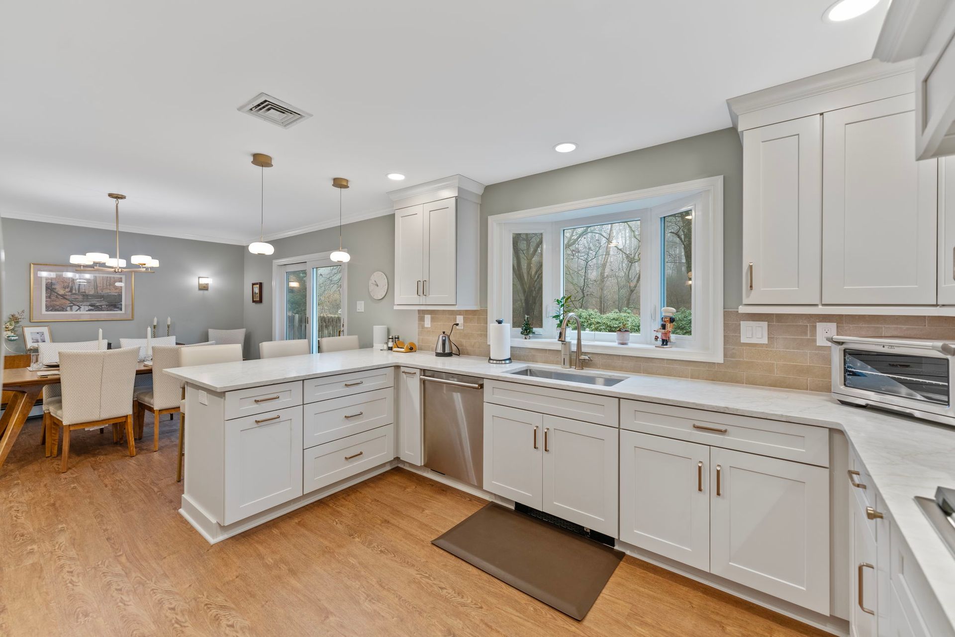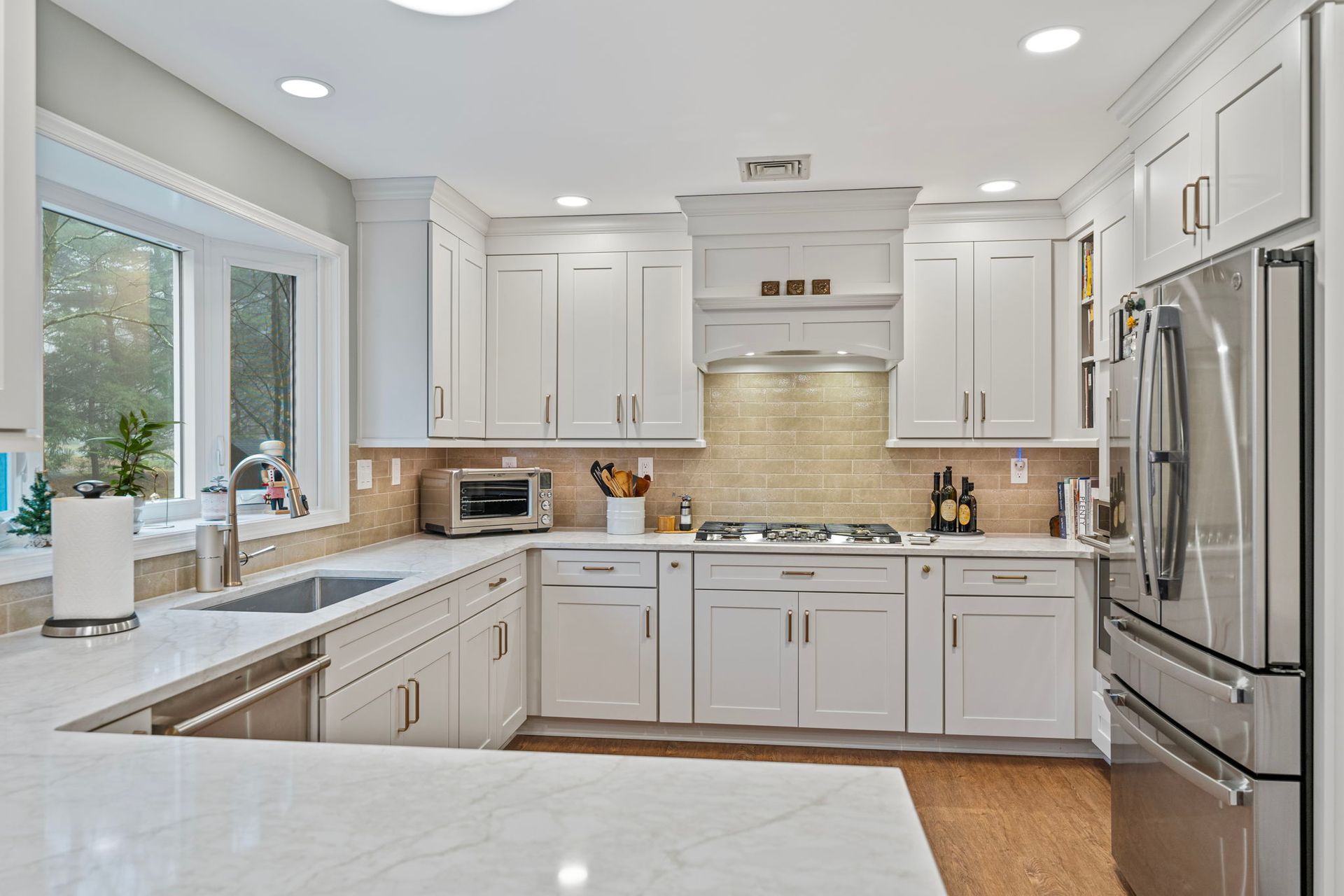 Despite white cabinets usually giving a more modern look, this kitchen appears more traditional thanks to brass hardware, a detailed wood range, and the tan brick style backsplash. The cabinets are Wellborn MDF in the finish alabaster, they encircle the kitchen and extend to the ceiling. The backsplash is Emac ceramic tile, vibrant collection in cream/ivory. Flooring is LVP supplied by the client. The countertop is Emerstone quartz in the color naica, you can see the veining on the closer pictures of the peninsula. Lighting includes pendants, high hats, and under cabinet LEDs. Other features in this kitchen are an in-wall oven and microwave next to the fridge, a glass transom cabinet tower, and a mini-sink in the bar area.