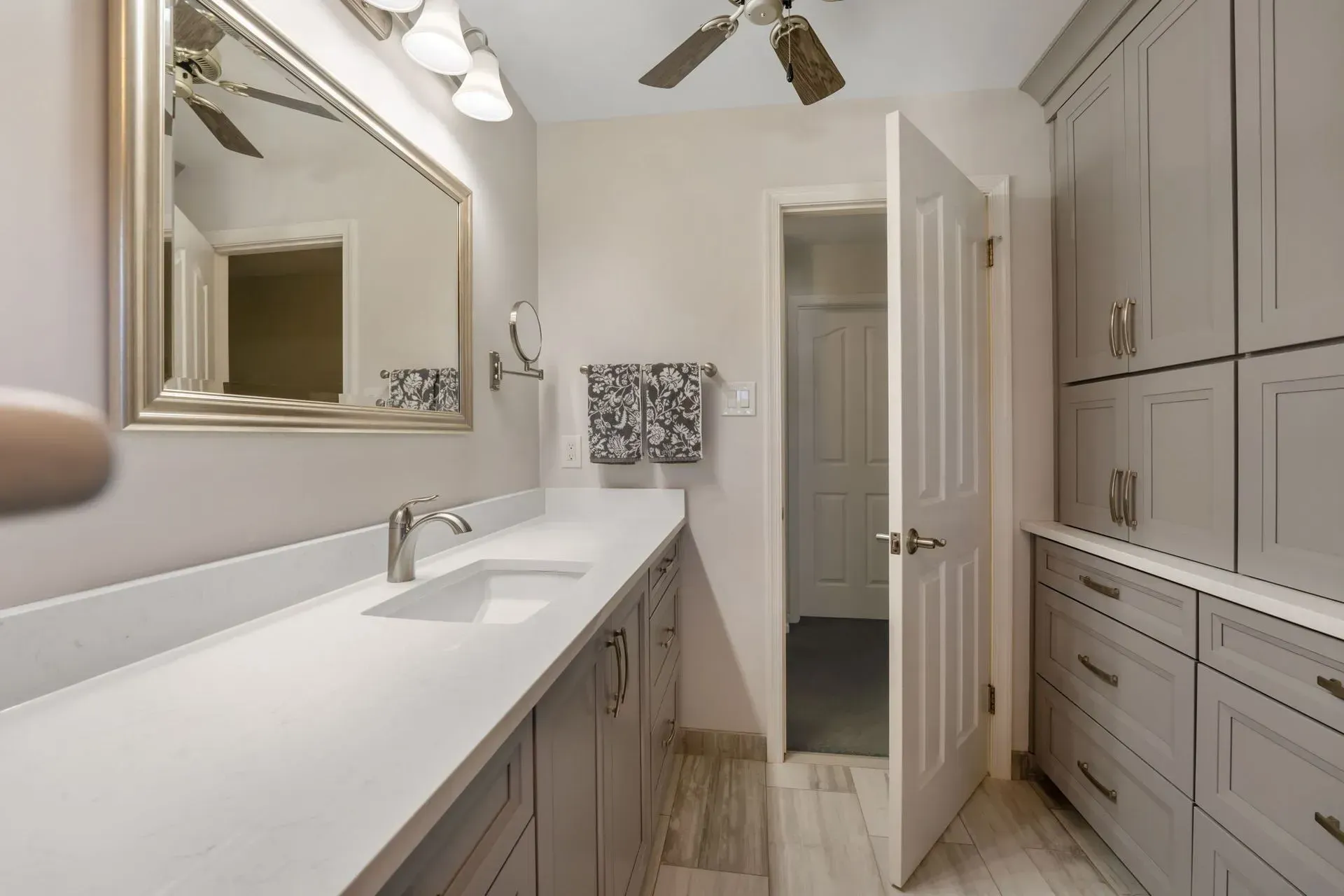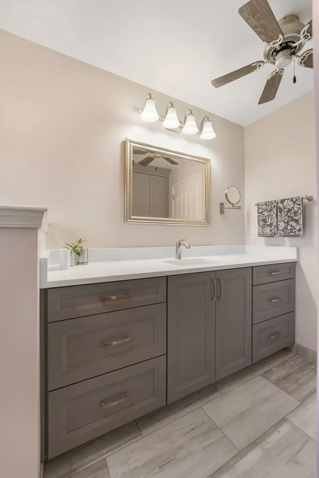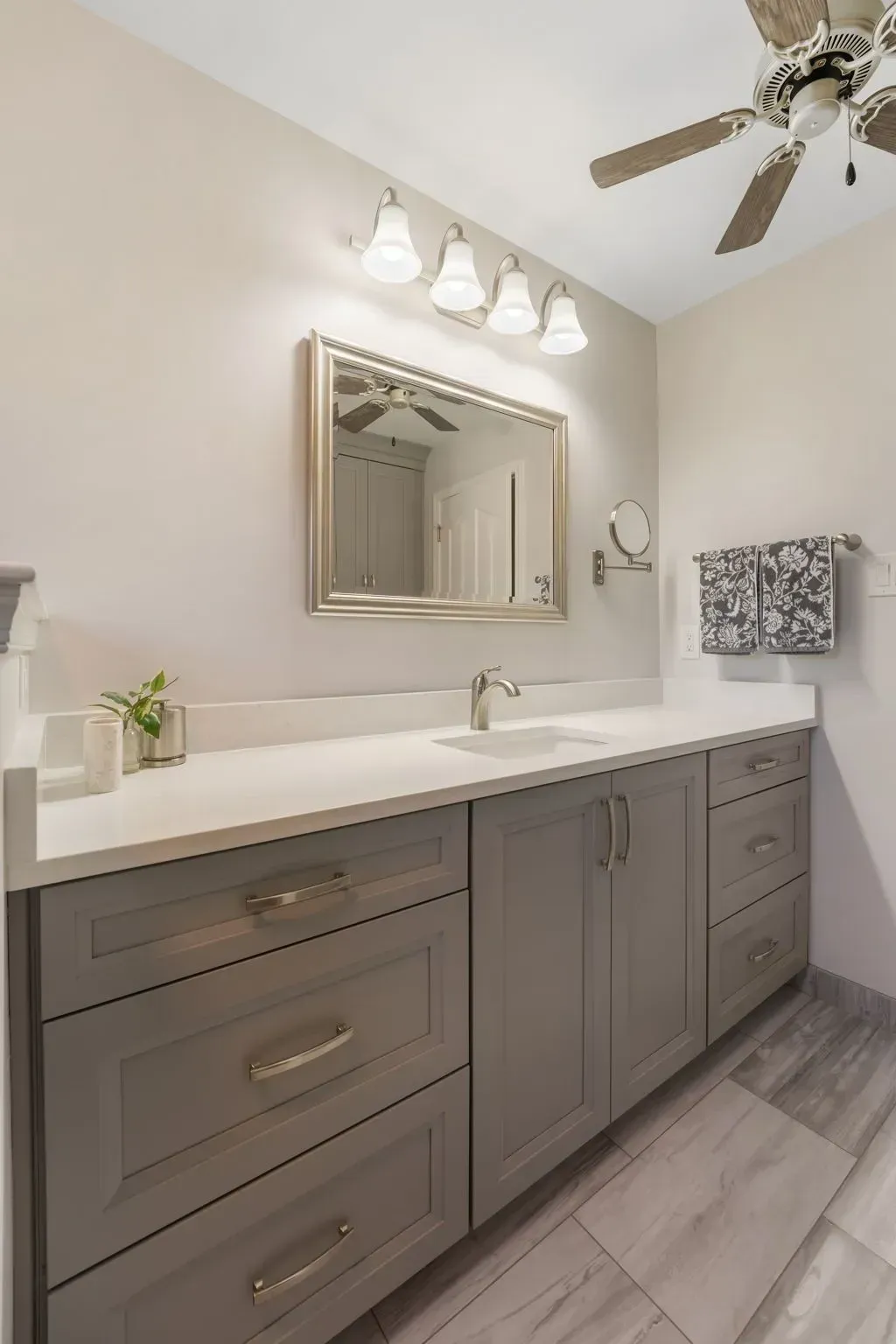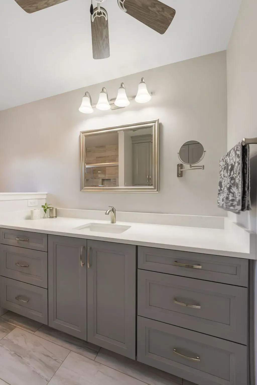 A clean, elegant bathroom for those looking for an upgrade. The vanity and storage cabinets are all Waypoint painted stone, the lighting has the effect of making them seem like different colors. The countertop is GFO quartz in the style Bianco Cararra, it has a raised backsplash for easier cleaning and there's a small quartz ledge on the storage cabinets as well. The shower is Lint tile, Narawood in polished gray, there's a small alcove in the middle and three corner shelves for product storage. The shower pan is cast iron with nonslip markings, which is unique because most people go with acrylic. Another original addition is the small extendable makeup mirror on the right side of the main mirror. Lighting includes the vanity light and the ceiling fan. The flooring is the same tile as the shower but with a matte finish instead. This project is the perfect intersection between attractive and practical.