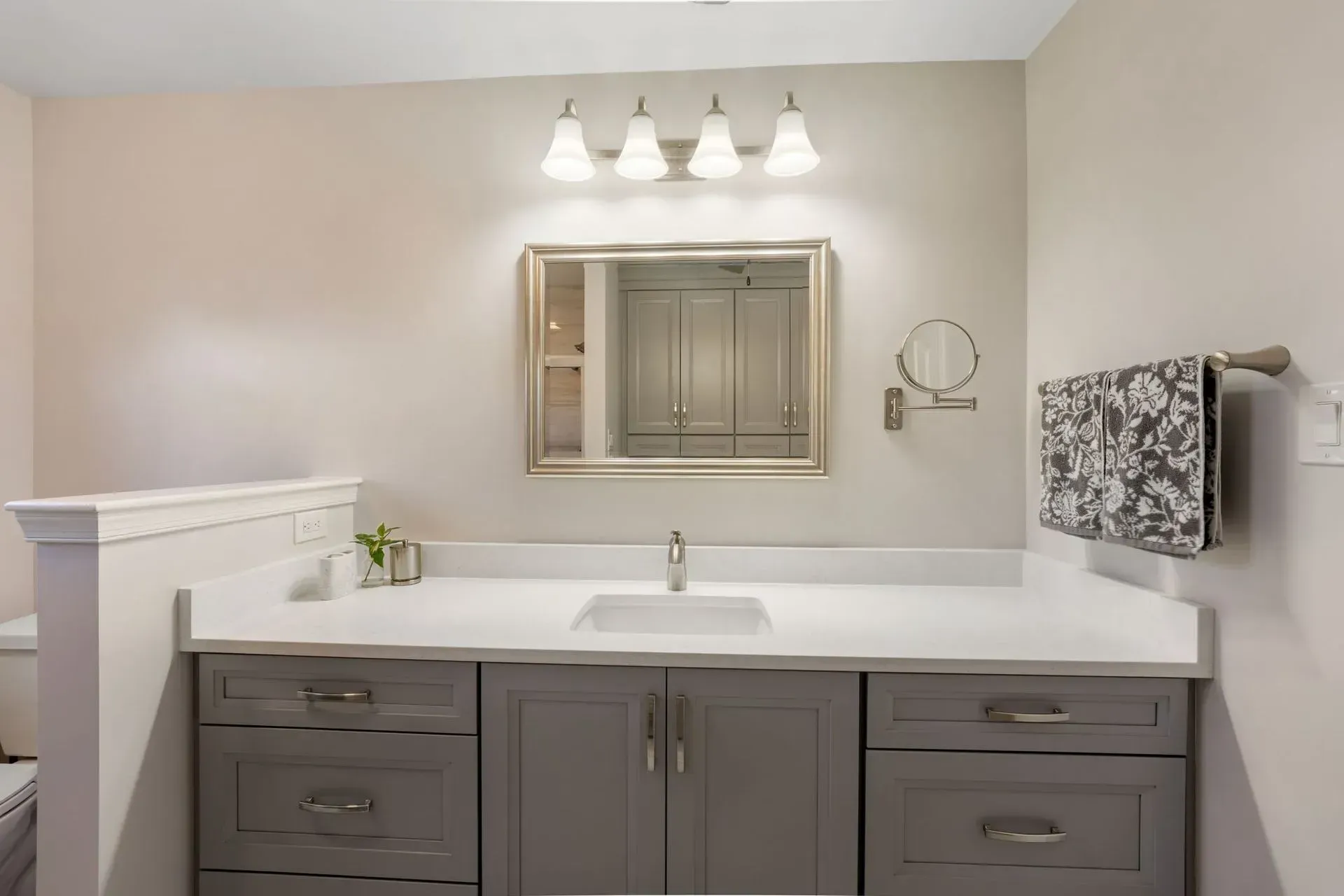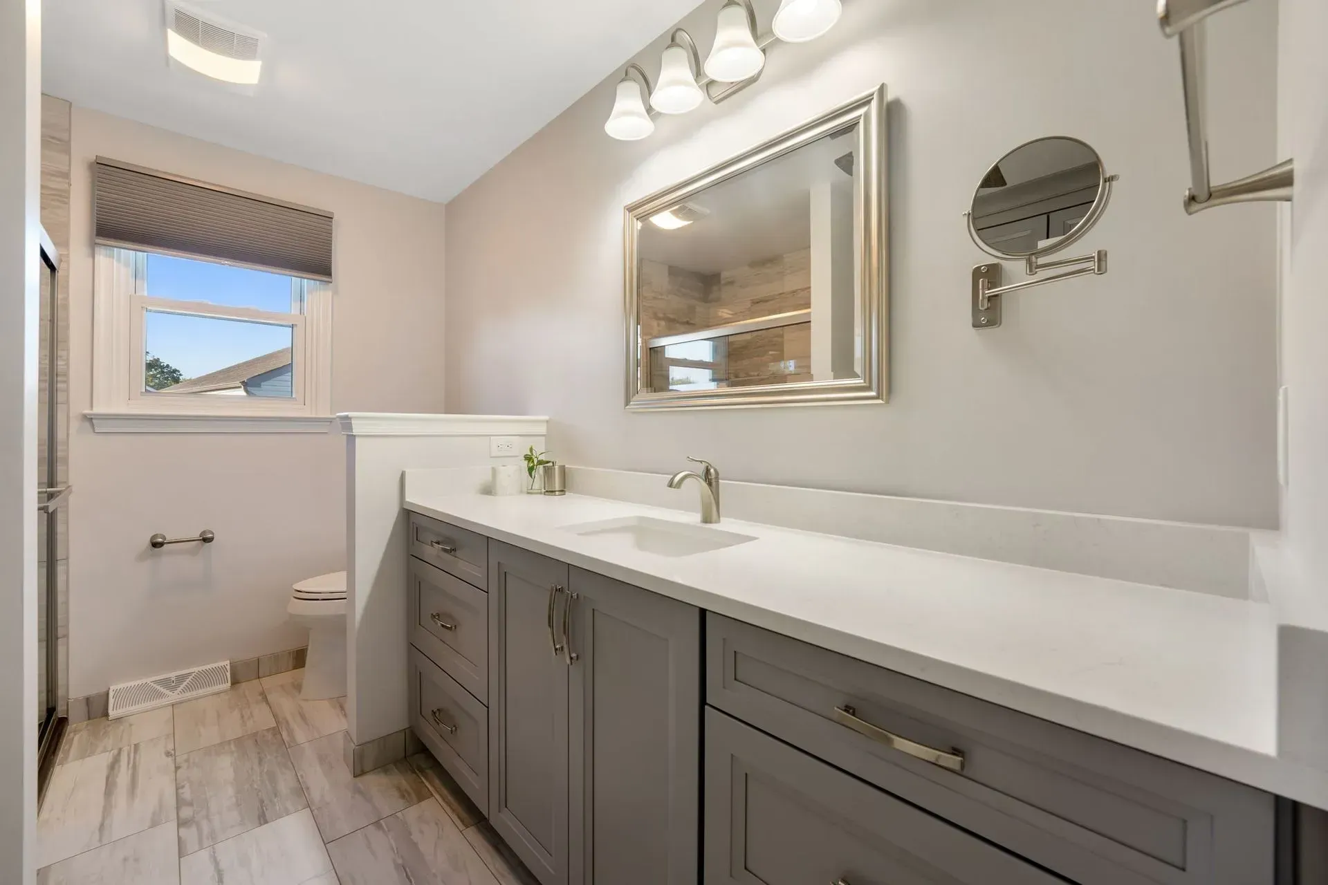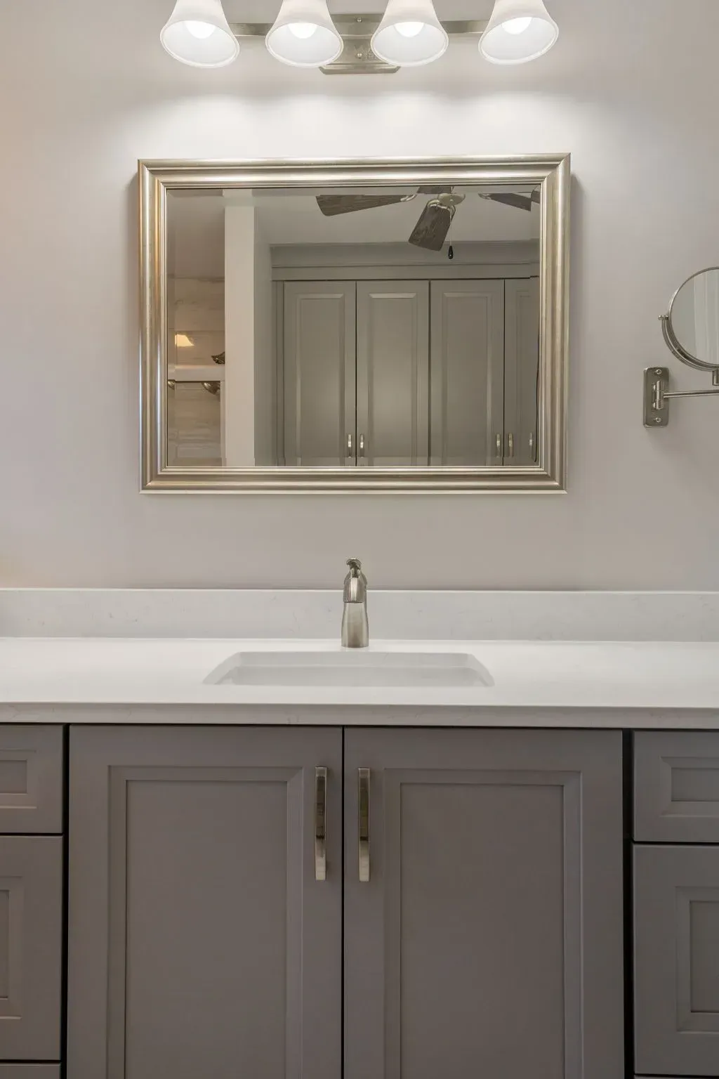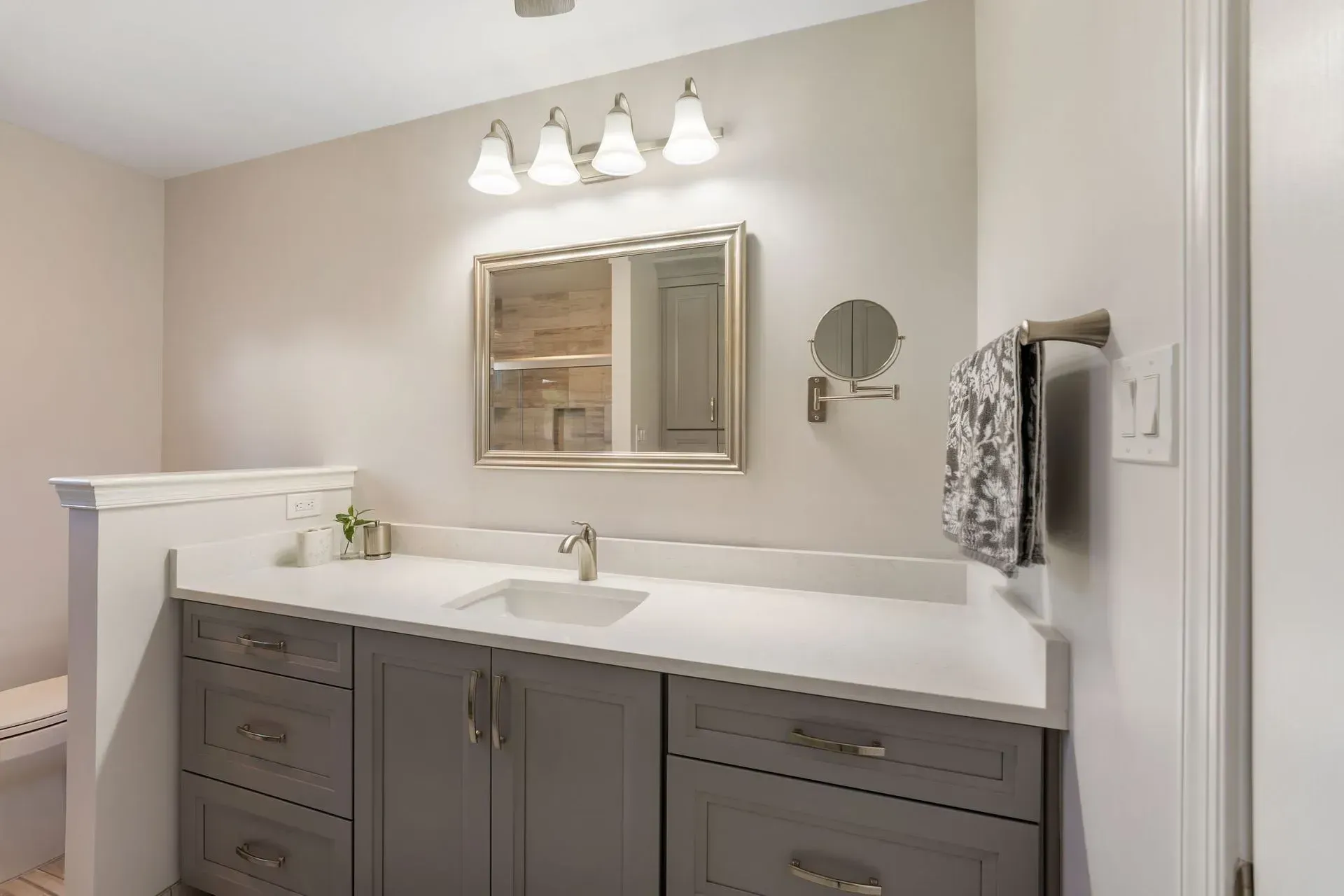 A clean, elegant bathroom for those looking for an upgrade. The vanity and storage cabinets are all Waypoint painted stone, the lighting has the effect of making them seem like different colors. The countertop is GFO quartz in the style Bianco Cararra, it has a raised backsplash for easier cleaning and there's a small quartz ledge on the storage cabinets as well. The shower is Lint tile, Narawood in polished gray, there's a small alcove in the middle and three corner shelves for product storage. The shower pan is cast iron with nonslip markings, which is unique because most people go with acrylic. Another original addition is the small extendable makeup mirror on the right side of the main mirror. Lighting includes the vanity light and the ceiling fan. The flooring is the same tile as the shower but with a matte finish instead. This project is the perfect intersection between attractive and practical.