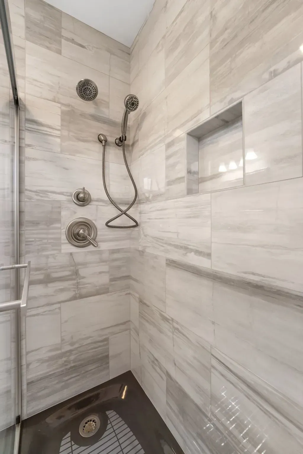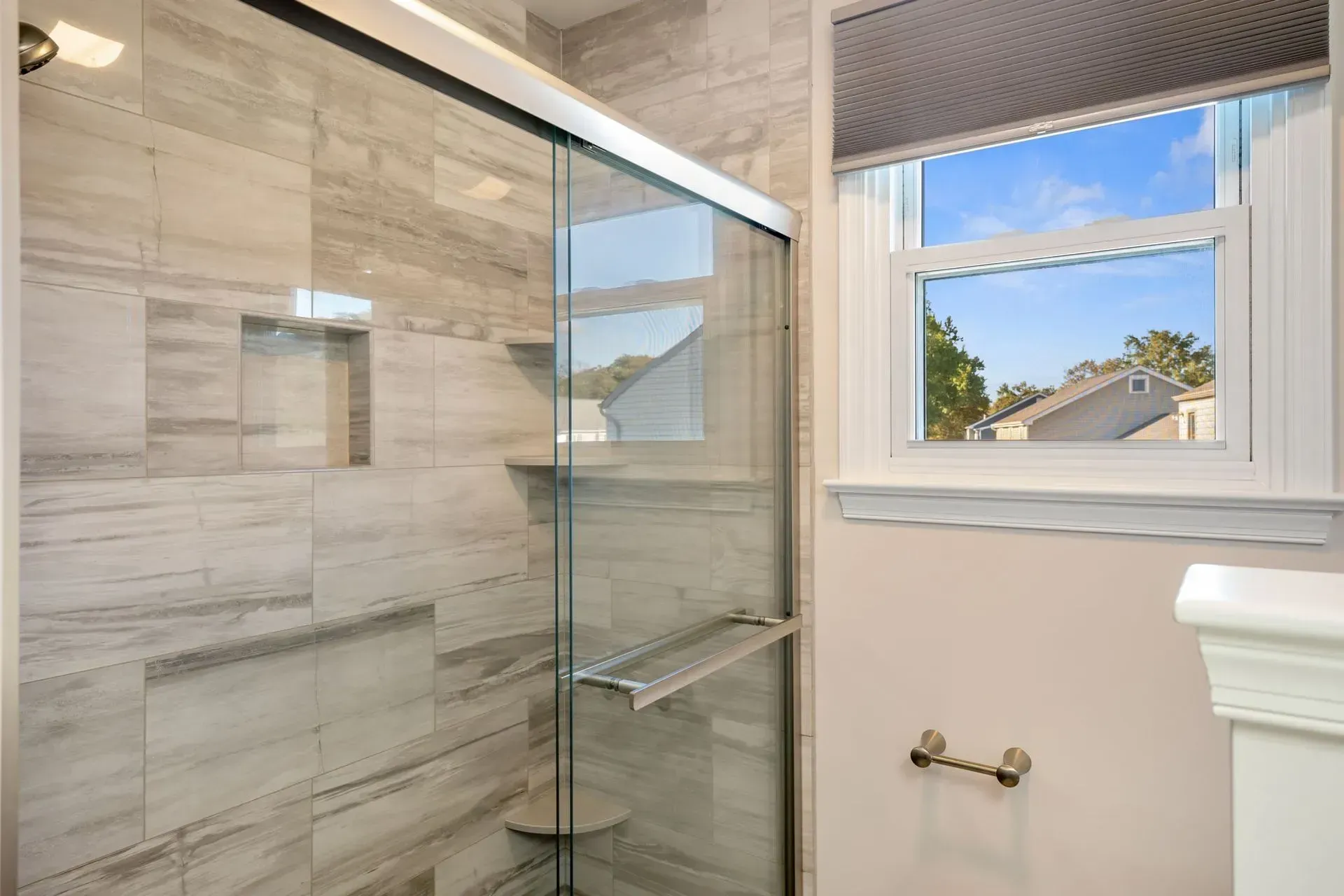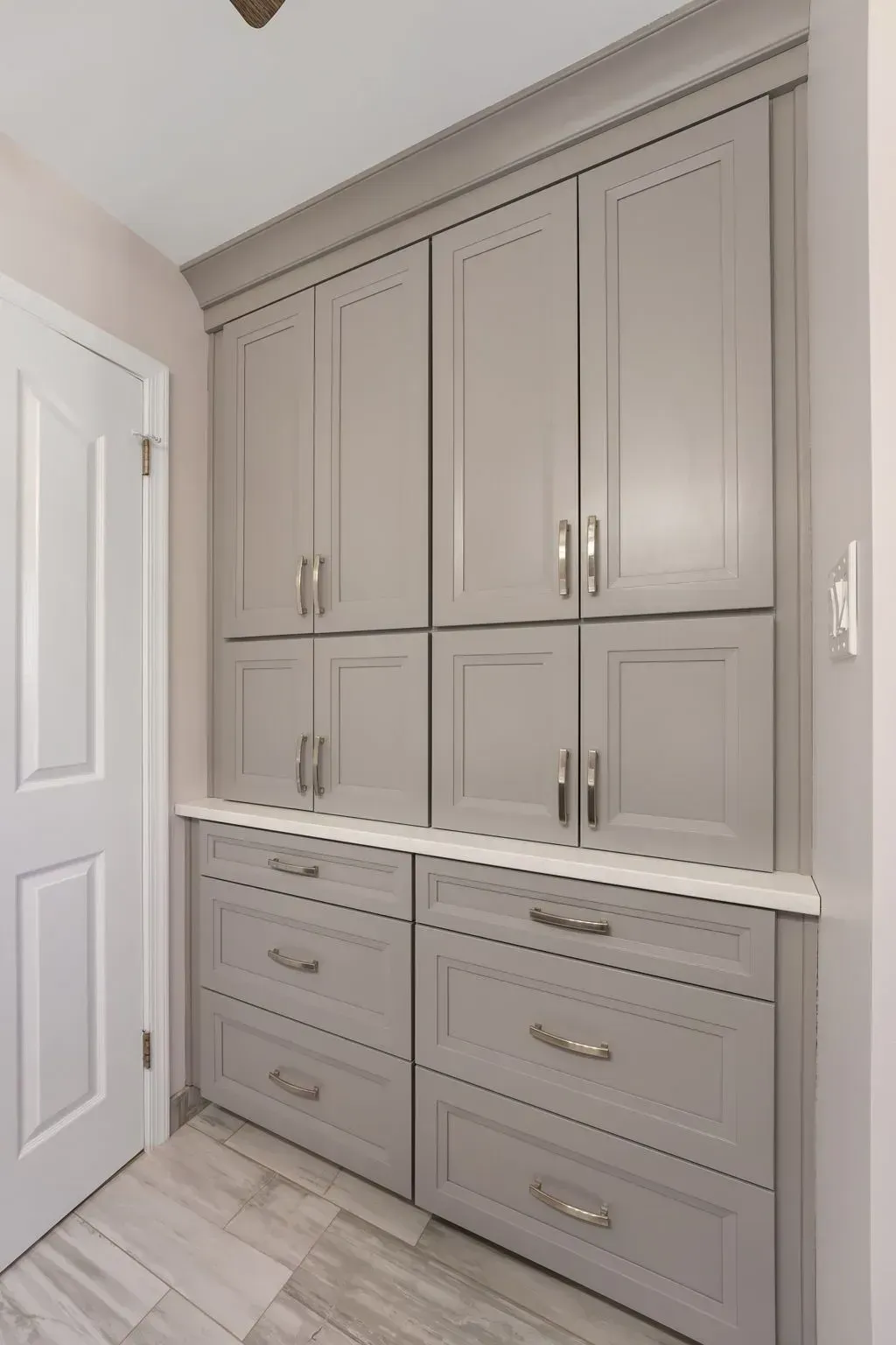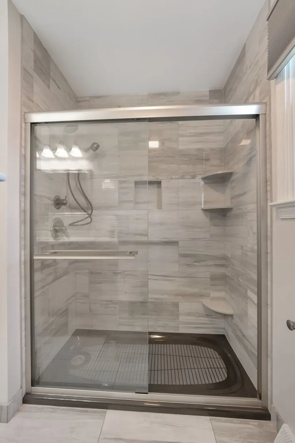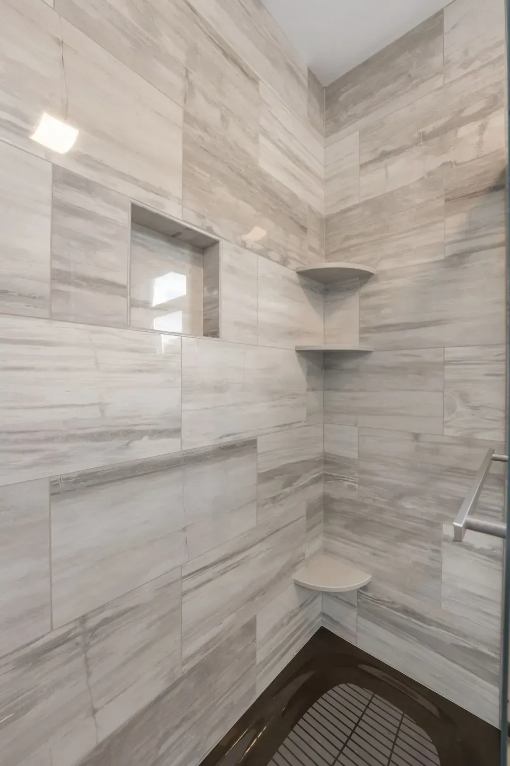 A clean, elegant bathroom for those looking for an upgrade. The vanity and storage cabinets are all Waypoint painted stone, the lighting has the effect of making them seem like different colors. The countertop is GFO quartz in the style Bianco Cararra, it has a raised backsplash for easier cleaning and there's a small quartz ledge on the storage cabinets as well. The shower is Lint tile, Narawood in polished gray, there's a small alcove in the middle and three corner shelves for product storage. The shower pan is cast iron with nonslip markings, which is unique because most people go with acrylic. Another original addition is the small extendable makeup mirror on the right side of the main mirror. Lighting includes the vanity light and the ceiling fan. The flooring is the same tile as the shower but with a matte finish instead. This project is the perfect intersection between attractive and practical.