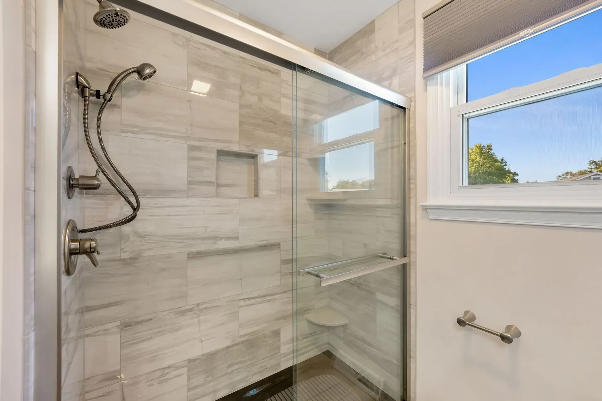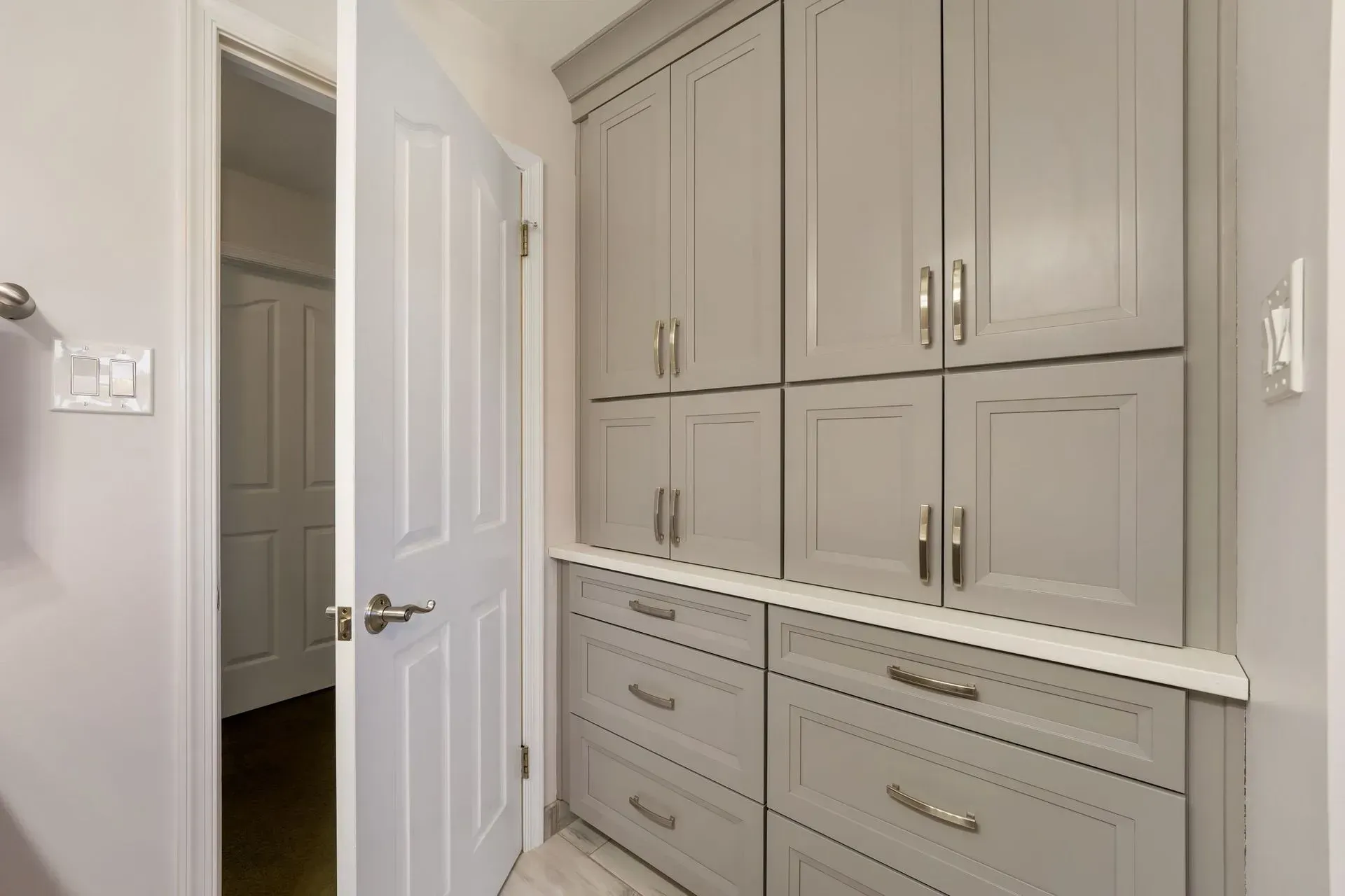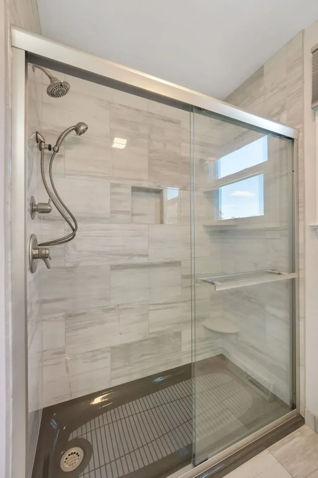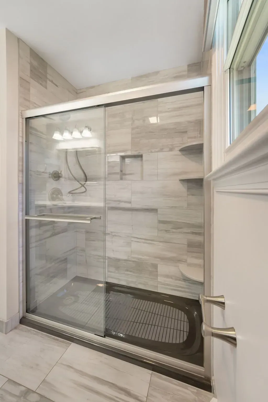 A clean, elegant bathroom for those looking for an upgrade. The vanity and storage cabinets are all Waypoint painted stone, the lighting has the effect of making them seem like different colors. The countertop is GFO quartz in the style Bianco Cararra, it has a raised backsplash for easier cleaning and there's a small quartz ledge on the storage cabinets as well. The shower is Lint tile, Narawood in polished gray, there's a small alcove in the middle and three corner shelves for product storage. The shower pan is cast iron with nonslip markings, which is unique because most people go with acrylic. Another original addition is the small extendable makeup mirror on the right side of the main mirror. Lighting includes the vanity light and the ceiling fan. The flooring is the same tile as the shower but with a matte finish instead. This project is the perfect intersection between attractive and practical.