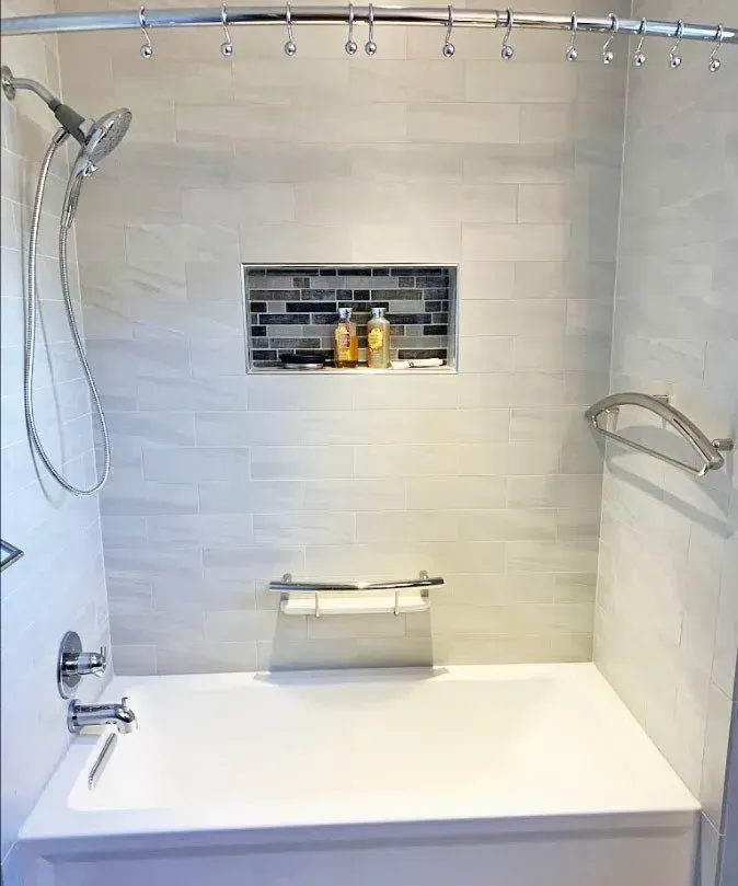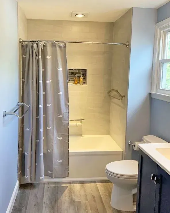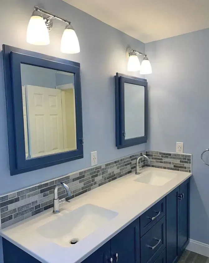 This Hall Bathroom in Harleysville, PA was updated with Omega Dynasty cabinets in Blue Lagoon, corian countertops with 2 square integrated sinks, chrome faucets, tile backsplash and luxury vinyl tile floor.