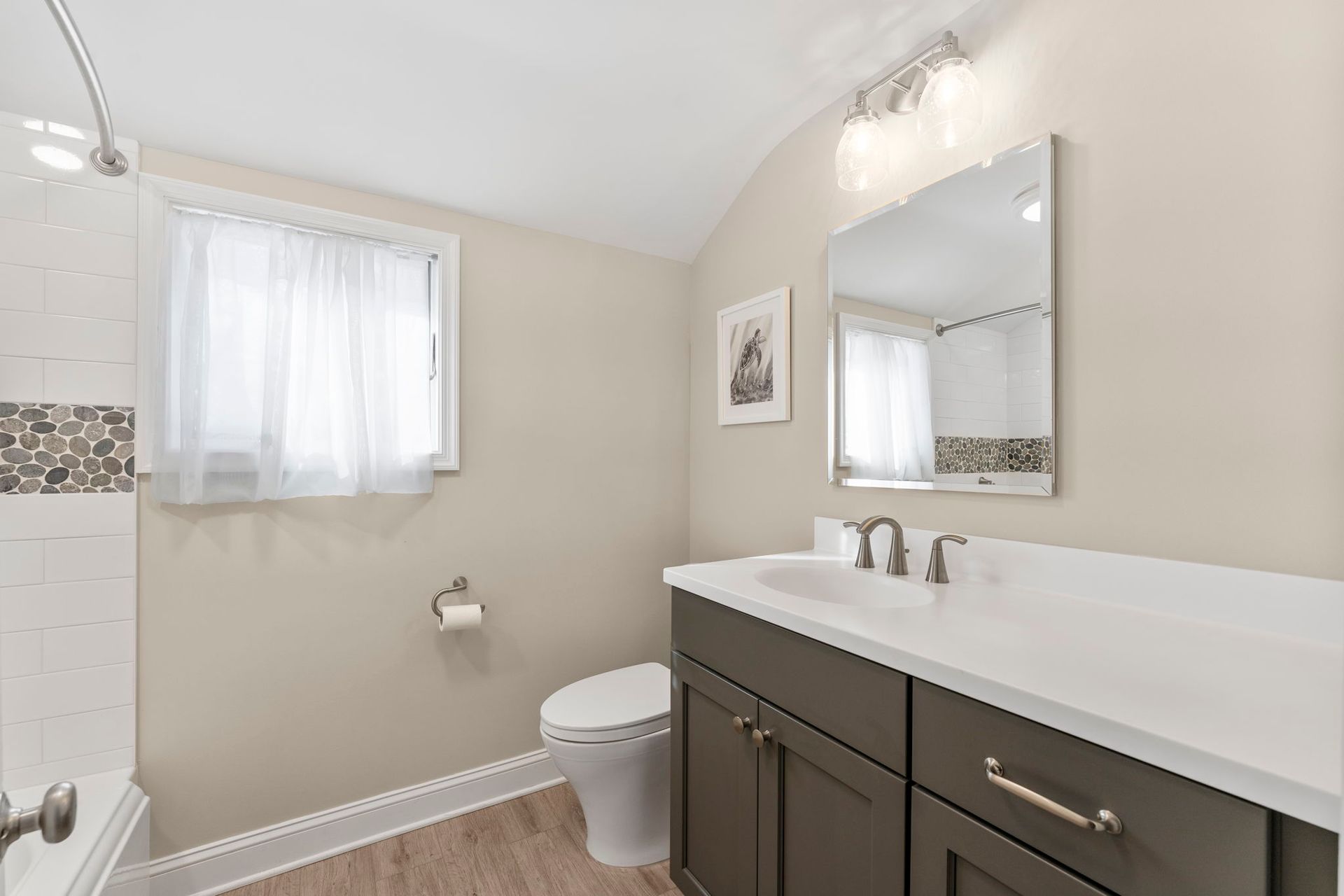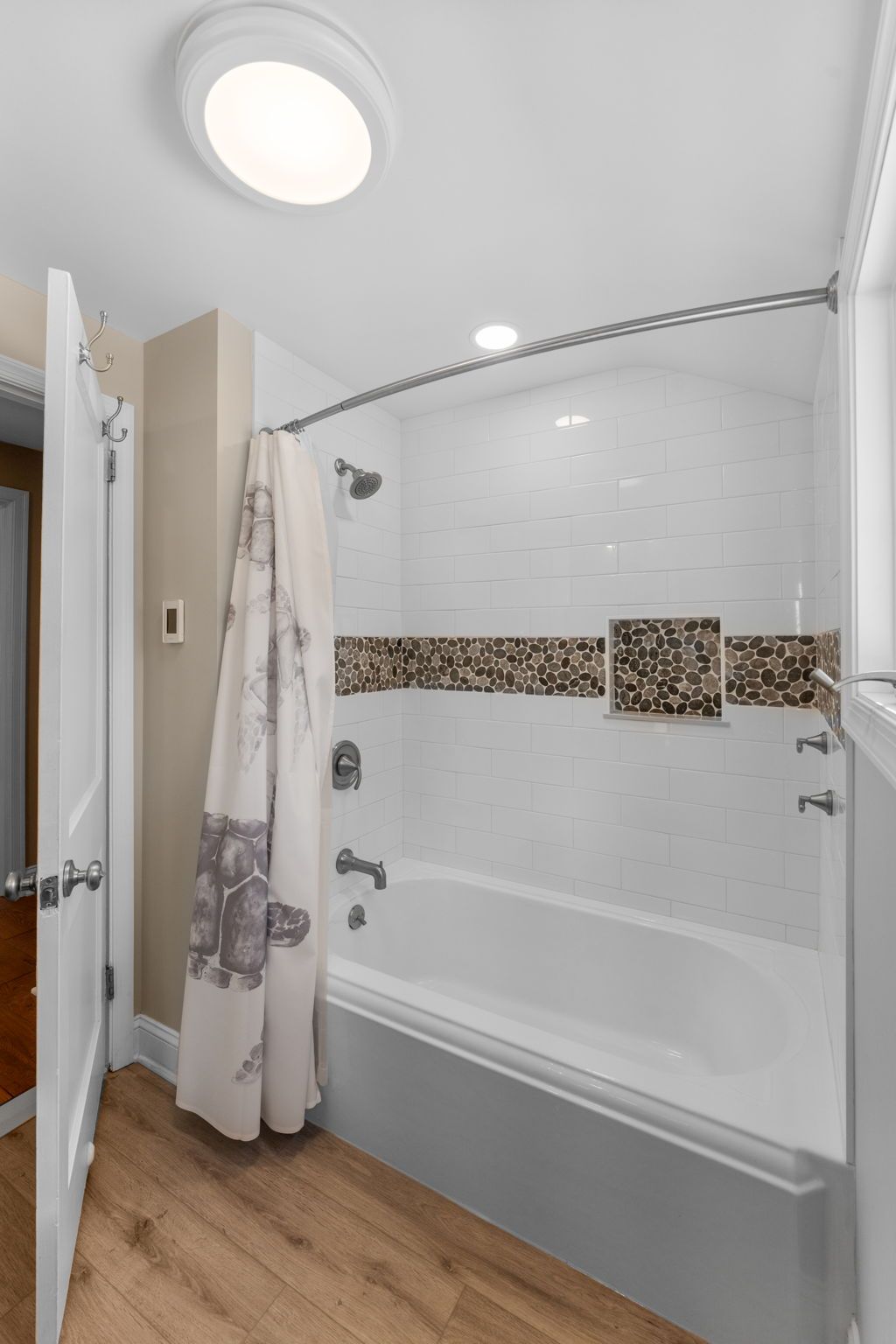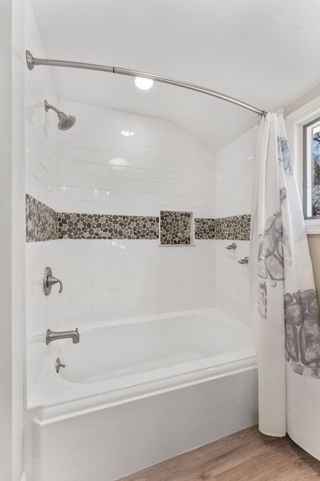 This simple bathroom maximizes the available space through neutrals and deep brown tones. The vanity is Wellborn in the finish mink gray. The vanity top is Wilsonart quartz in the style designer white, the sink is left of center for extra storage space on the vanity. The flooring is LVP from Cera Flooring, we installed heating systems beneath it. The tub area is mostly subway tile, the selection Cera Tile dream in whisper white. The accent area is MGI oval mosaic in ice gray/gray/andesit, forming a line and the back of the alcove. We also installed extra hooks on the wall facing the showerhead. Lighting includes a double sconce over the vanity and a high hat in the shower.