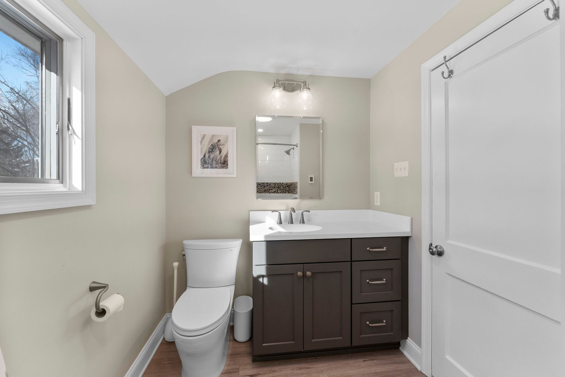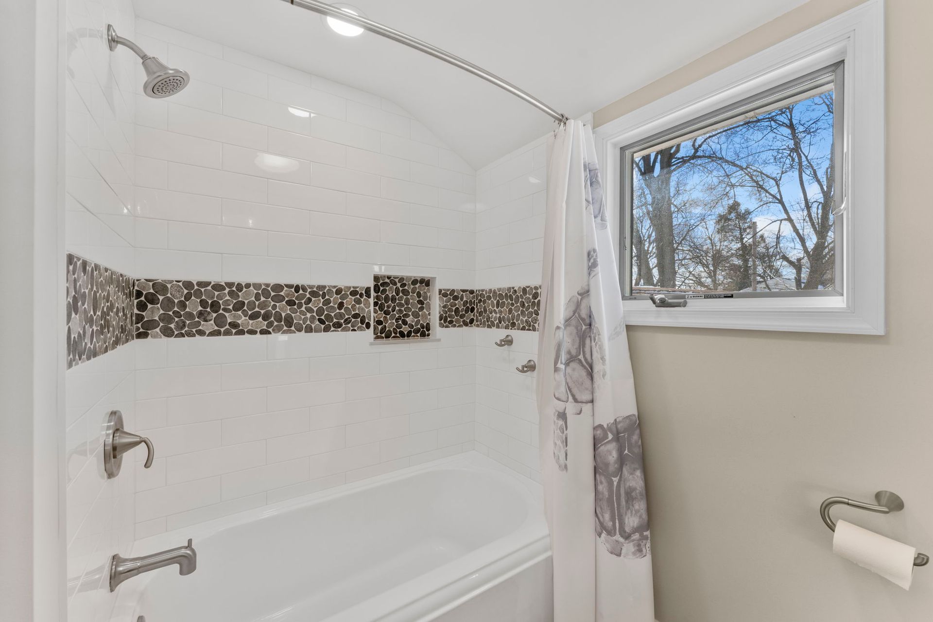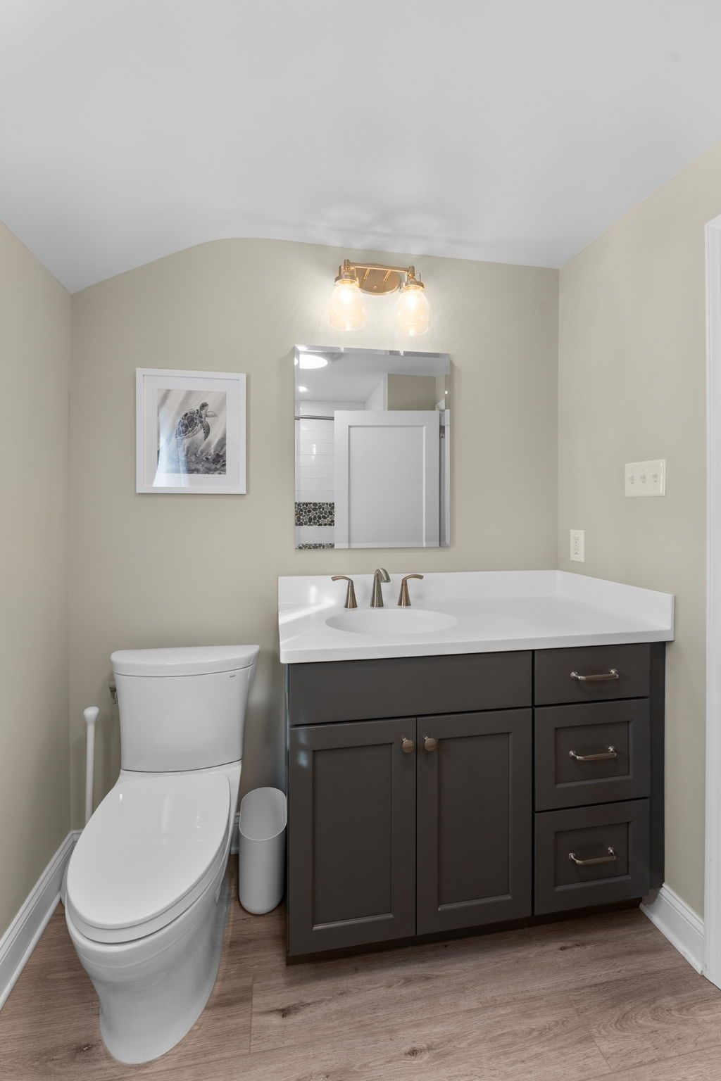 This simple bathroom maximizes the available space through neutrals and deep brown tones. The vanity is Wellborn in the finish mink gray. The vanity top is Wilsonart quartz in the style designer white, the sink is left of center for extra storage space on the vanity. The flooring is LVP from Cera Flooring, we installed heating systems beneath it. The tub area is mostly subway tile, the selection Cera Tile dream in whisper white. The accent area is MGI oval mosaic in ice gray/gray/andesit, forming a line and the back of the alcove. We also installed extra hooks on the wall facing the showerhead. Lighting includes a double sconce over the vanity and a high hat in the shower.