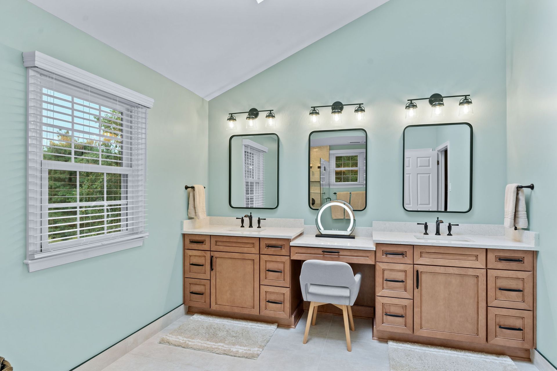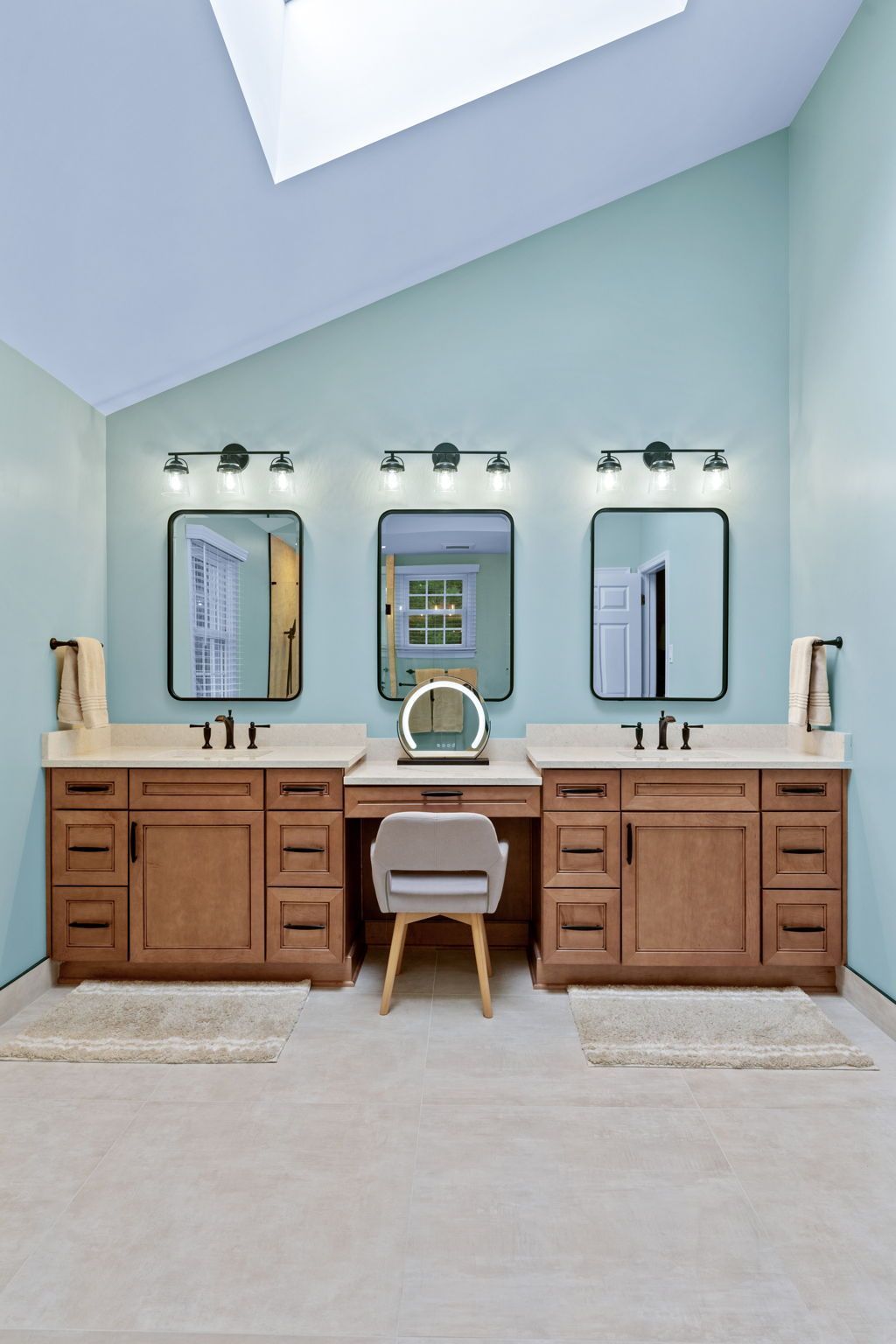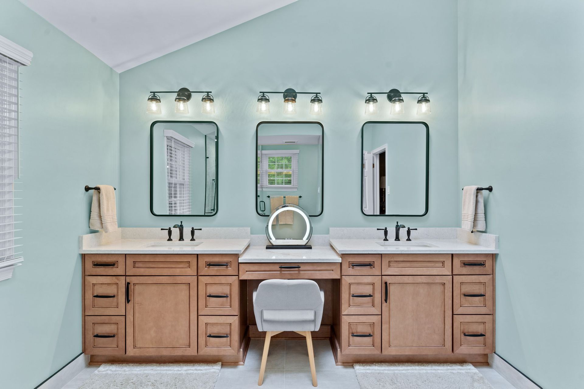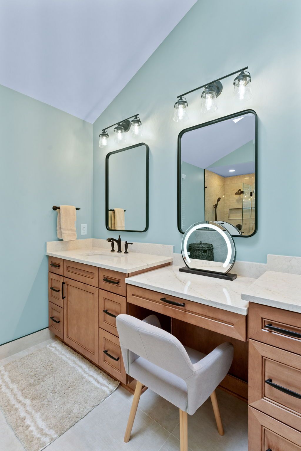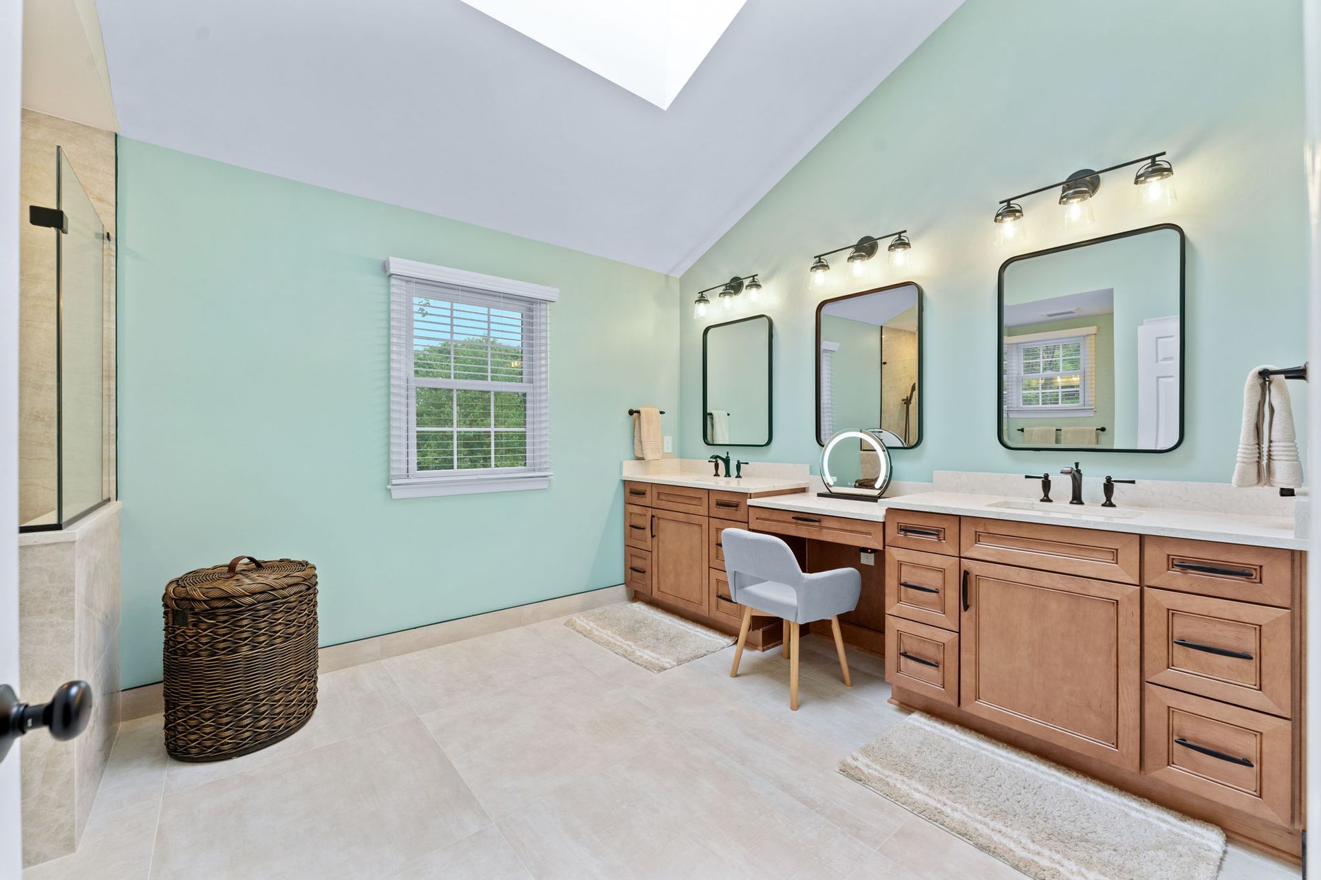A triple vanity/double vanity with a seated area in the middle for all of your getting ready needs. The cabinets are Wellborn, maple wood with a nutmeg java finish. The vanity top is GFO calcutta himalaya quartz, it has a smaller dip in the middle and a slight backsplash. The shower has walls made out of LAP kraken set horizontally, an alcove made of the same tile, and the floor is made of Mos earth mix river rock . It includes a bench with a slight lip, and the glass sits on top of that and the higher sill. The main floor of the bathroom is made out of bone white icon set in a square pattern. Lighting includes three triple sconces above the vanity, a small magnified mirror, and high hats.
