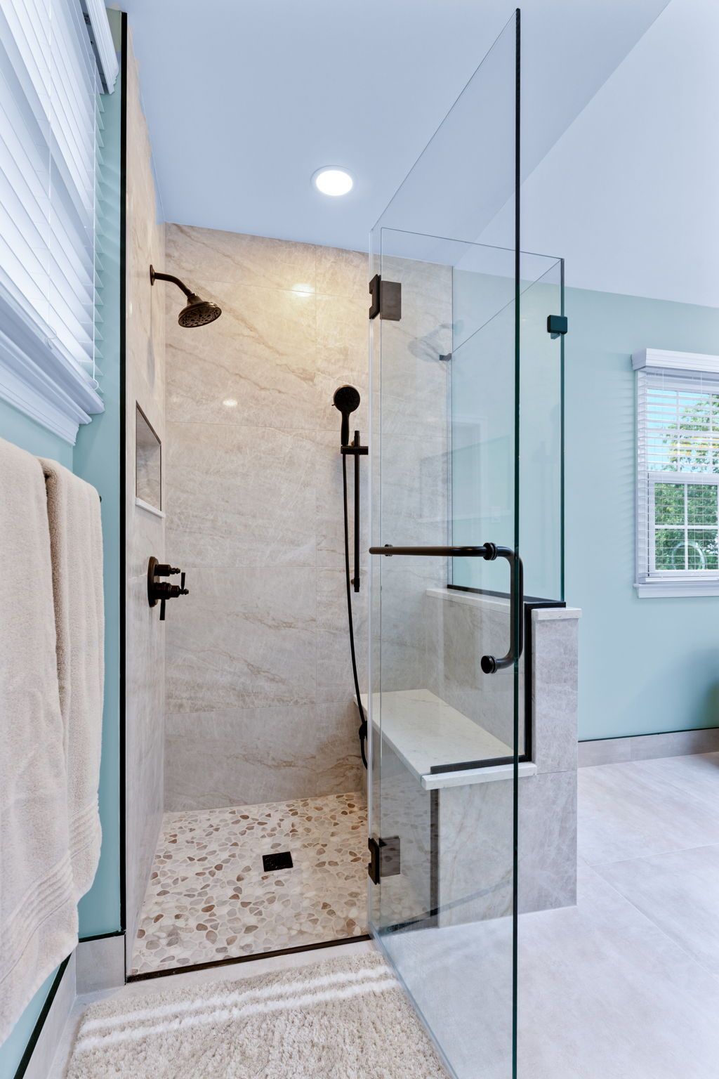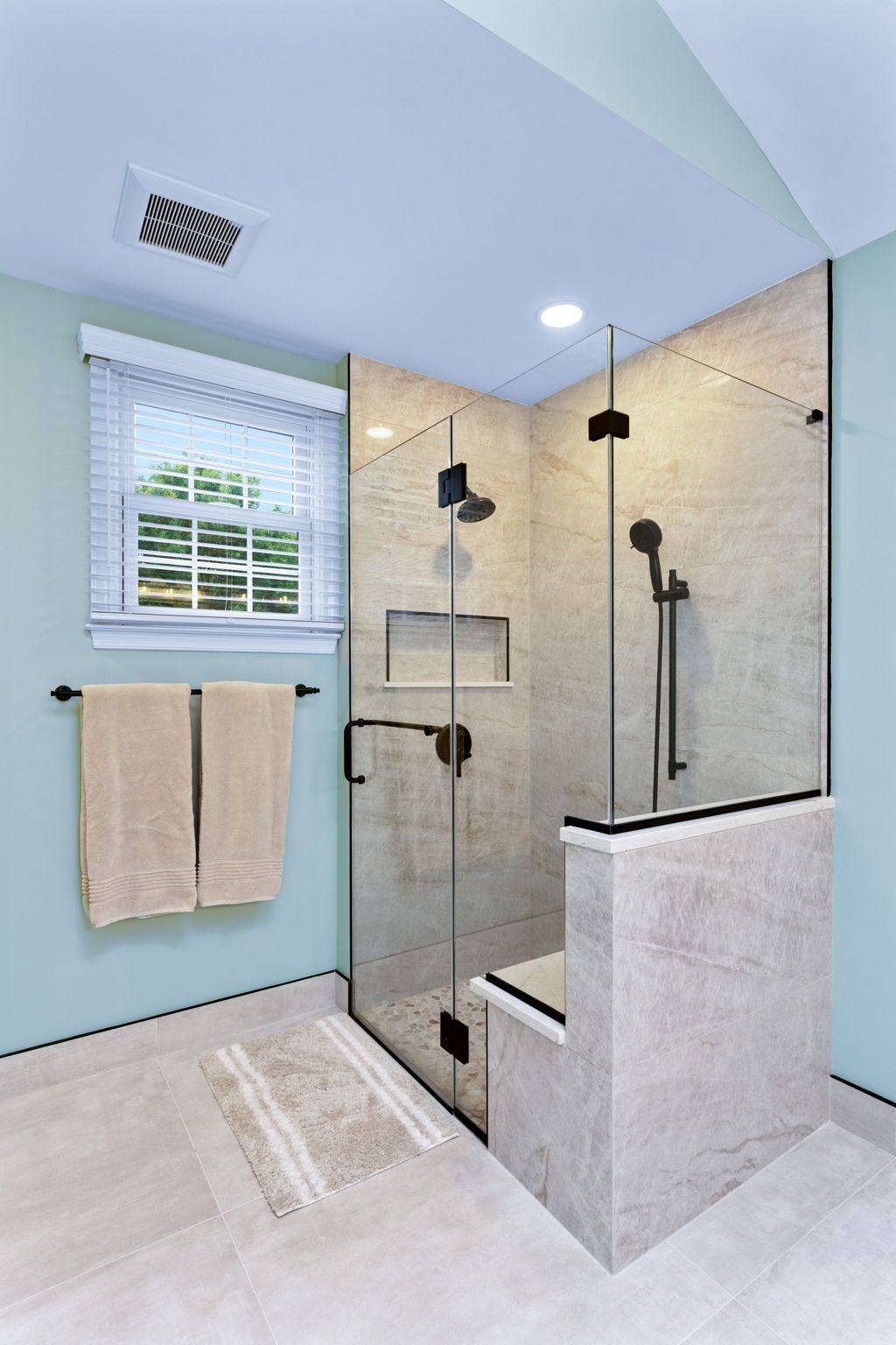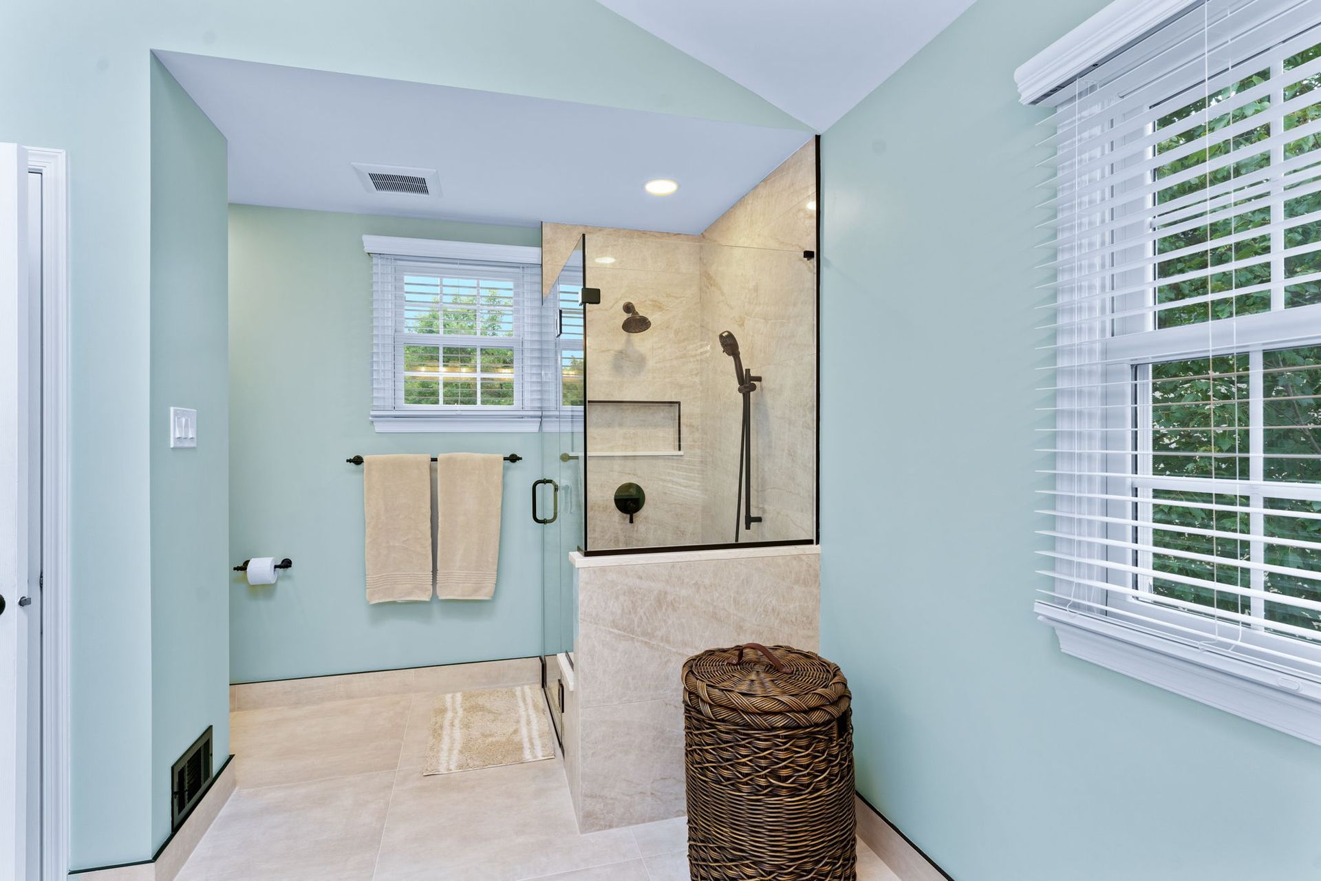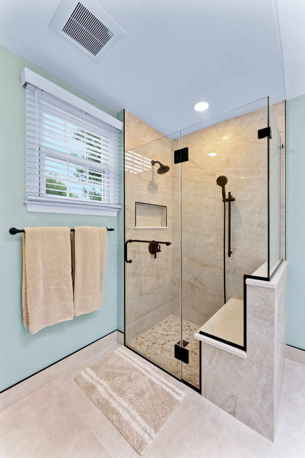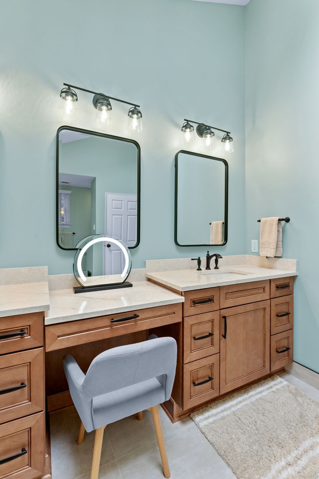 A triple vanity/double vanity with a seated area in the middle for all of your getting ready needs. The cabinets are Wellborn, maple wood with a nutmeg java finish. The vanity top is GFO calcutta himalaya quartz, it has a smaller dip in the middle and a slight backsplash. The shower has walls made out of LAP kraken set horizontally, an alcove made of the same tile, and the floor is made of Mos earth mix river rock . It includes a bench with a slight lip, and the glass sits on top of that and the higher sill. The main floor of the bathroom is made out of bone white icon set in a square pattern. Lighting includes three triple sconces above the vanity, a small magnified mirror, and high hats.
