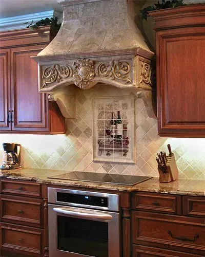This kitchen has a ornamental hood that is above a decorative backsplash.