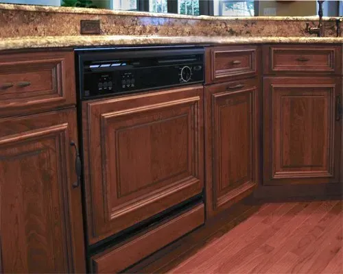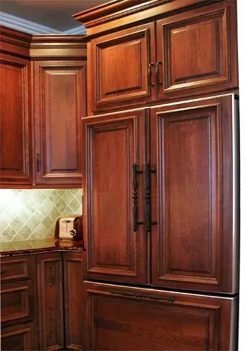 These cabinets are cherry wood with nutmeg finish and have a coffee glaze.