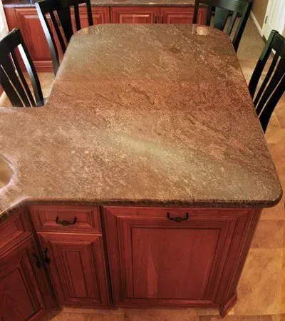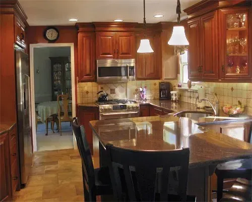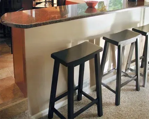 This kitchen has a seperate peninsula that is located behind the countertop table.