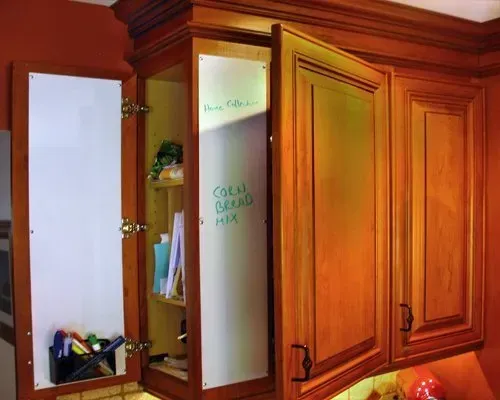The kitchen wall cabinet has a concealed communication board to leave notes and hold the household keys.