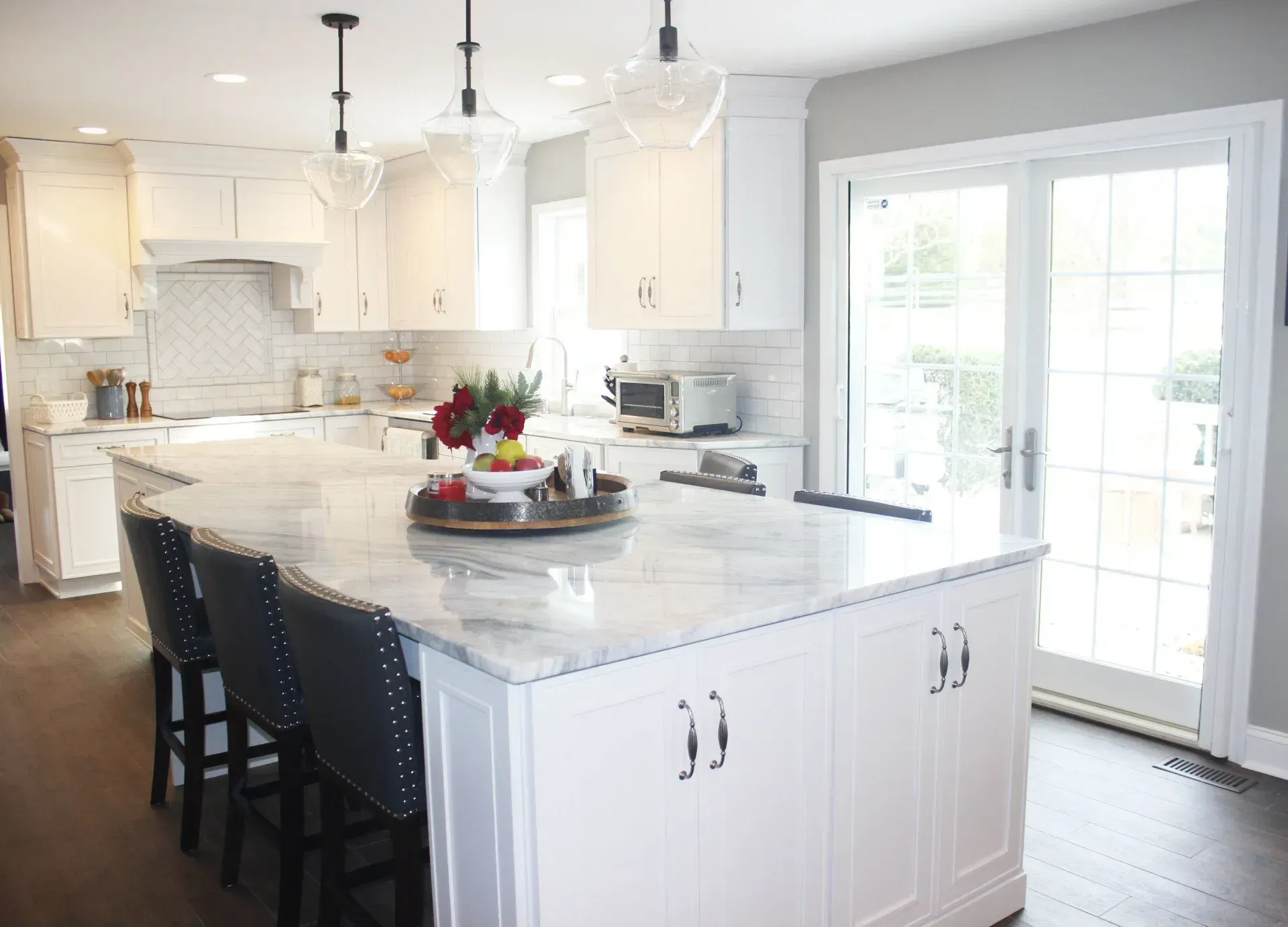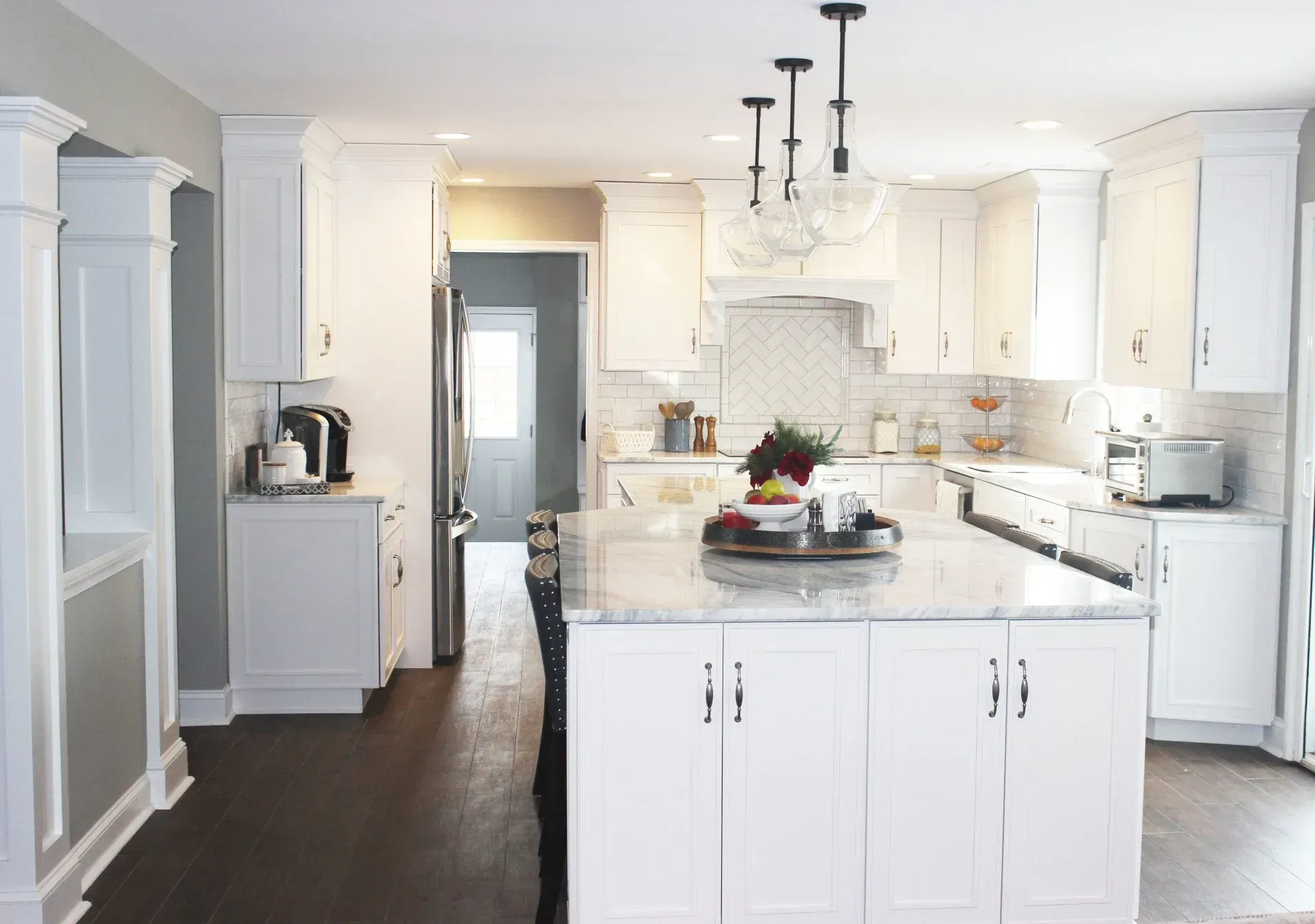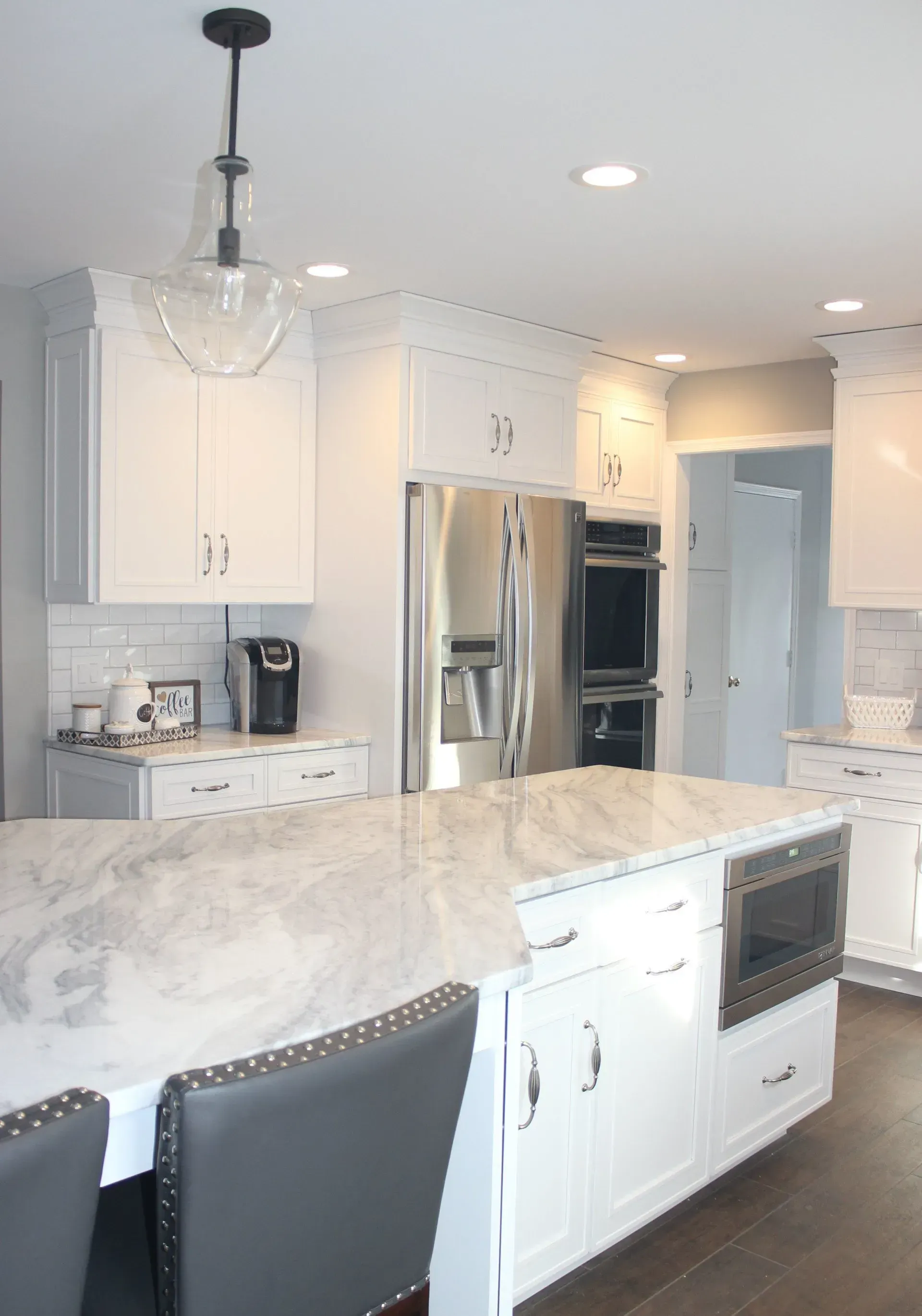This kitchen in Ambler, PA was remodeled with Omega Dynasty Cabinets, heated porcelain tile plank floors, new appliances, recessed lighting and pendants lights.