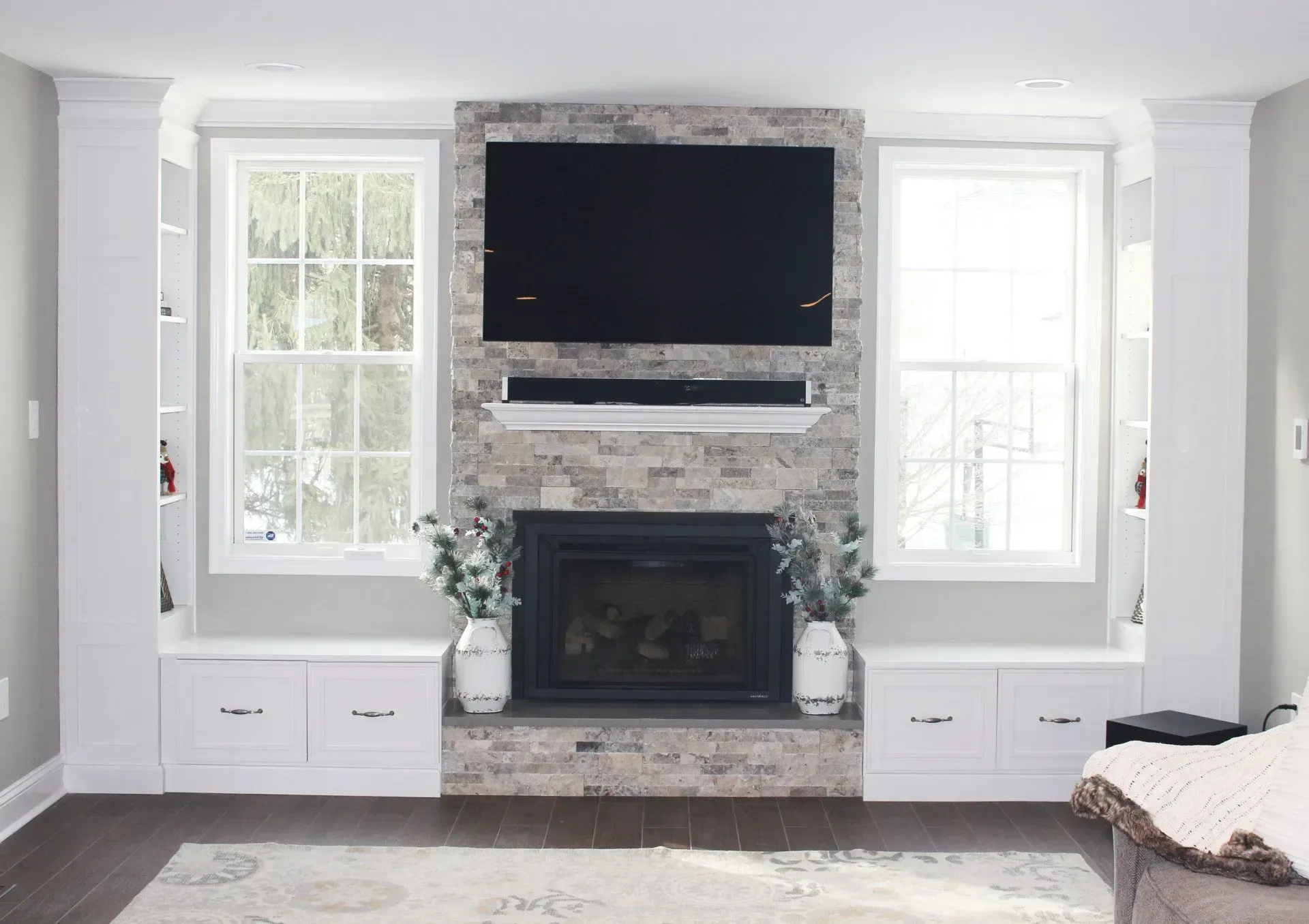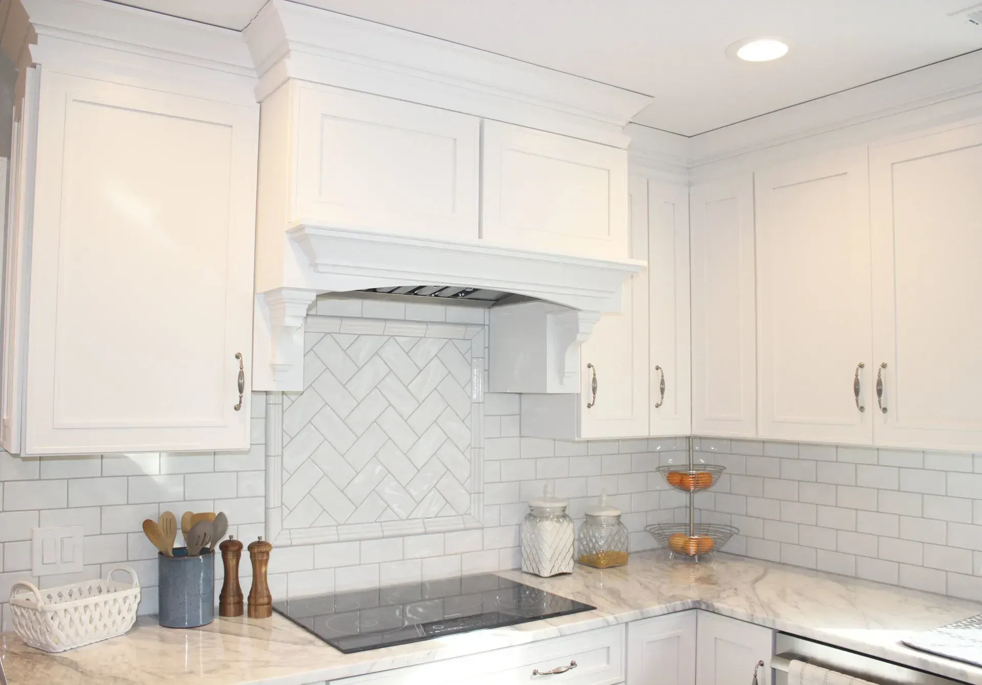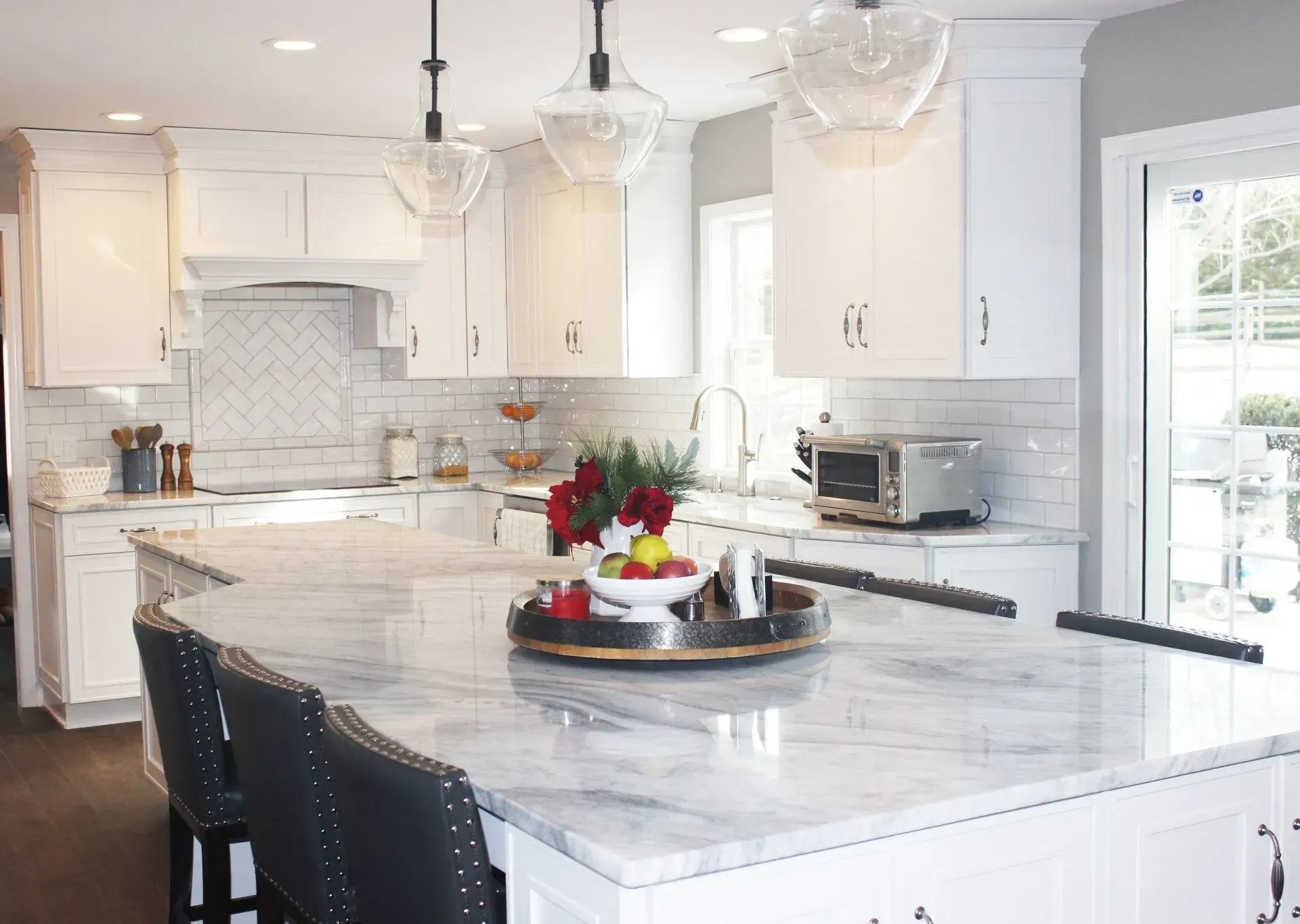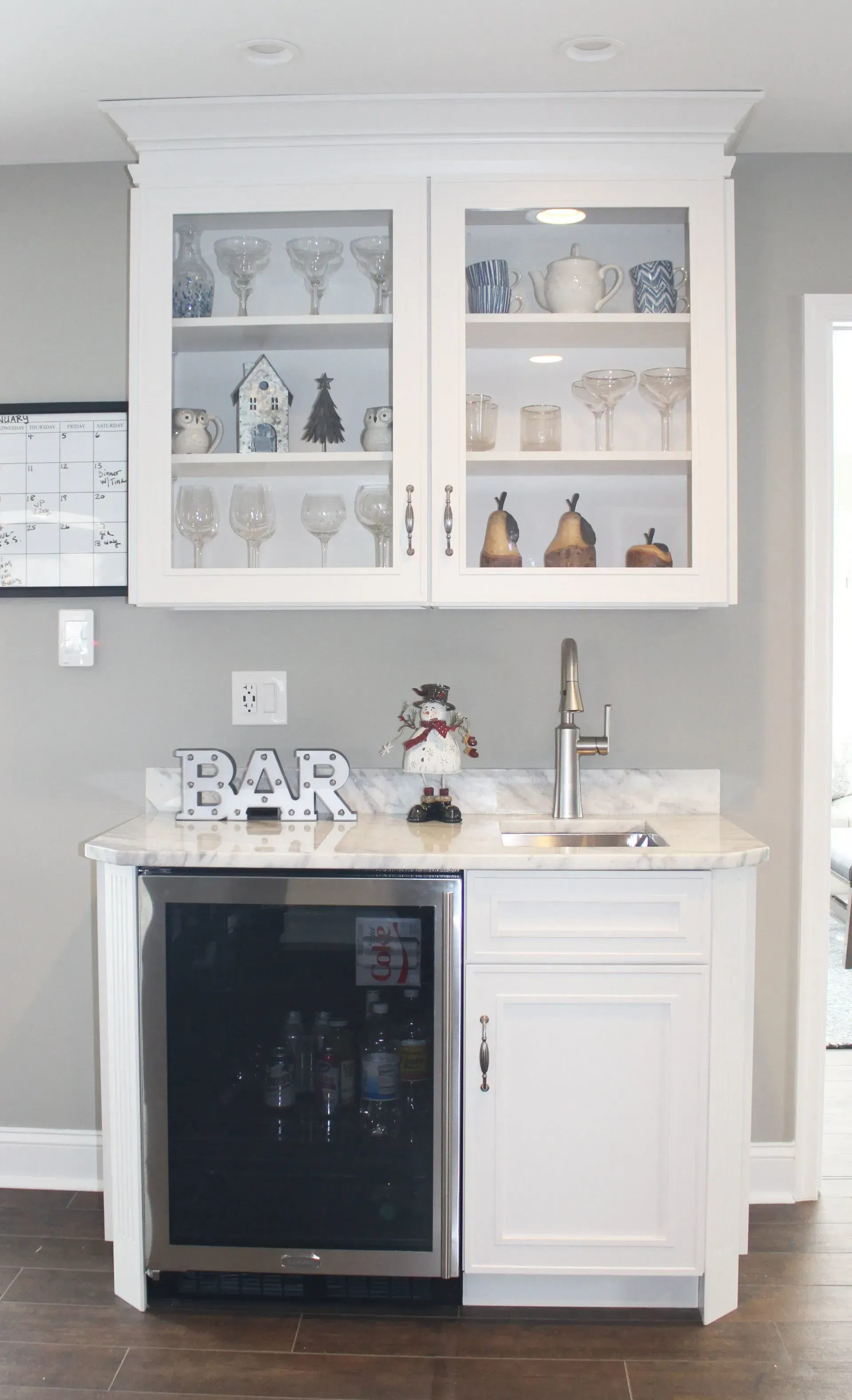 This kitchen in Ambler, PA was remodeled with Omega Dynasty Cabinets, heated porcelain tile plank floors, new appliances, recessed lighting and pendants lights.