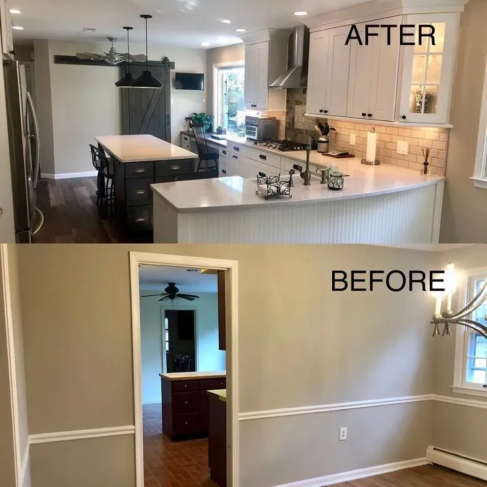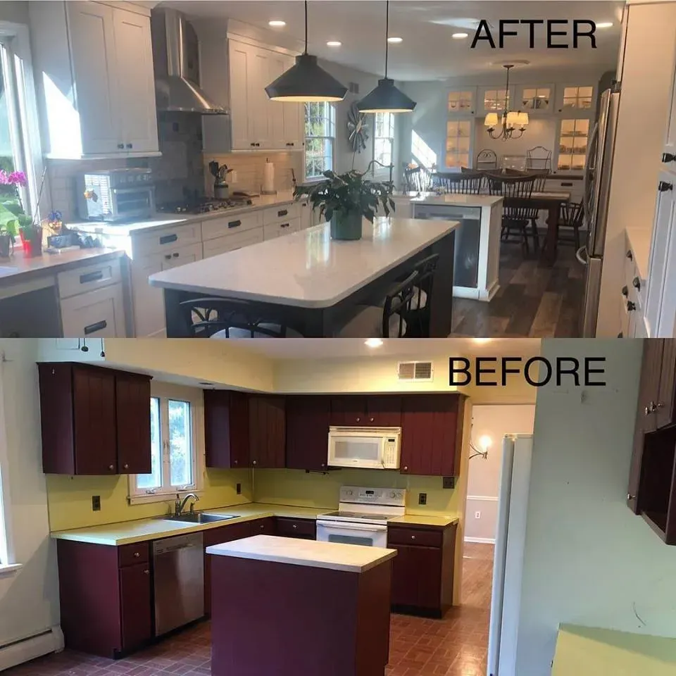 This kitchen in Doylestown, PA was remodeled with a mix of Waypoint Cabinets and Omega Dynasty Cabinets. The Waypoint Cabinets were used for around the perimeter of the kitchen and Omega Dynasty Cabinets were used for the island. This kitchen also features new tile backsplash, quartz and wood countertops, luxury vinyl floors, apron sink and new stainless steel appliances. We also renovated the powder room and laundry room.
