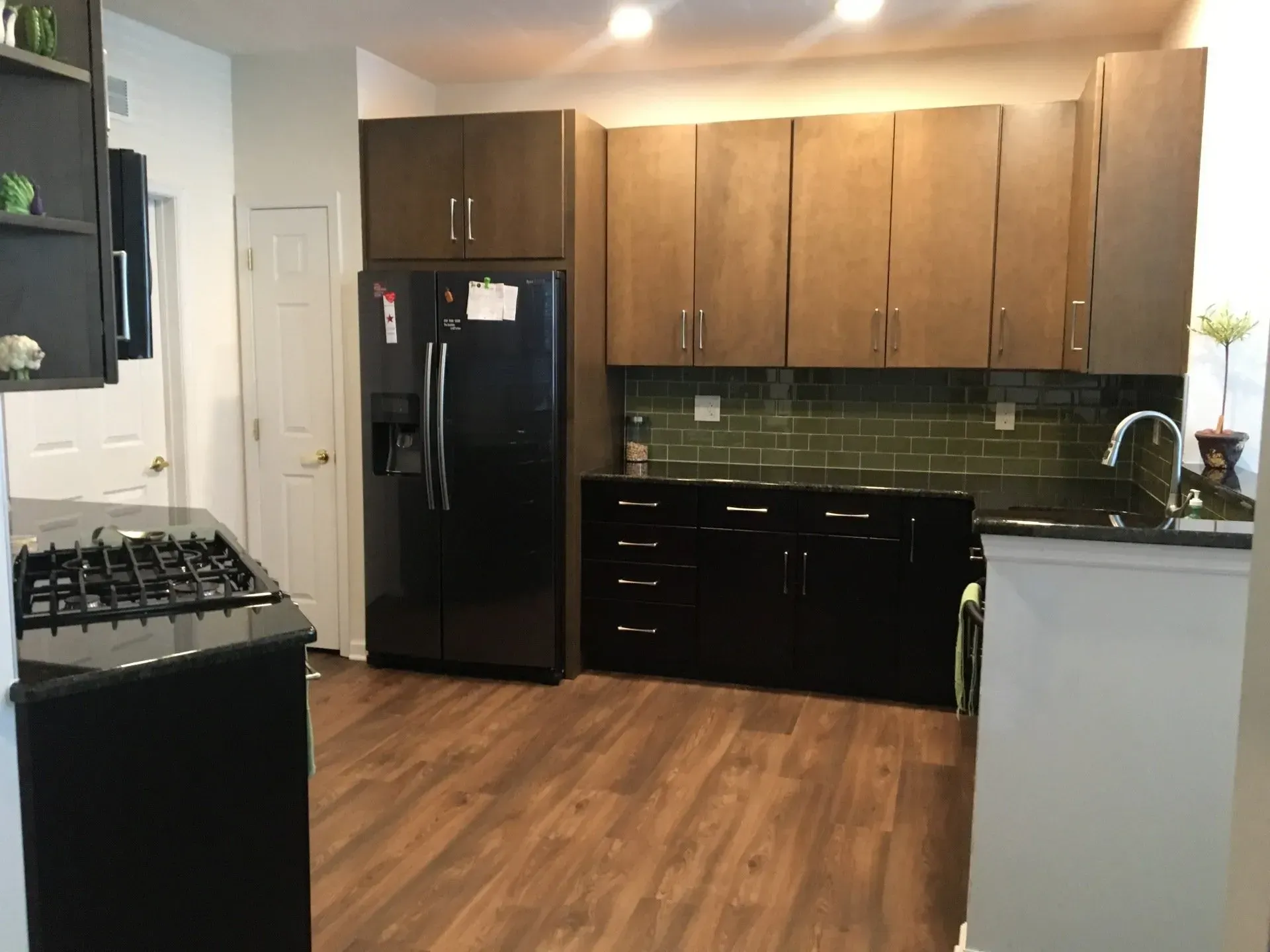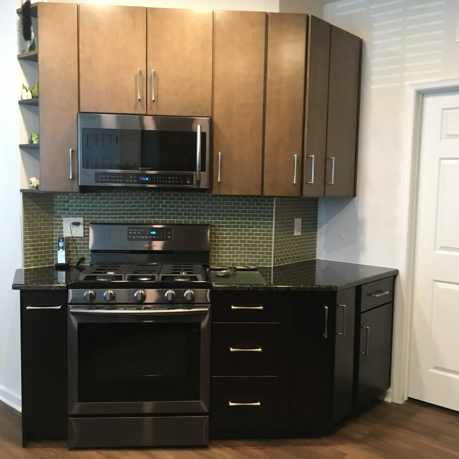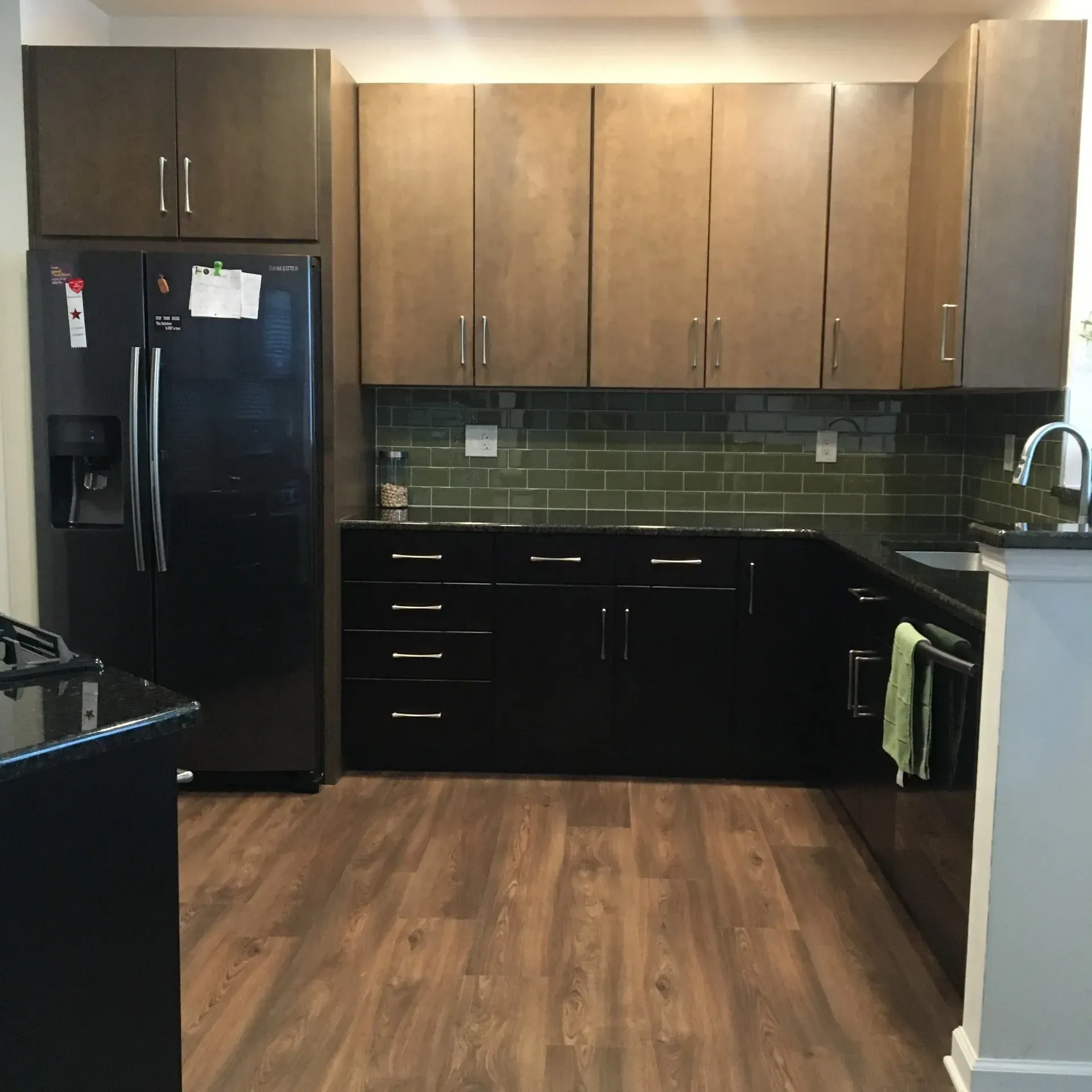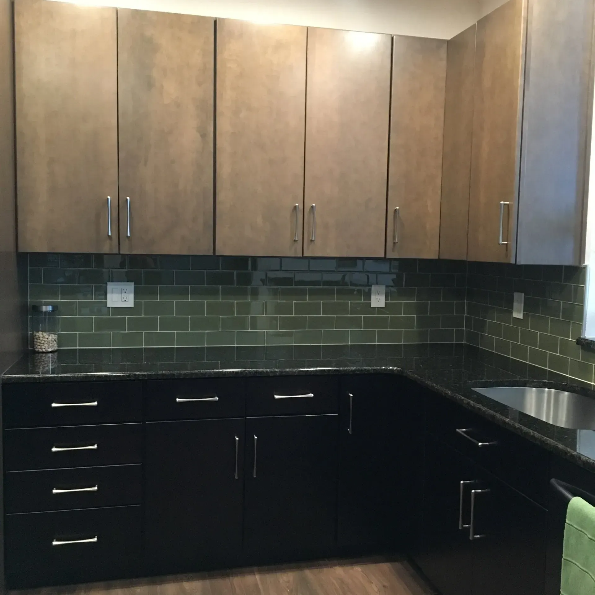 This kitchen in Holland , PA was remodeled with two toned kitchen cabinets. We used Omega Dynasty maple cabinets in Pika for the wall and Omega Dynasty maple cabinets in Labrador for the base. This kitchen was also updated with a new luxury vinyl plank floor, shimmer glass tile backsplash, new hardware, and granite countertops.