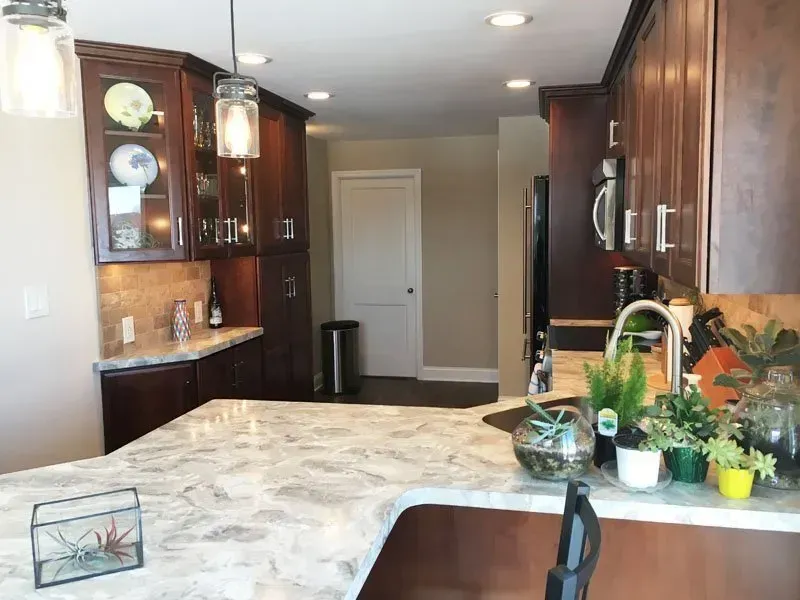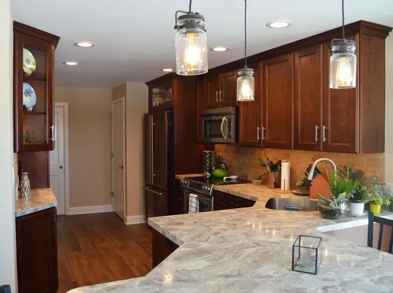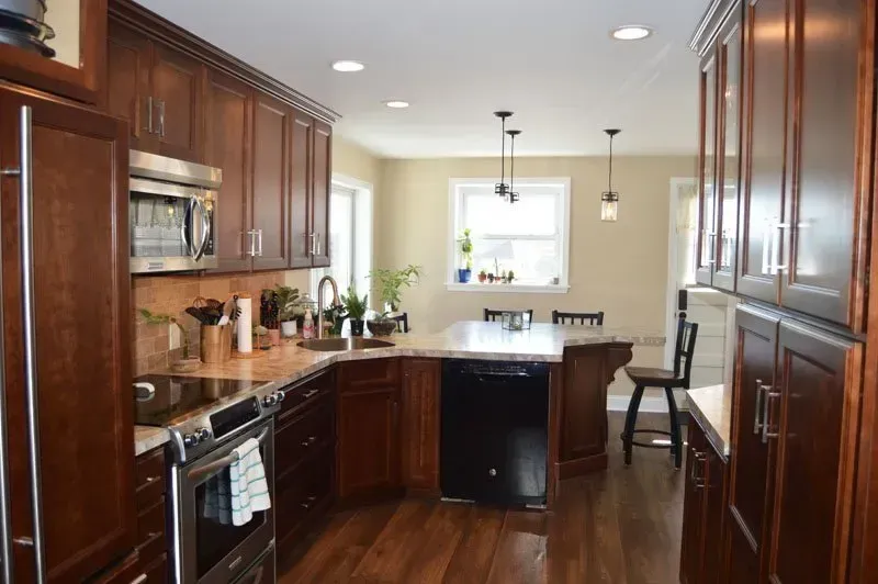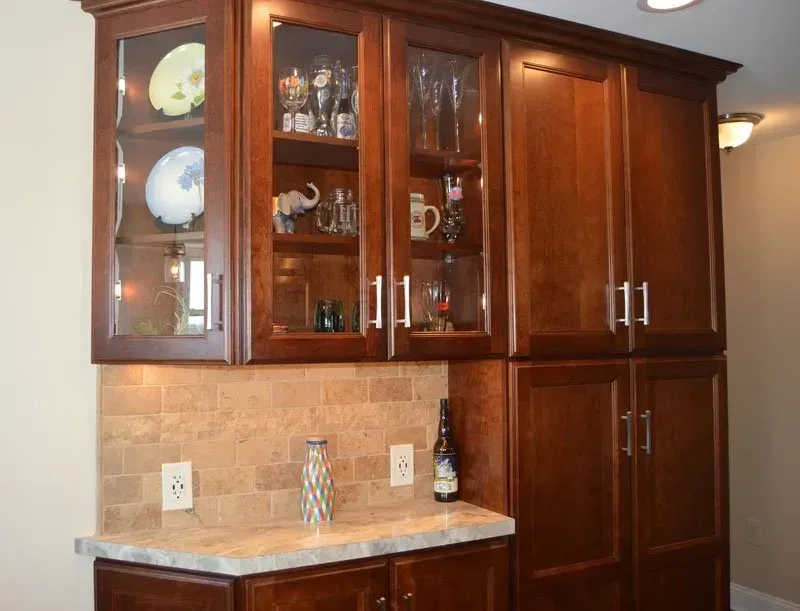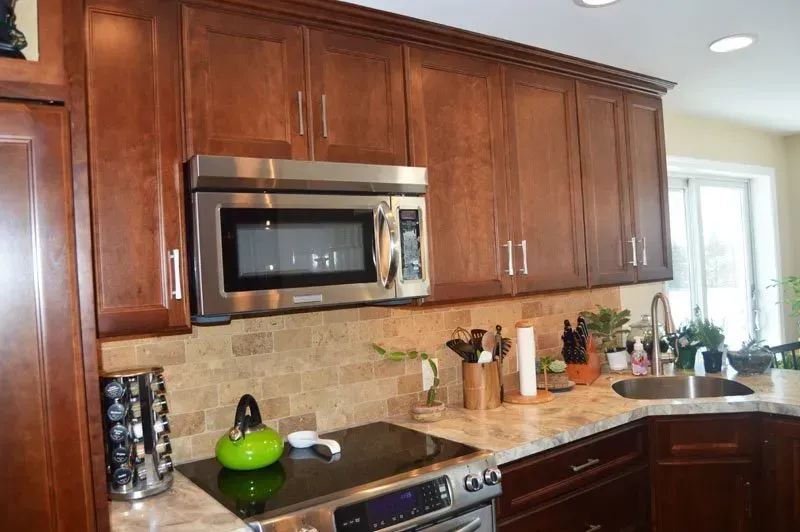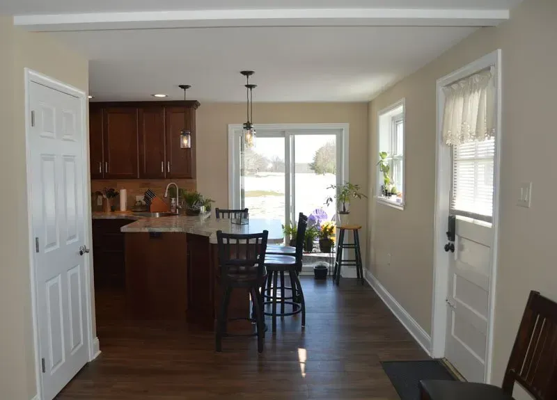 This kitchen in Jamison, PA was remodeled with Cherry Kabinart cabinets, Laminate countertop, Luxury Vinyl Floor, and Neutral Tile Backsplash. The wall between the kitchen and living room was removed to create a more open floor plan, sliding glass doors were added as well as a new spacious pantry.