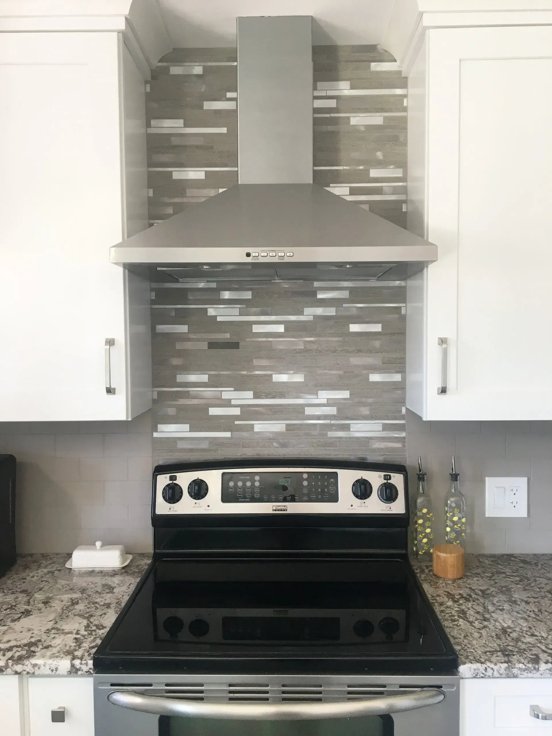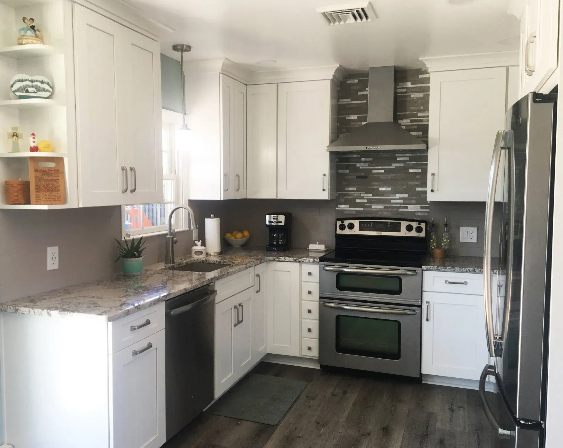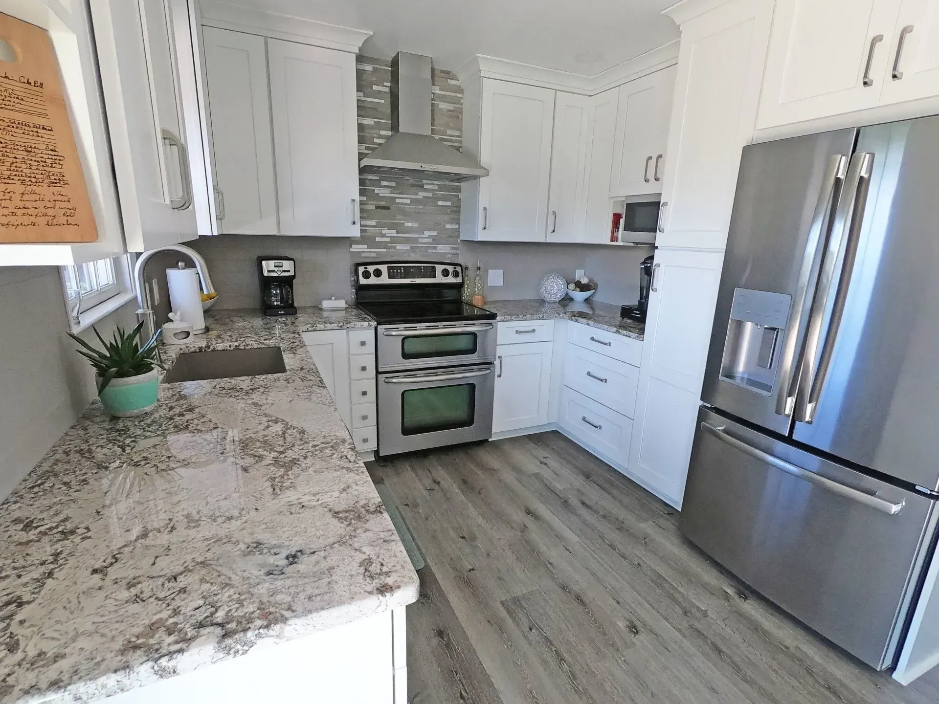 This kitchen in Levittown, PA was remodeled with Waypoint Cabinets in Painted Linen, granite counter top, luxury vinyl floor and new sink, faucet and hardware.