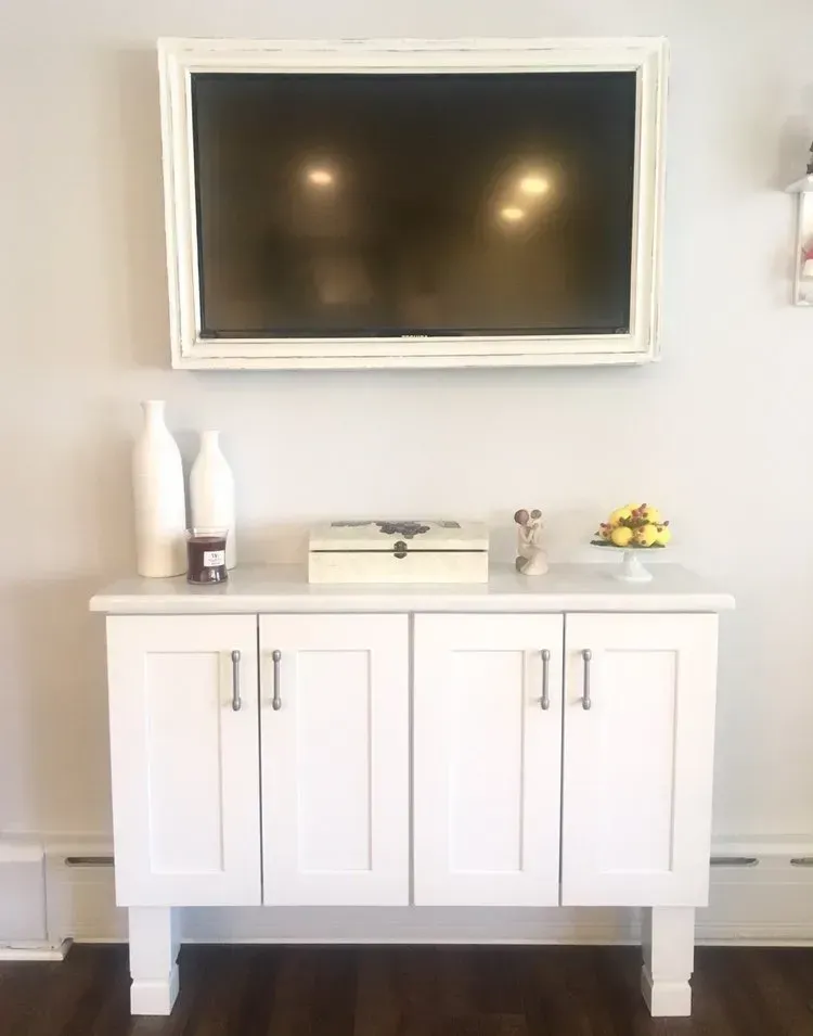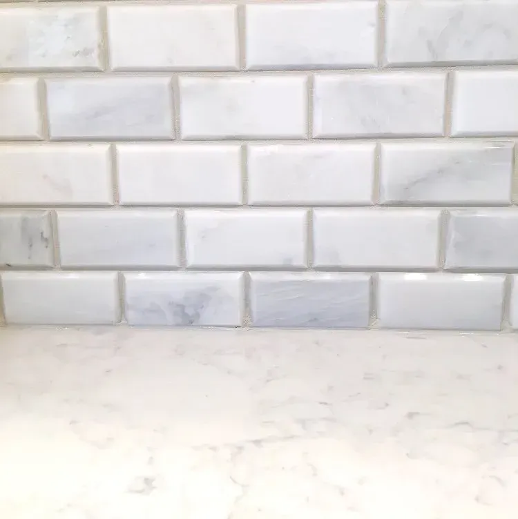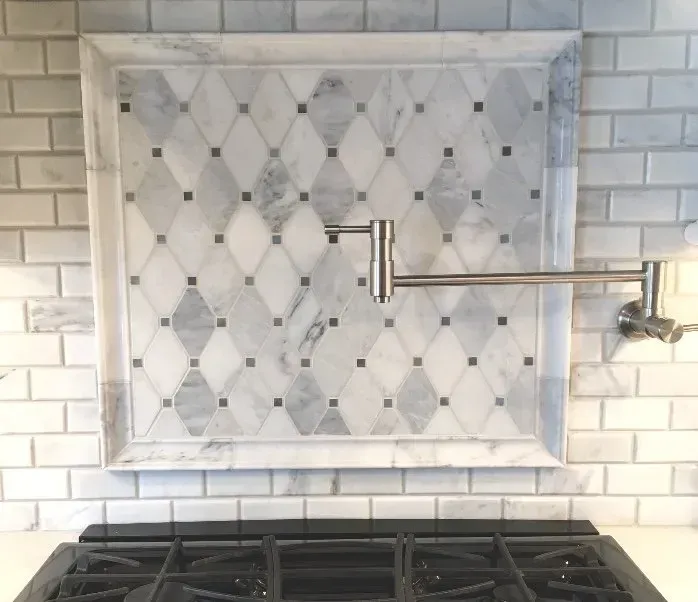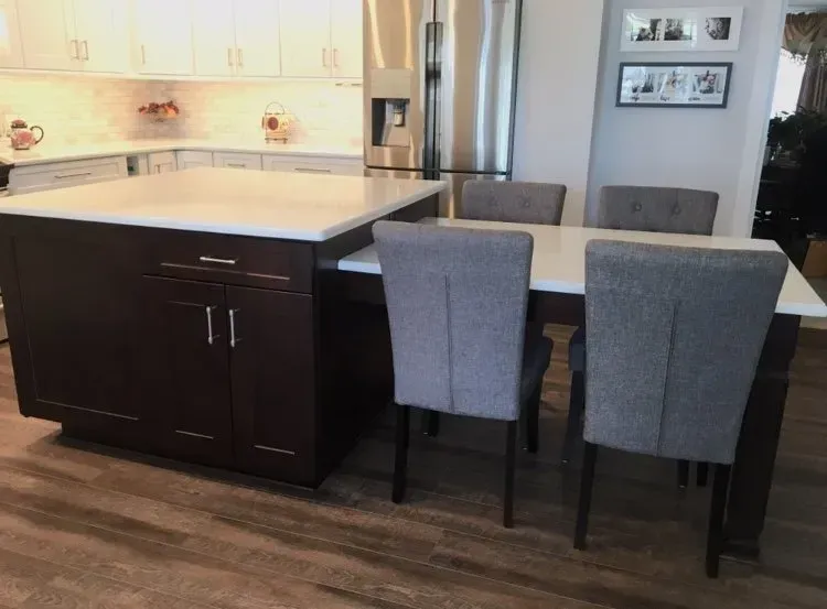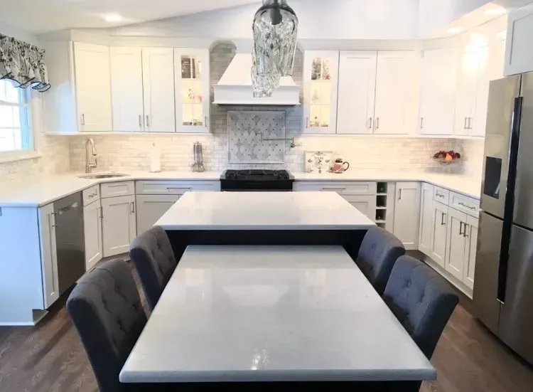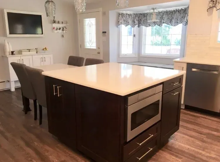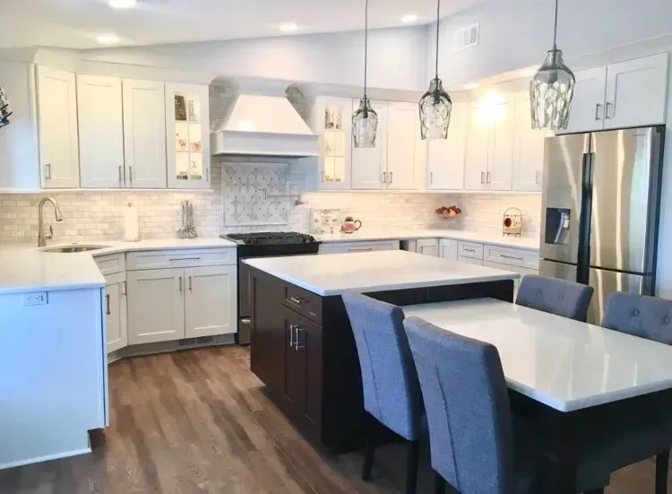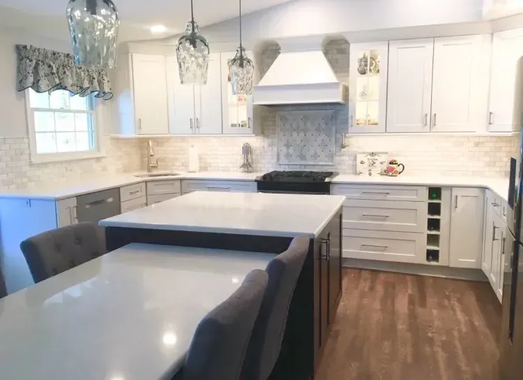 This Kitchen Remodel in Northeast Philadelphia was renovated with Painted Waypoint cabinets in Linen around the perimeter and Cherry Waypoint cabinets for the island. This remodel also includes new quartz countertops, marble subway tile backsplash, Mosiac cooktop mural, pot filler and vinyl floor.