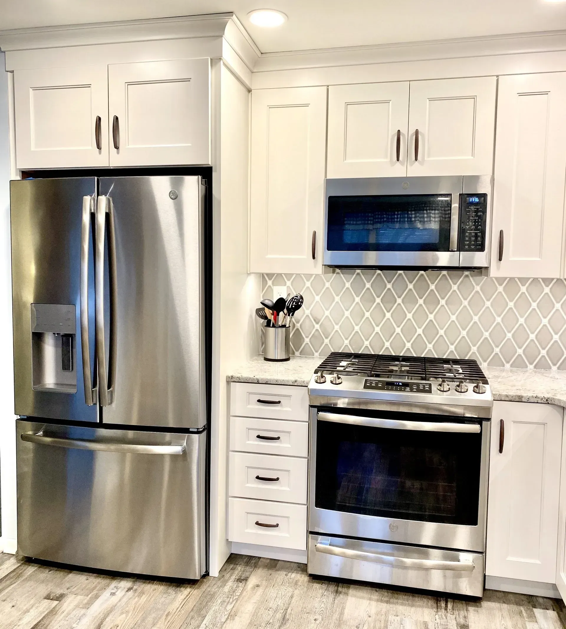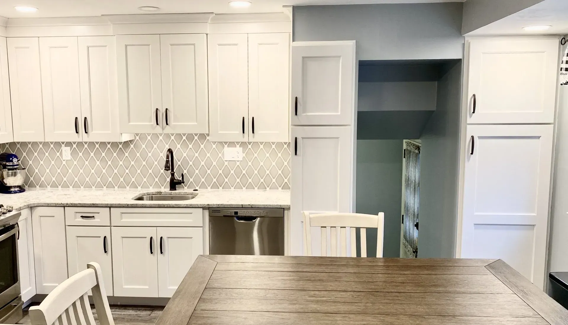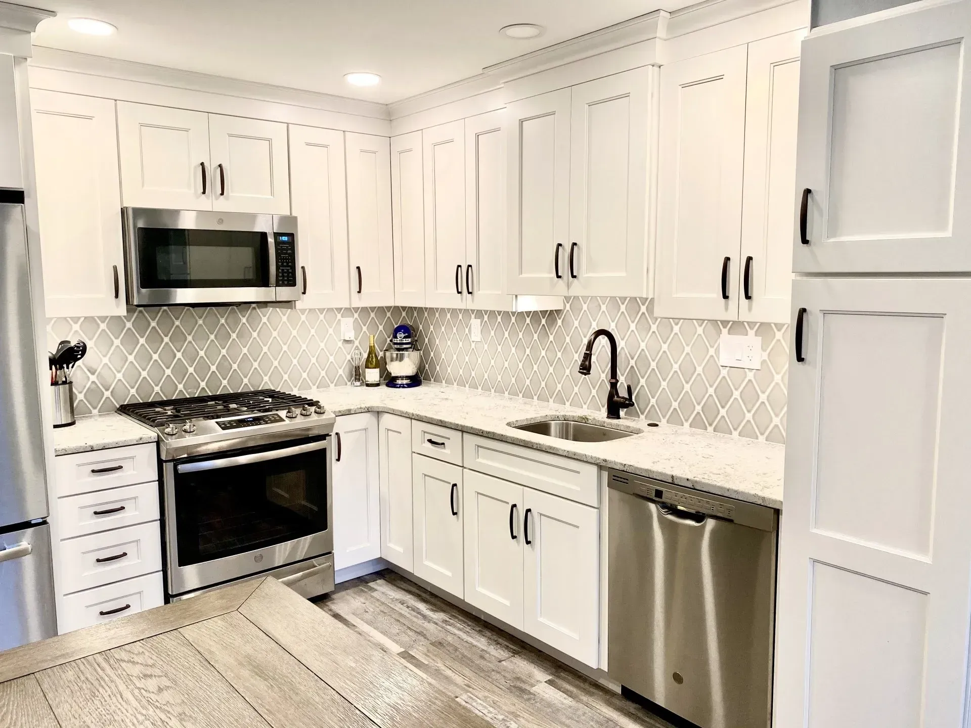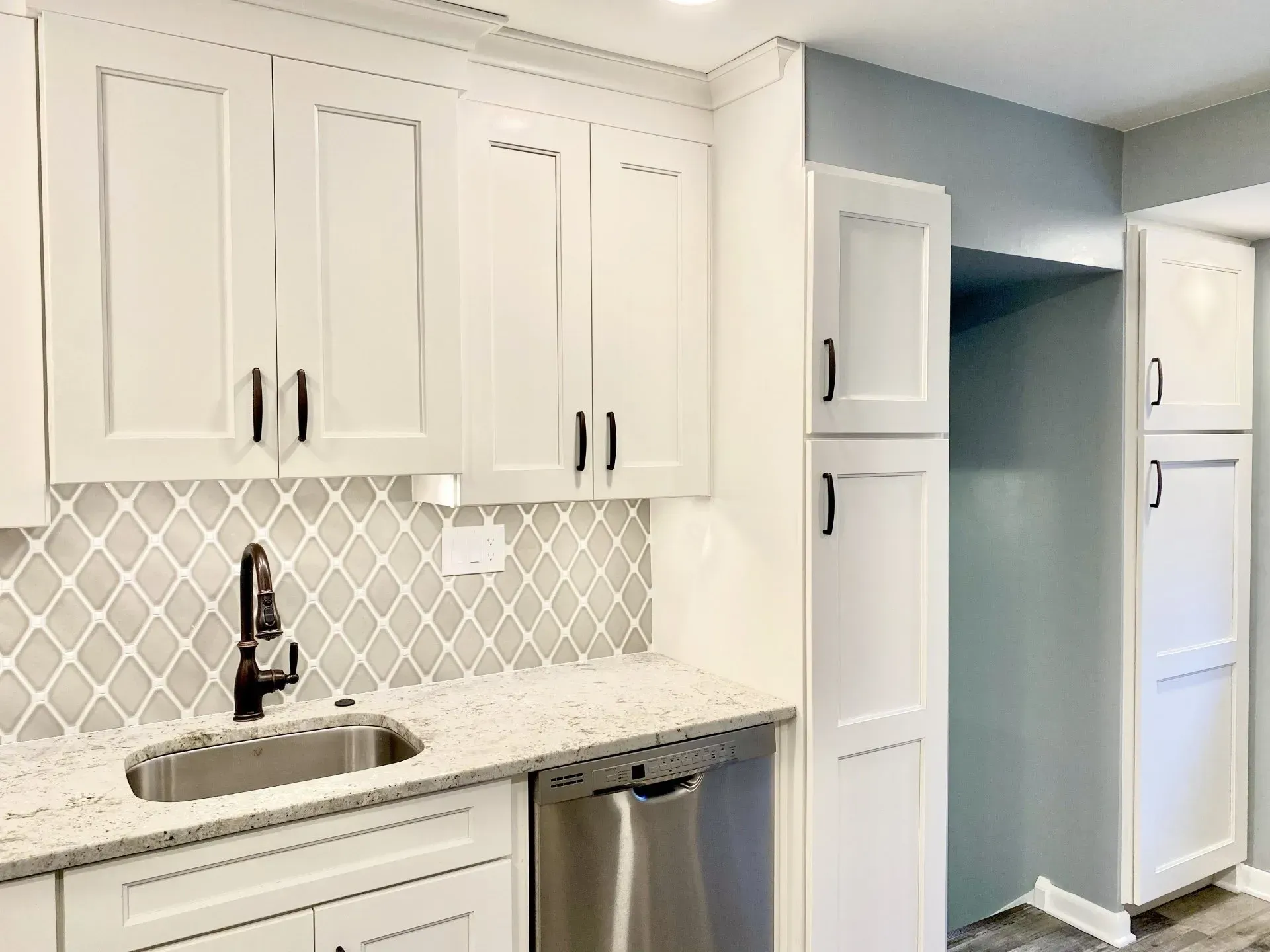 This kitchen in Northeast Philadelphia was remodeled with Wellborn Cabinets, Dove Gray Diamond backsplash, granite counter top, luxury vinyl floor, under cabinet lighting, and oil rubbed bronze faucet and hardware.