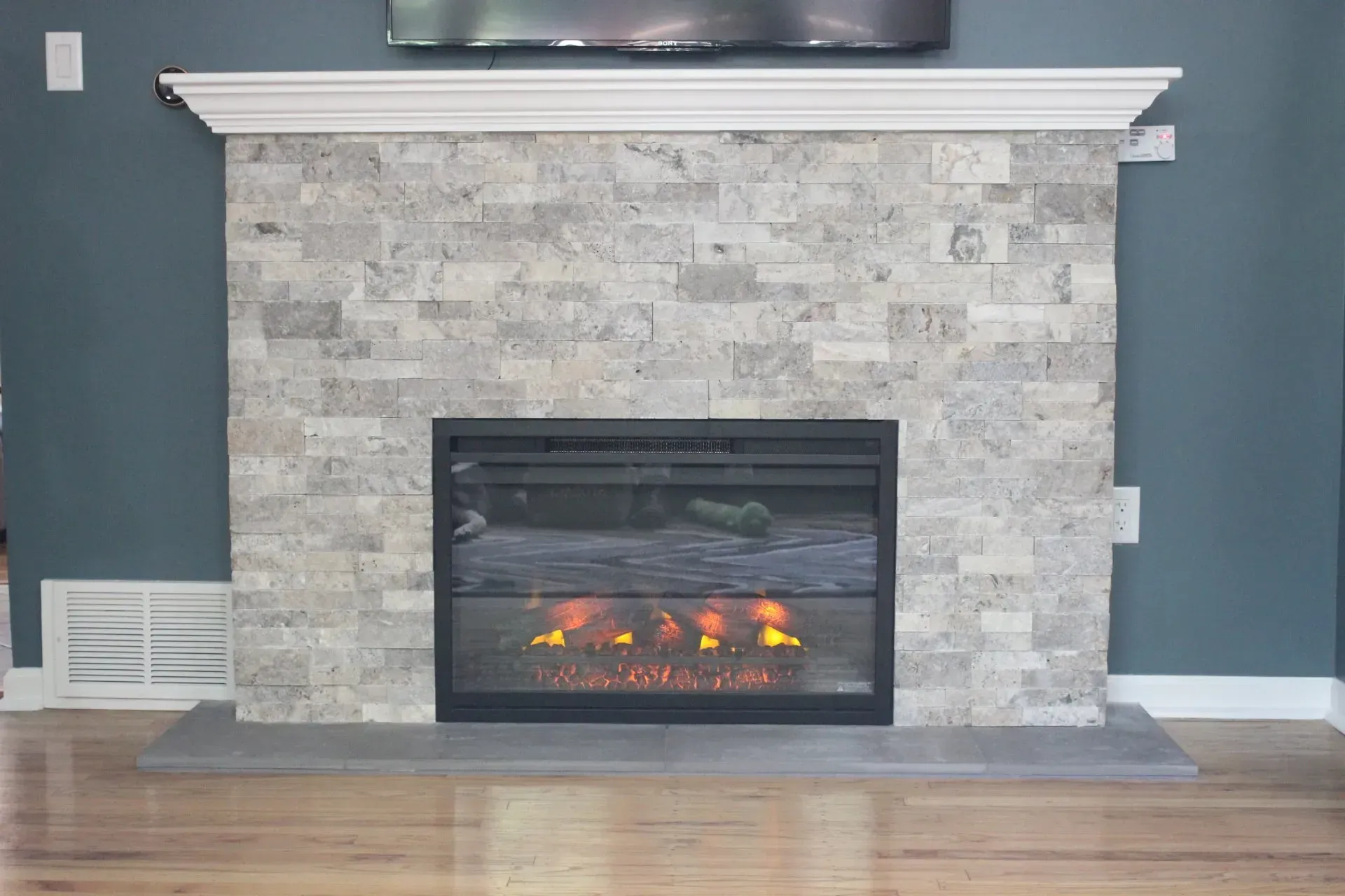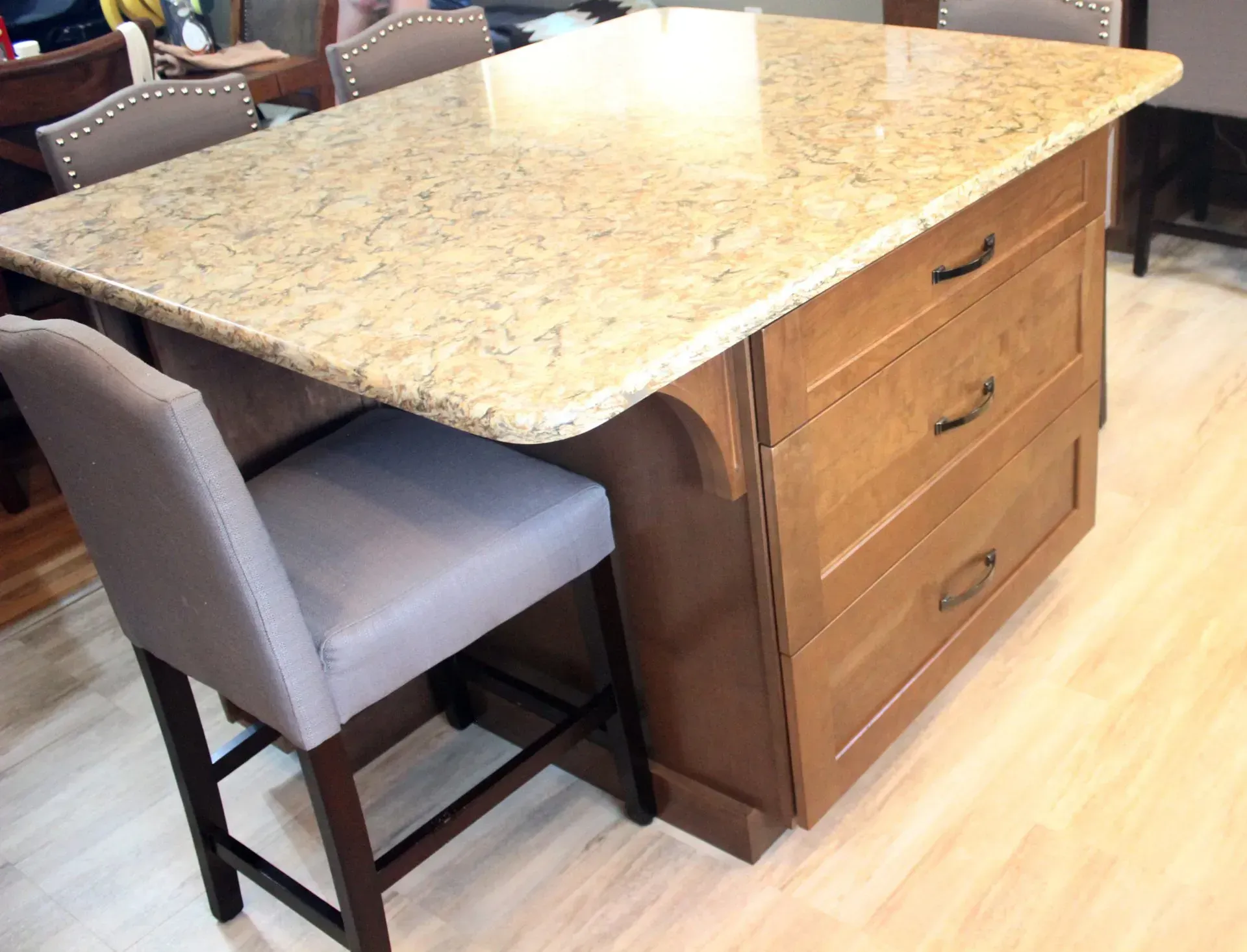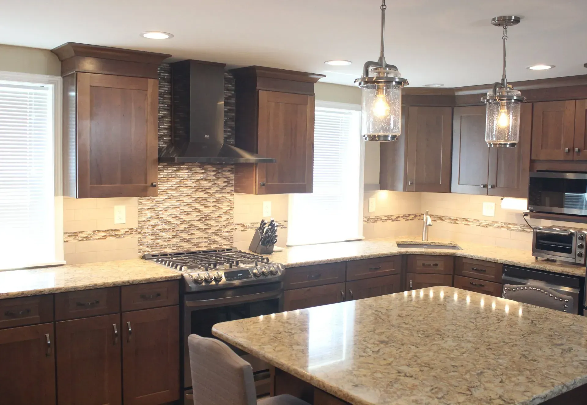 This kitchen in Philadelphia, PA was remodeled with Cherry Waypoint cabinets, eat-in island, quartz countertop, tile backsplash, vinyl floor and new appliances.
