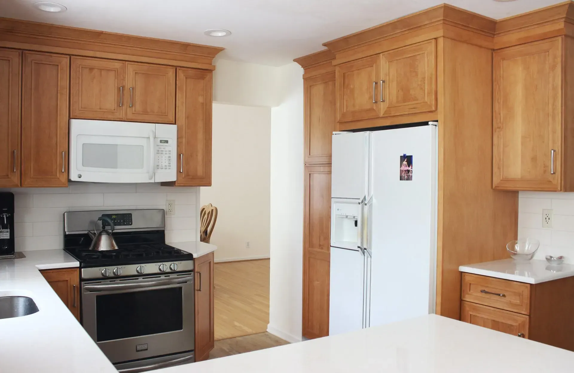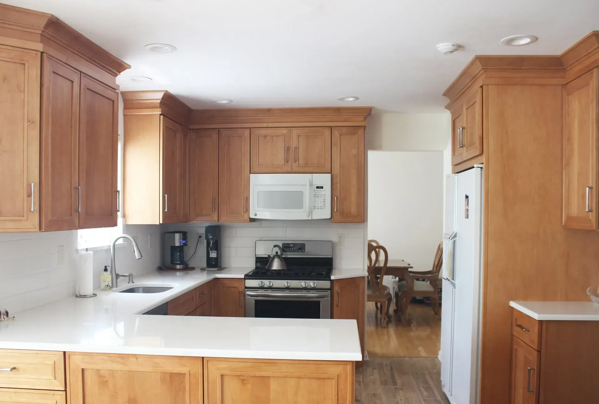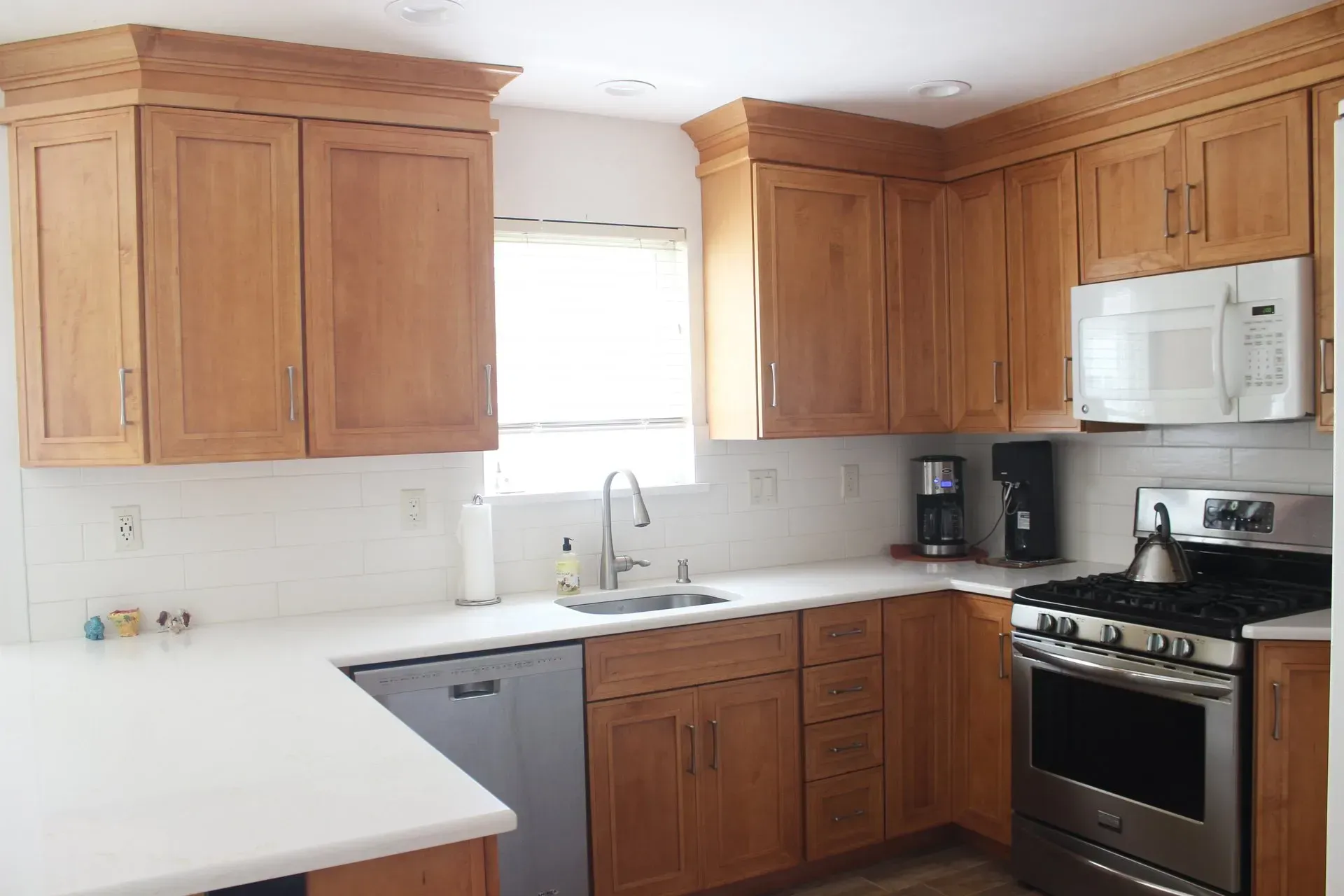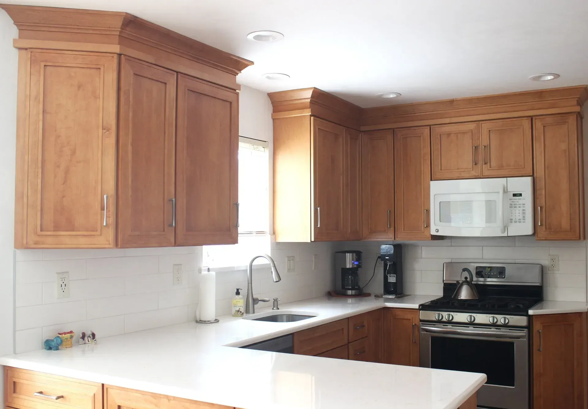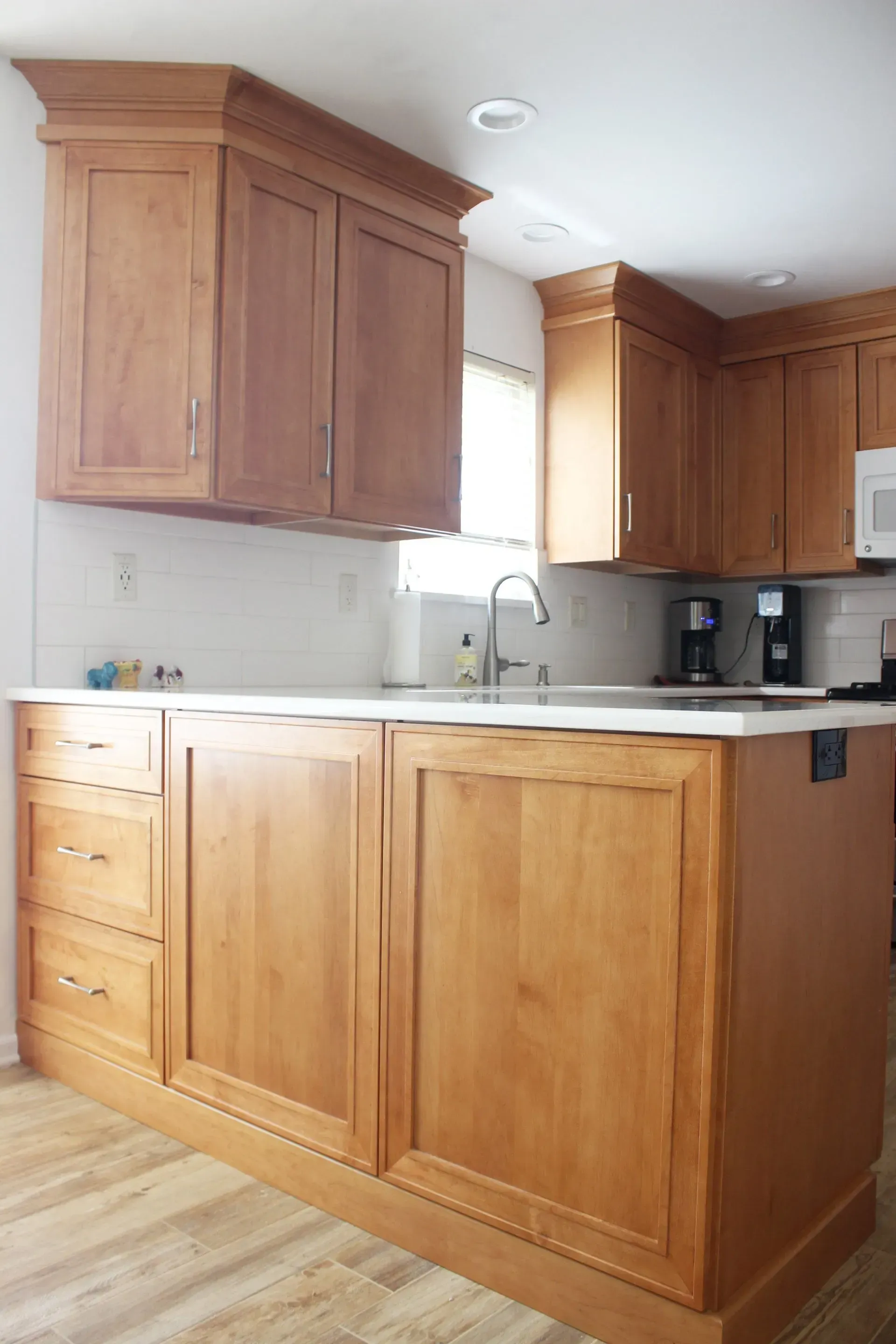 This kitchen in Northeast Philadelphia was designed with new Maple Omega Dynasty Cabinets in Butternut, subway tile backsplash, porcelain plank tile floor, and quartz countertops.