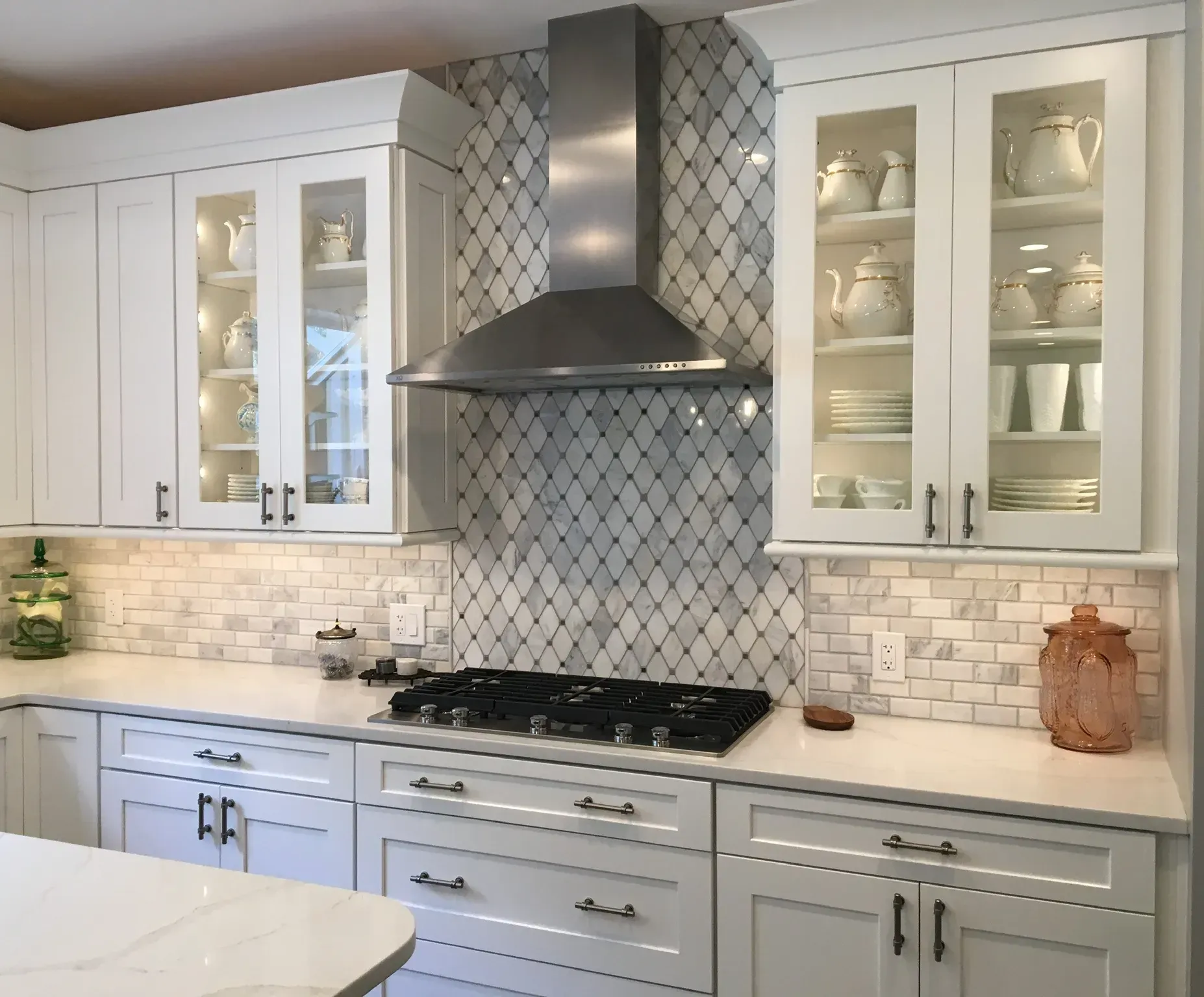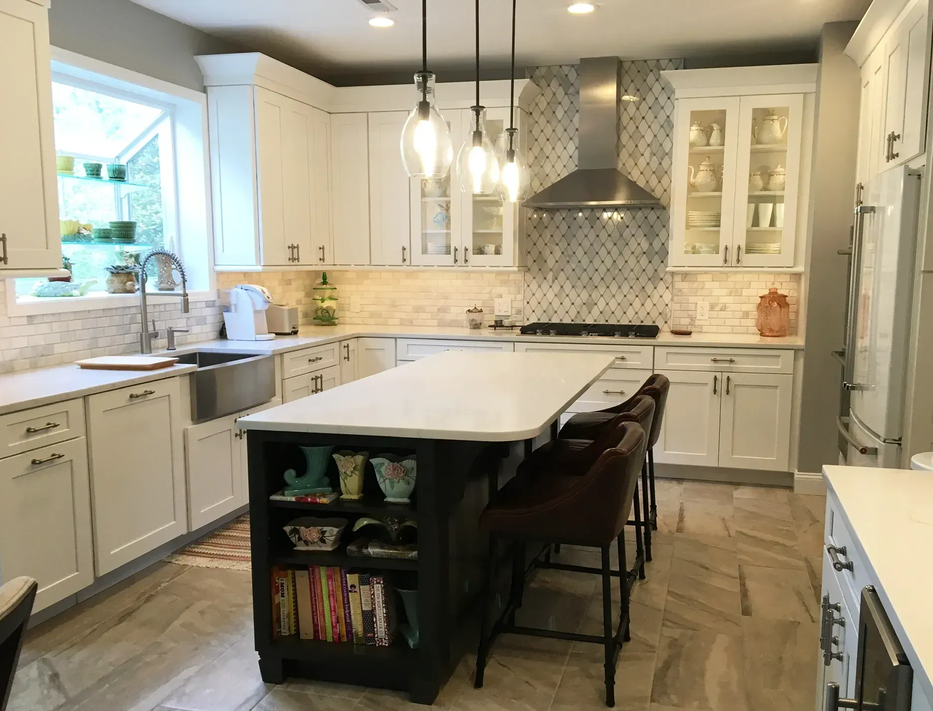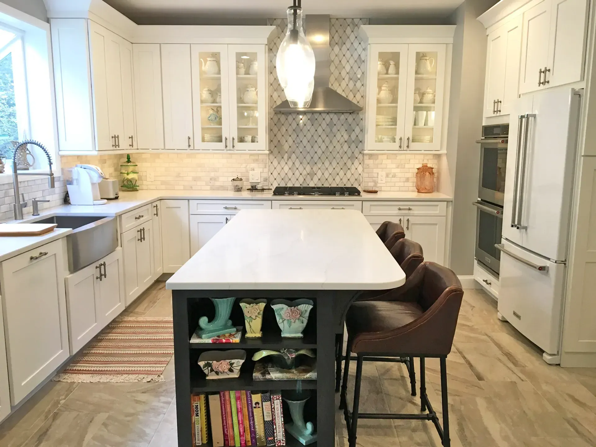 This kitchen in Richboro was remodeled with Cherry Waypoint cabinets in Linen and Cherry Waypoint cabinets in slate for the island, apron style sink, Quartz countertop, marble backsplash and tile floor.