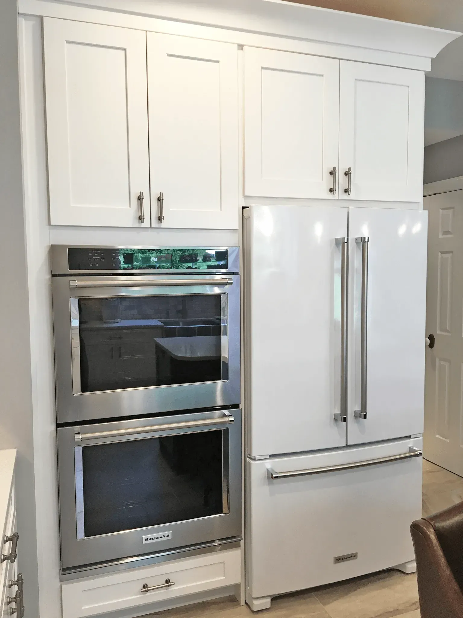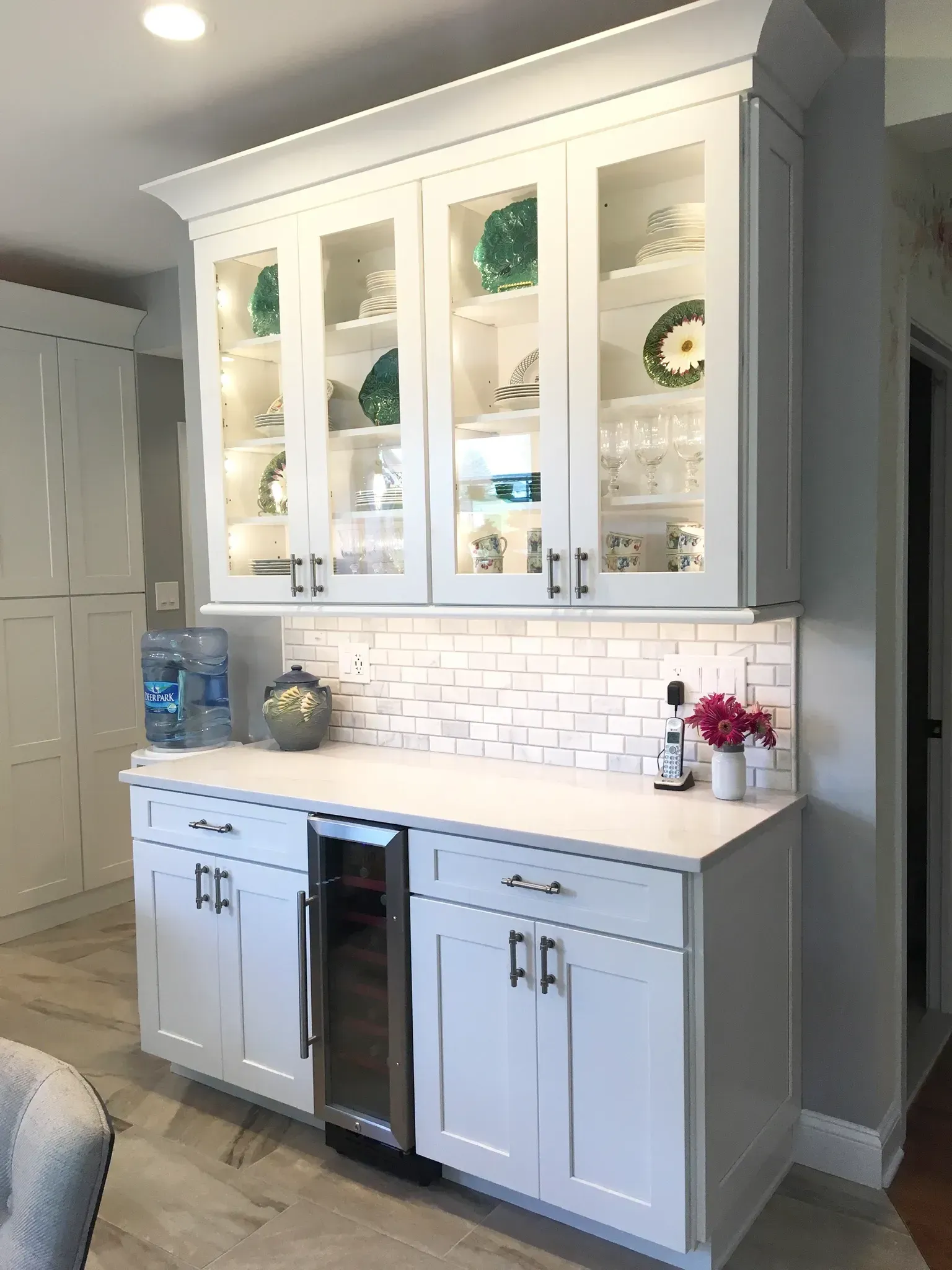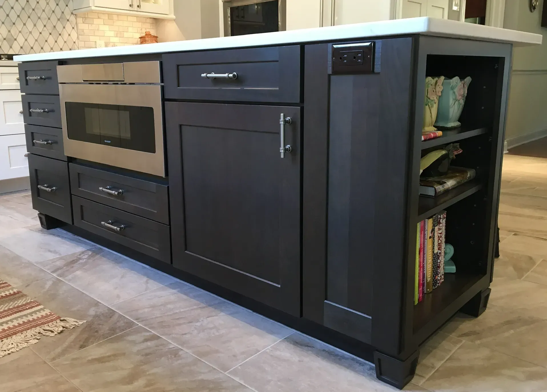 This kitchen in Richboro was remodeled with Cherry Waypoint cabinets in Linen and Cherry Waypoint cabinets in slate for the island, apron style sink, Quartz countertop, marble backsplash and tile floor.