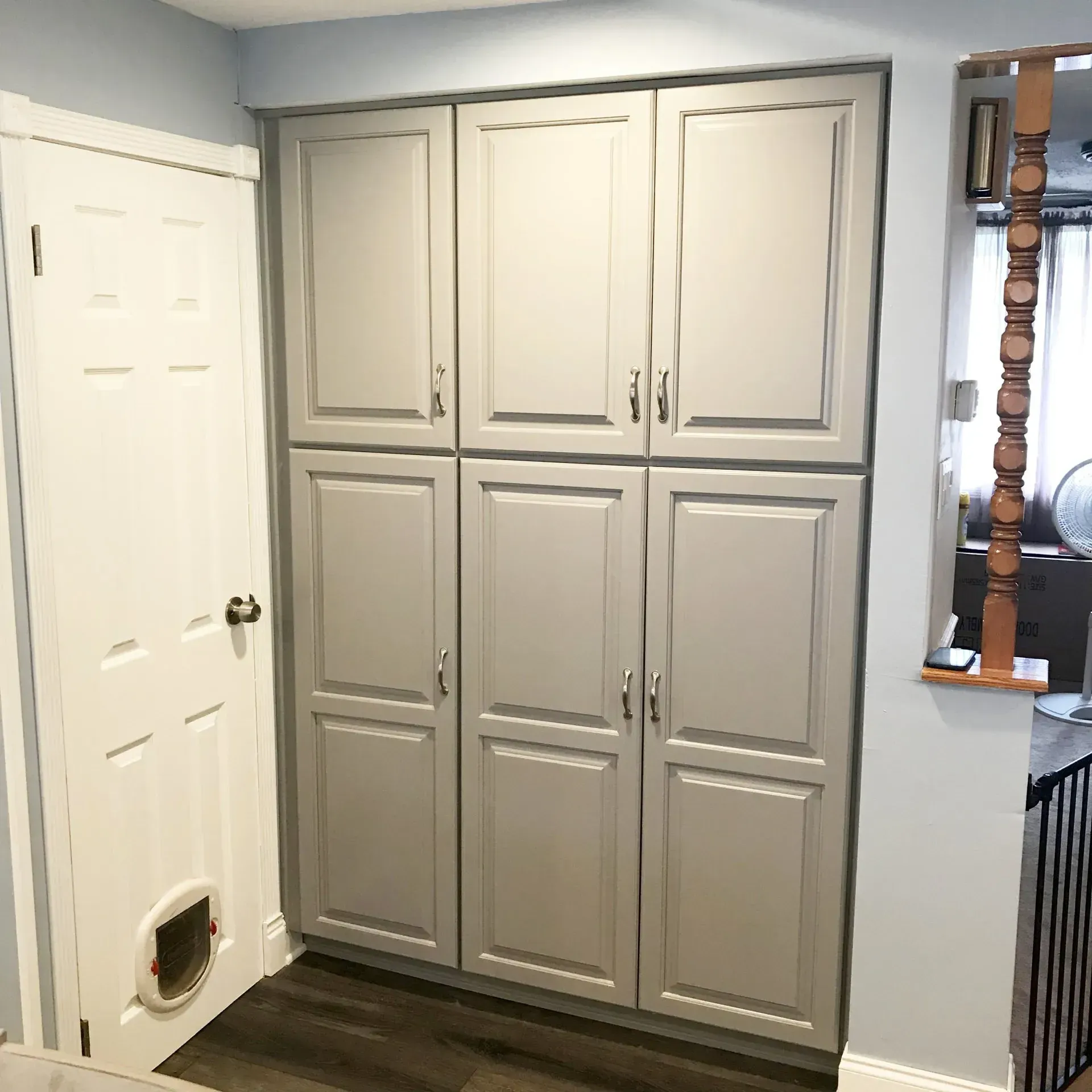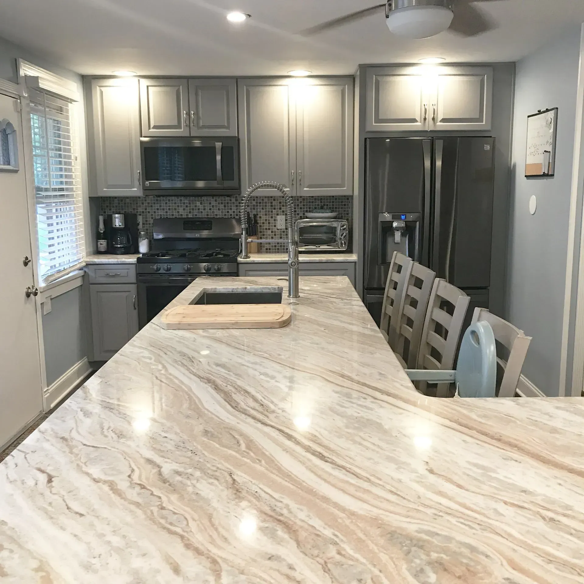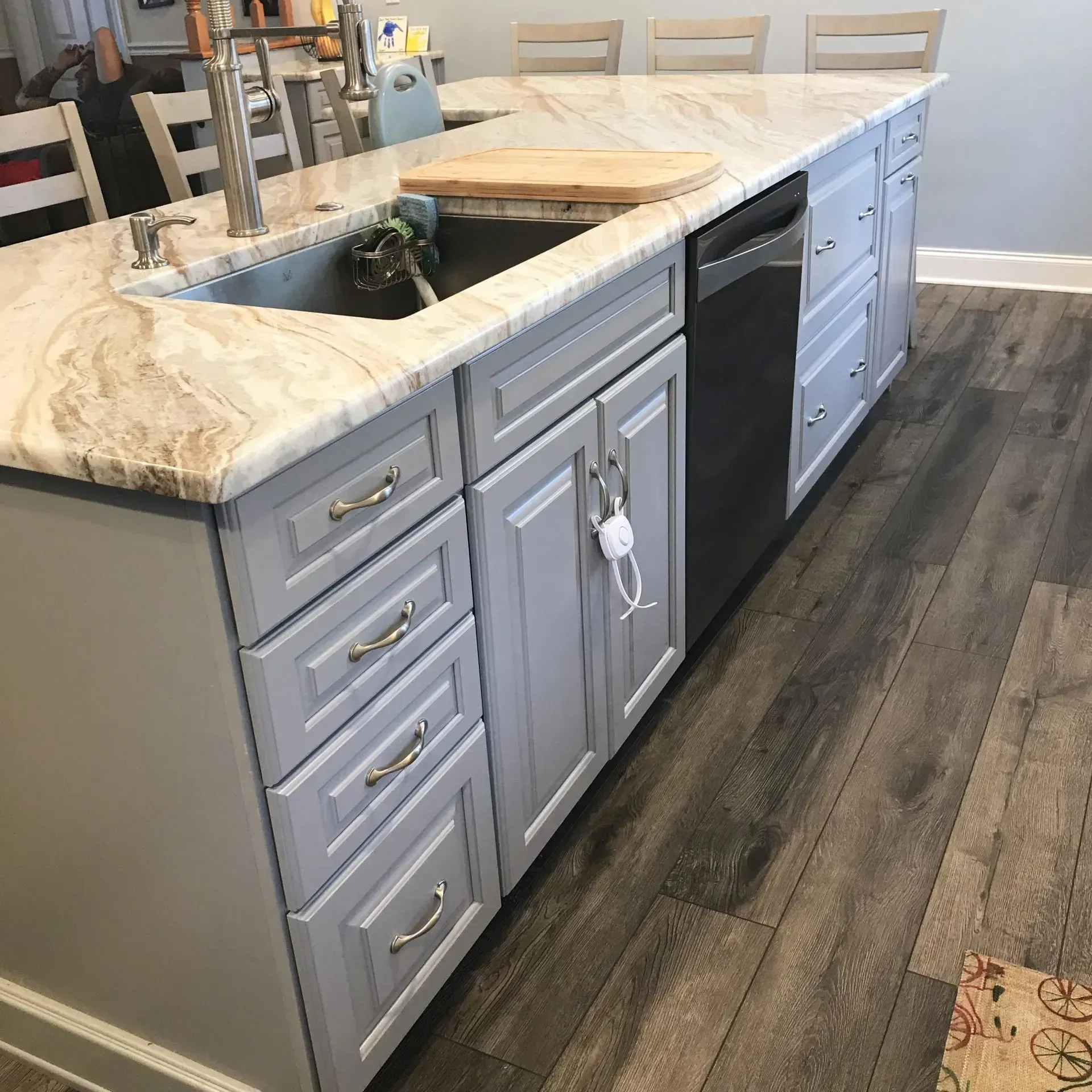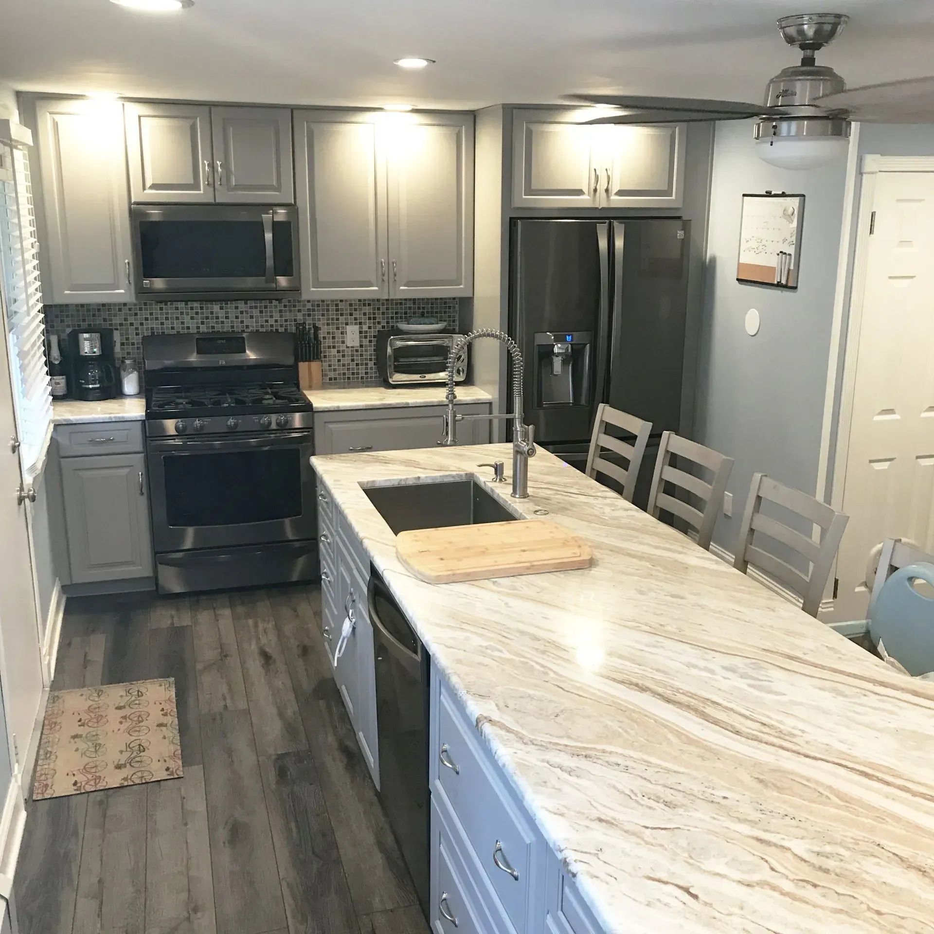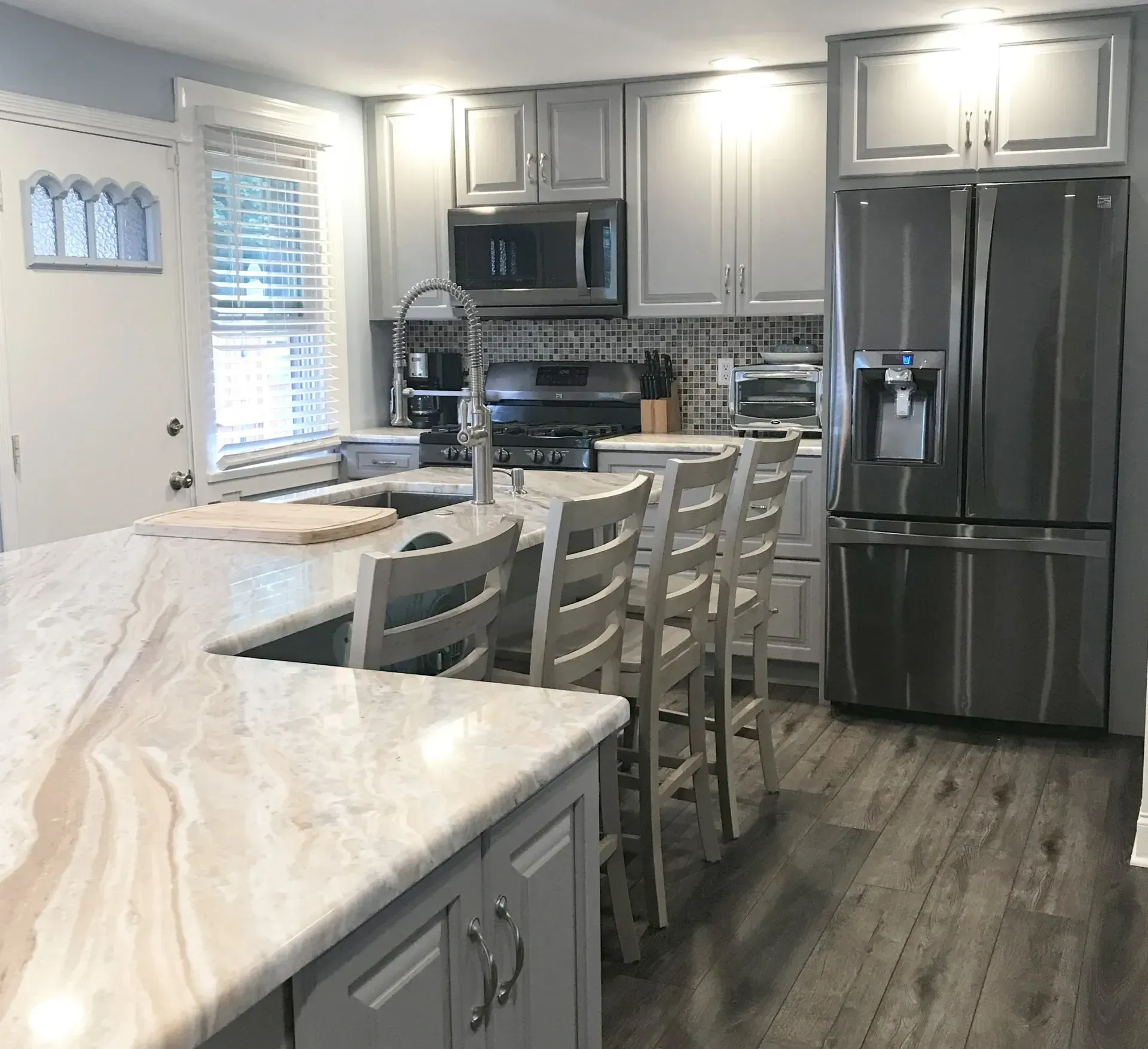This kitchen in Philadelphia, PA was remodeled with Waypoint cabinets, new dual purpose island with plenty of seating and storage space, new pantry, granite countertops, porcelain plank tile floors and new appliances.