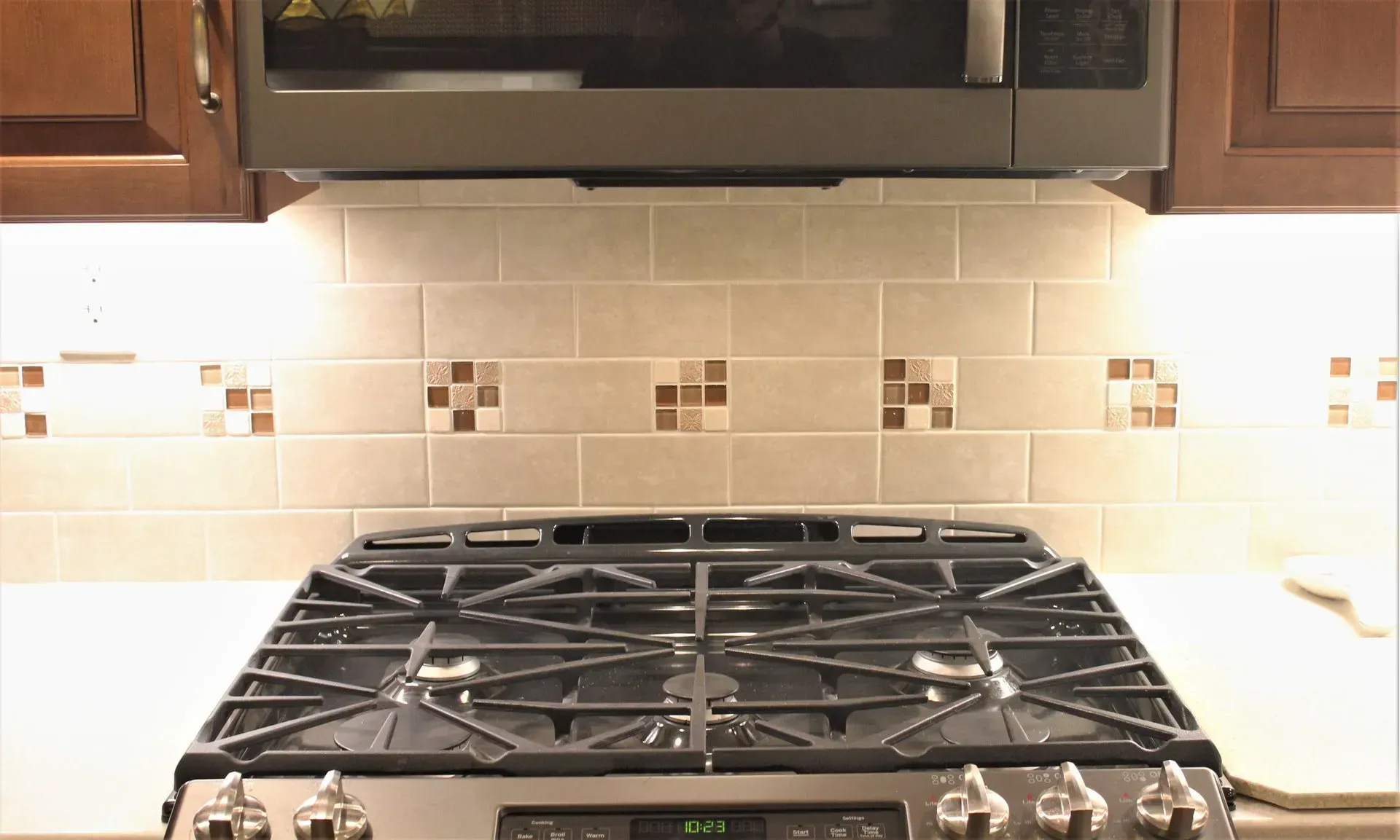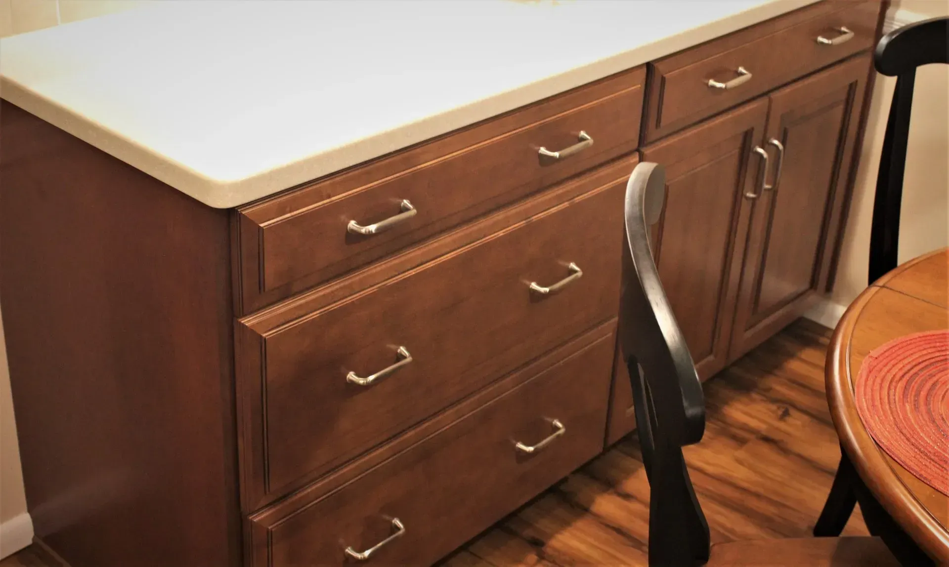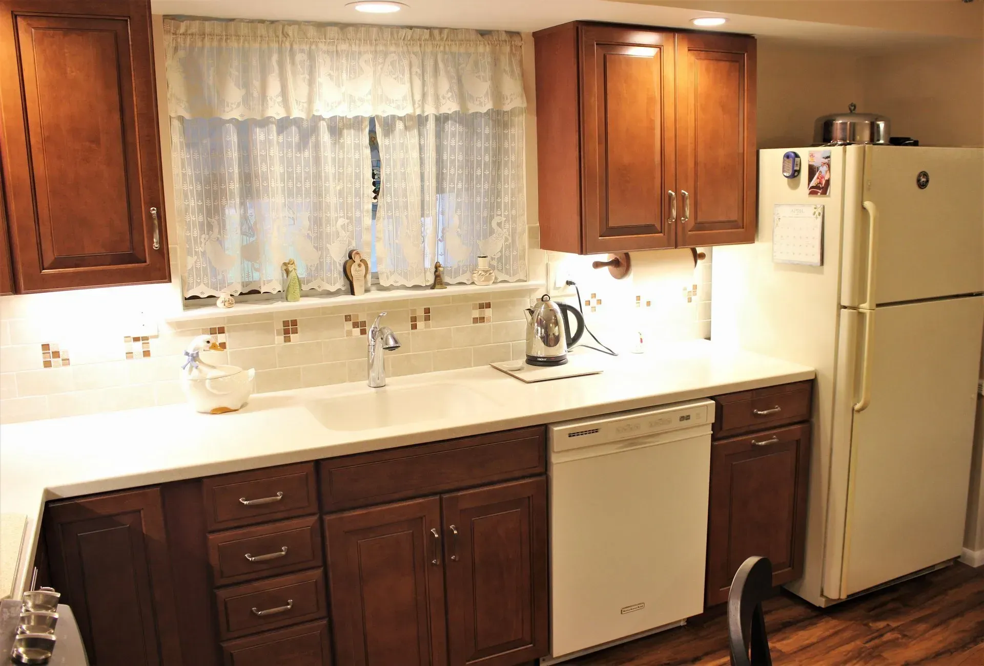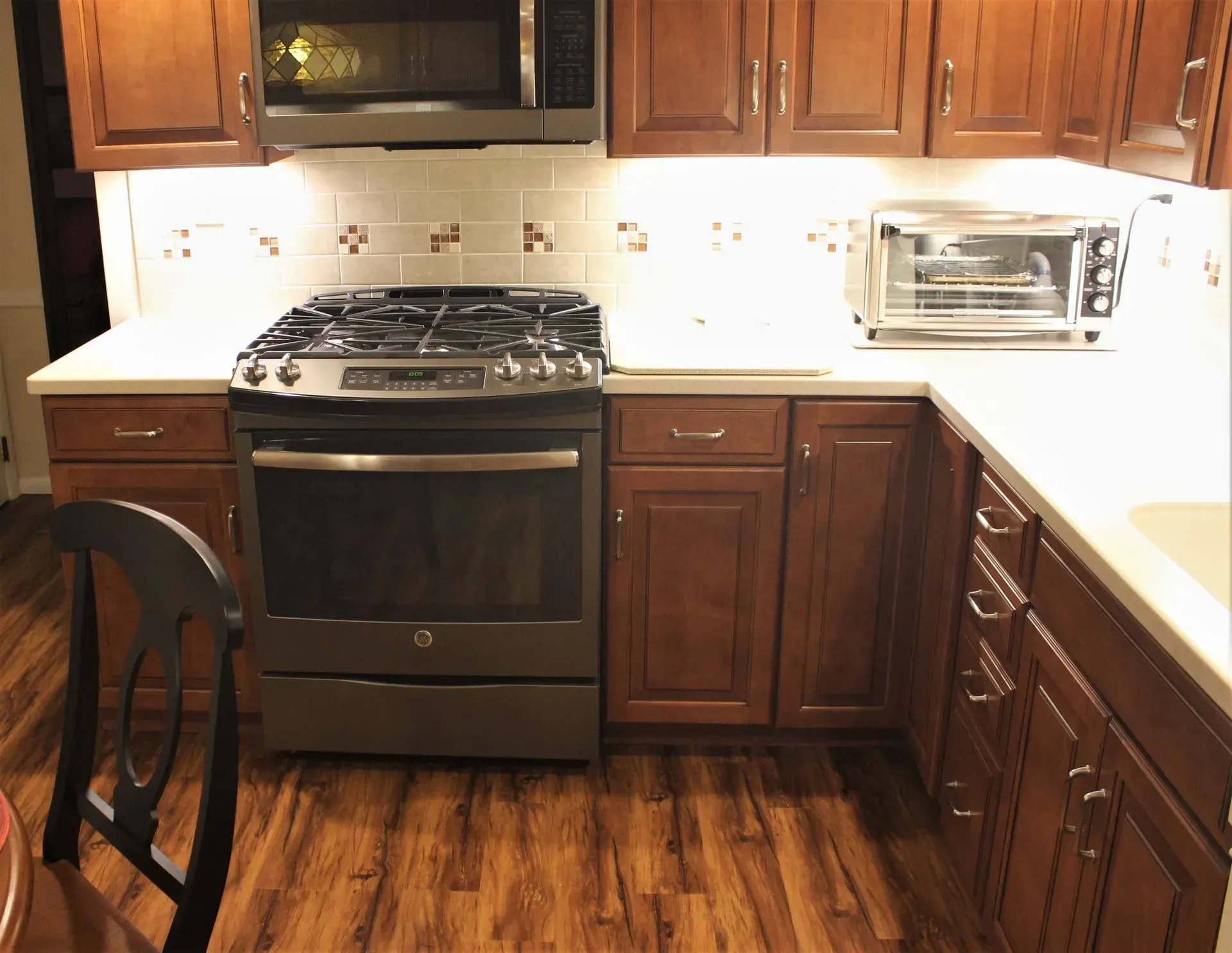 This Kitchen in Warminster, PA was updated with new Maple Waypoint cabinets in Auburn, tile backsplash, laminate floors and Corian countertops.