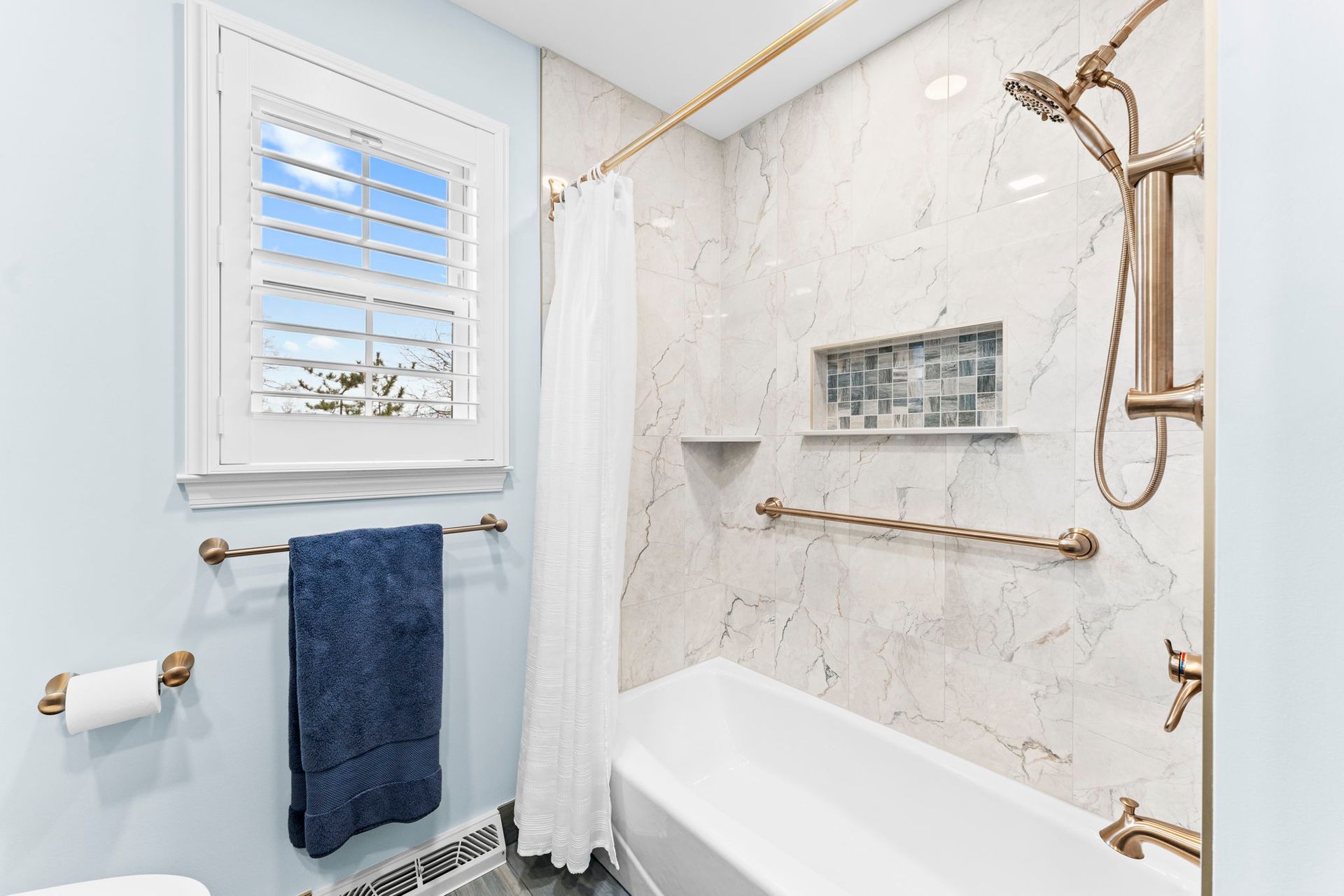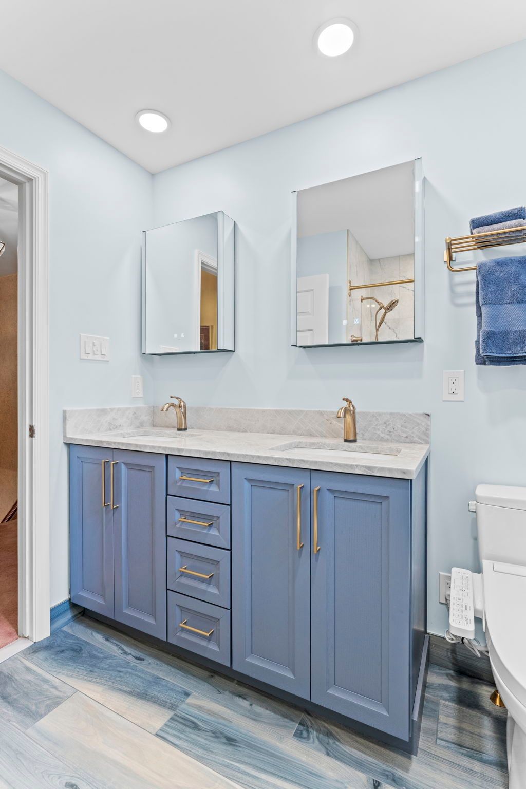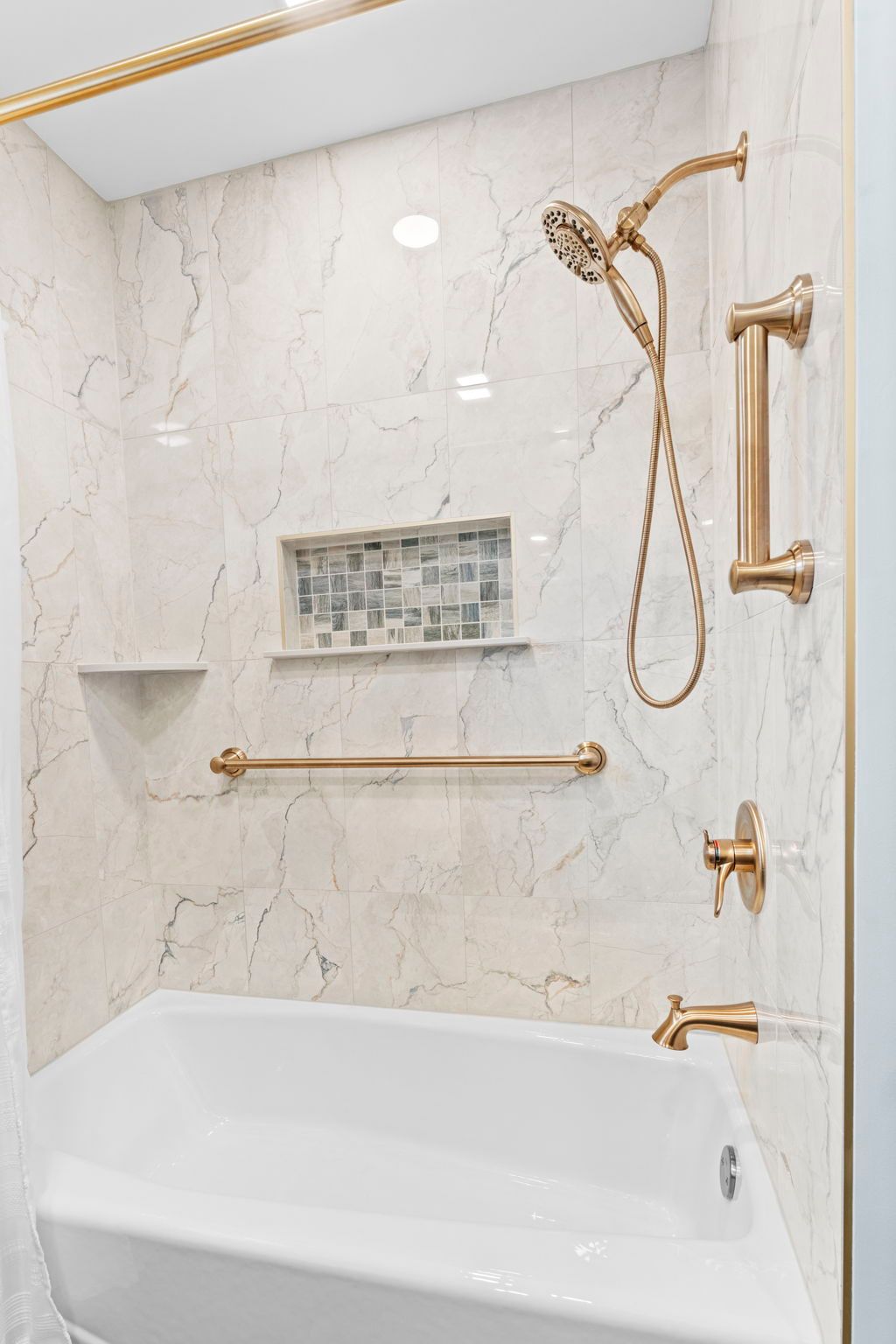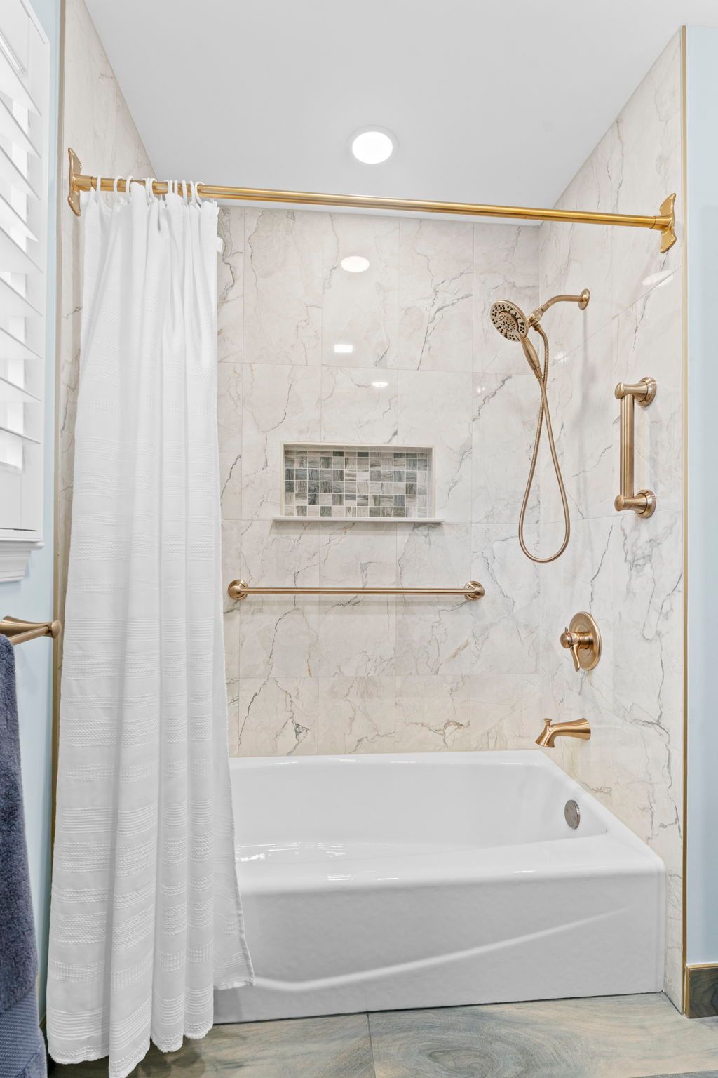 This blue-tifal hall bathroom makes the most of a small space. The vanity is Wellborn oak wood in the painted cape blue finish; it compliments the vanity top which is blue fusion quartzite. The bathtub is cast iron Kohler, with Happy Floors statik blend walls, and the niche is Happy Floors citrus series in polished ocean. The floor tile is from Tile Bar, it's Brazilian tiger blue. Lighting includes high hats over the vanity and in the tub area. The hardware is mostly Delta gold, a classy combination when paired with cool tones.