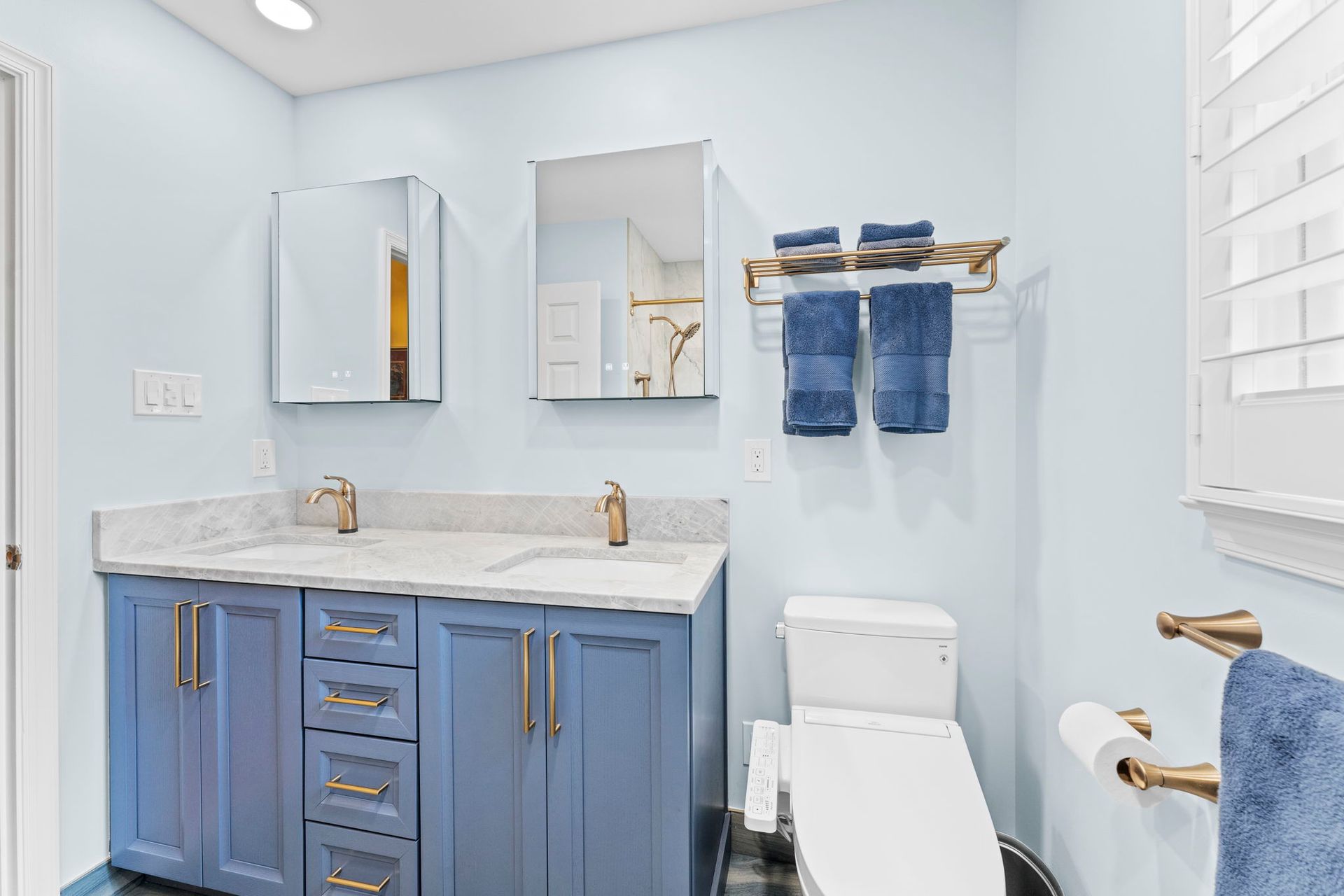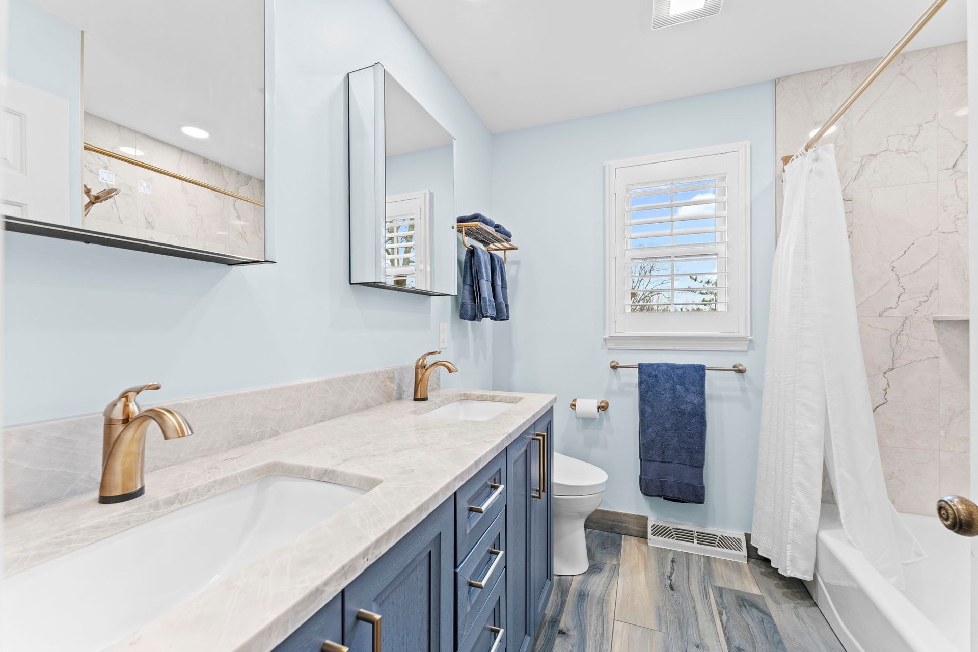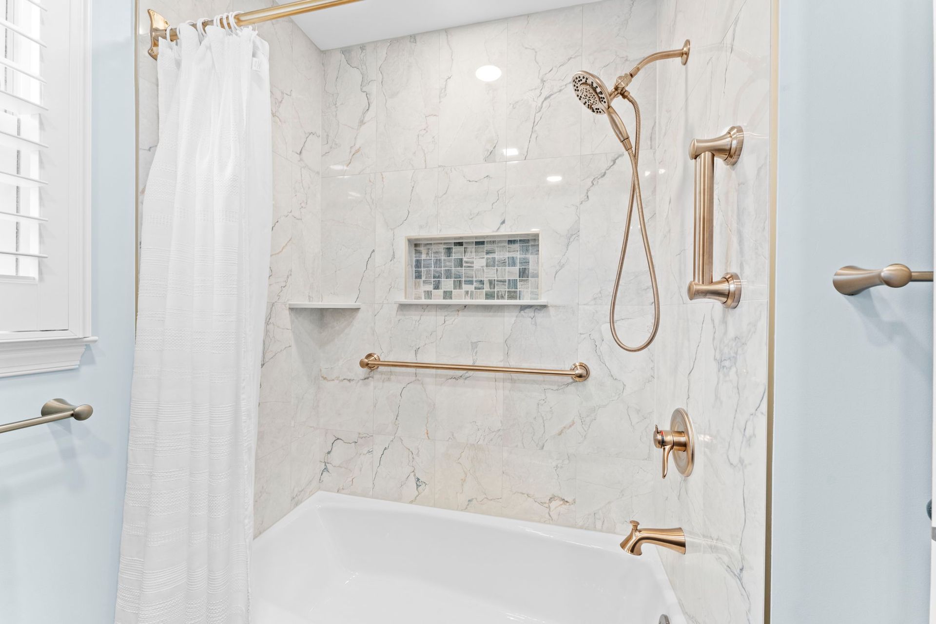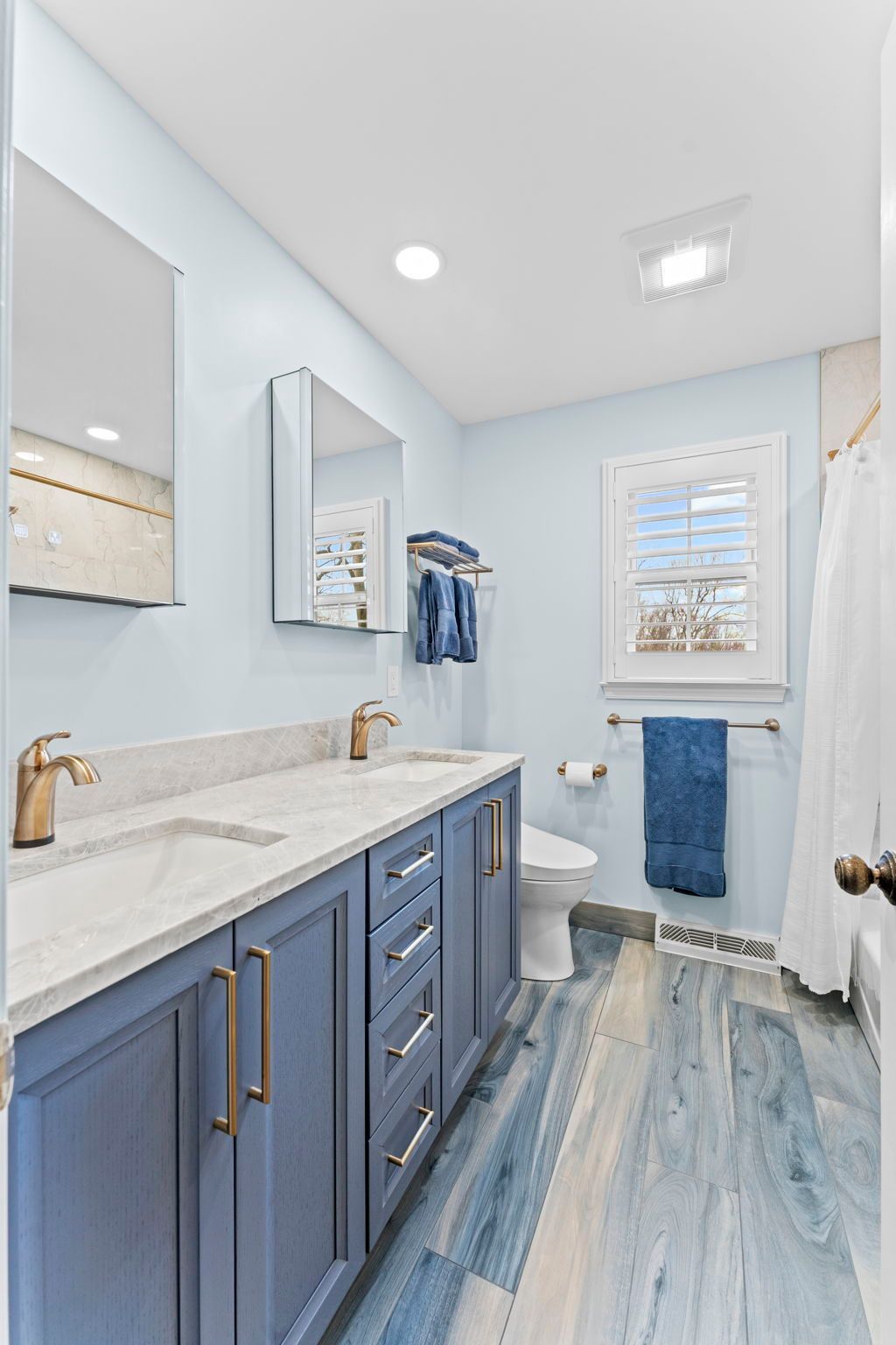 This blue-tifal hall bathroom makes the most of a small space. The vanity is Wellborn oak wood in the painted cape blue finish; it compliments the vanity top which is blue fusion quartzite. The bathtub is cast iron Kohler, with Happy Floors statik blend walls, and the niche is Happy Floors citrus series in polished ocean. The floor tile is from Tile Bar, it's Brazilian tiger blue. Lighting includes high hats over the vanity and in the tub area. The hardware is mostly Delta gold, a classy combination when paired with cool tones.