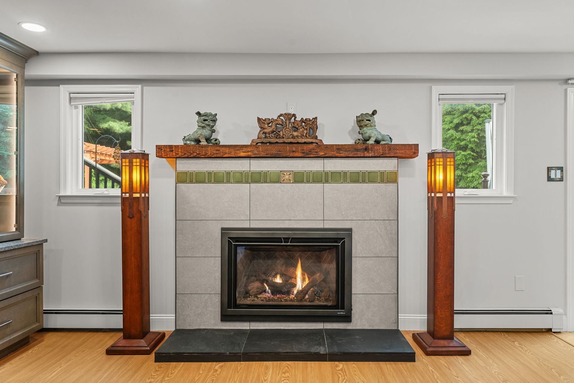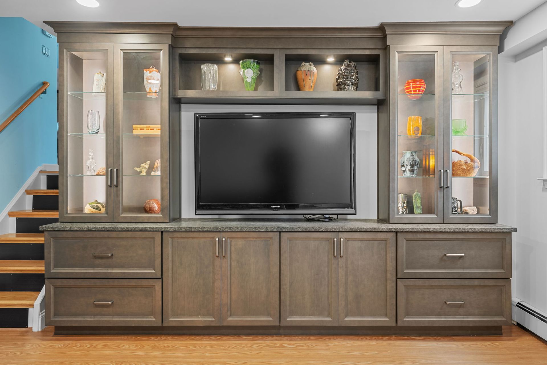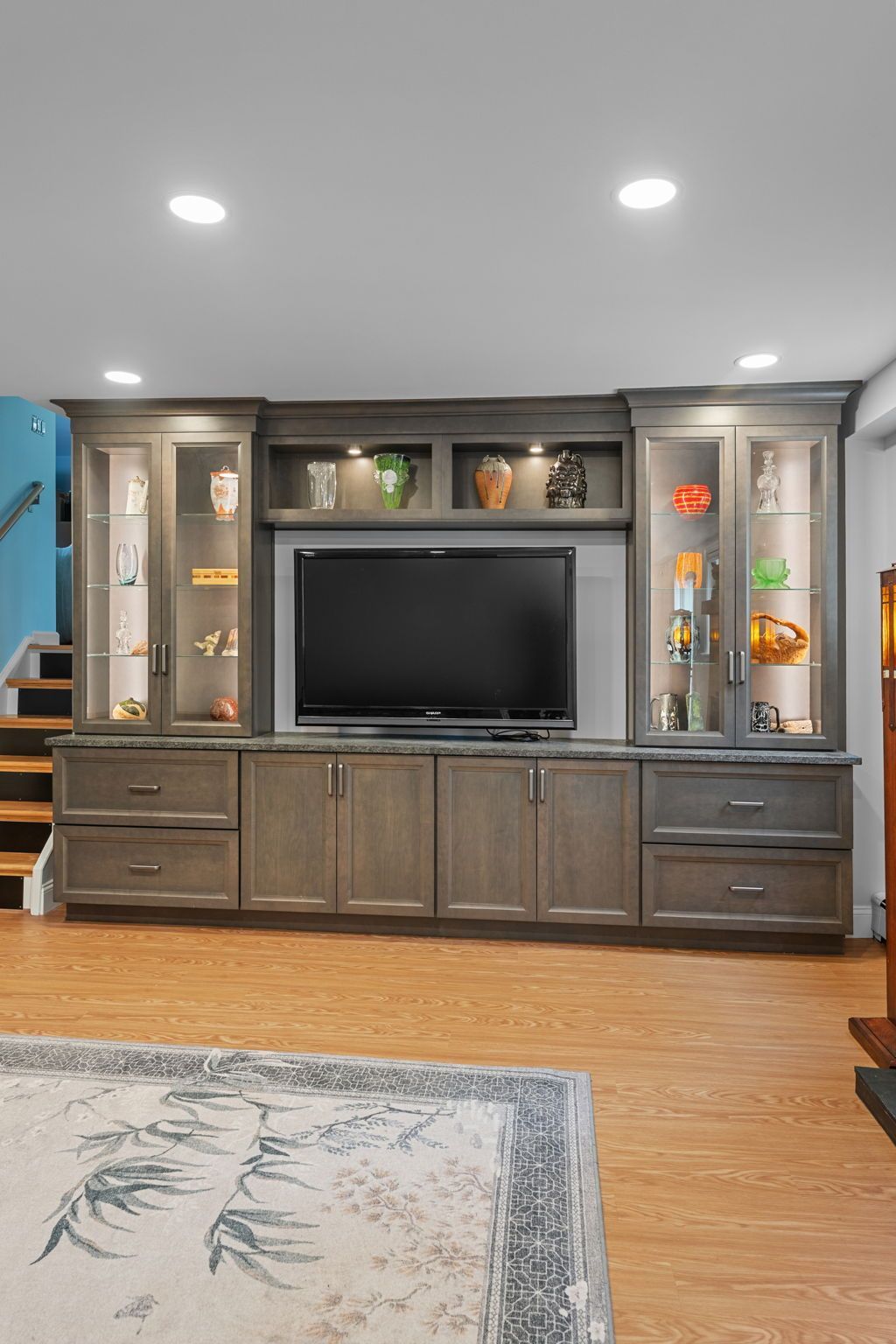 This family room is another area in the same house we did the basement bar. The entertainment center is made out of Wellborn cabinets, maple wood in the stain espresso. Recessed lighting with dimming options in glass front cabinets to highlight decor. The fireplace is tiled with green closer to top for an exotic feel.