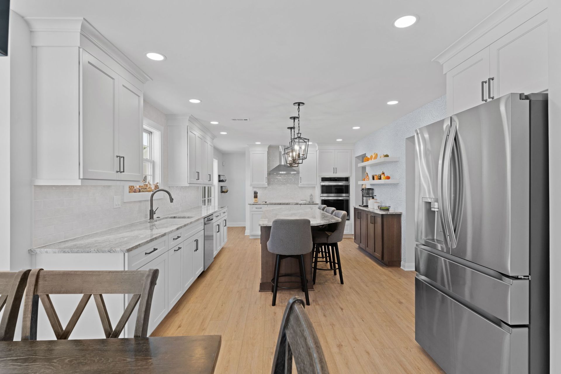 - Demolition: removal of existing cabinetry, appliances, and the wall between the kitchen and dining room.